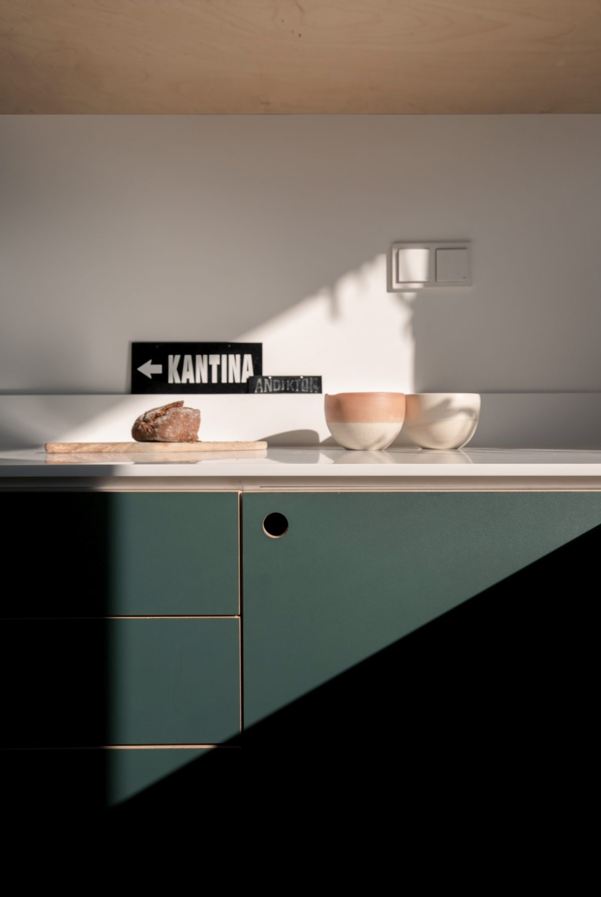 Οι επιφάνειες από κόντρα πλακέ αναπτύσσονται οριζόντια σε όλο το διαμέρισμα, σχηματίζοντας μια θερμή ζώνη ανάμεσα στην τραχιά, σκυροδετημένη οροφή και το νέο, ενιαίο δάπεδο. Στην κουζίνα, η ζώνη αυτή ενισχύεται με έντονες χρωματικές επιφάνειες στα ντουλάπια, οι οποίες ορίζουν διακριτικά τη λειτουργία του χώρου, χωρίς να διαταράσσουν τη συνολική συνοχή της σύνθεσης.
