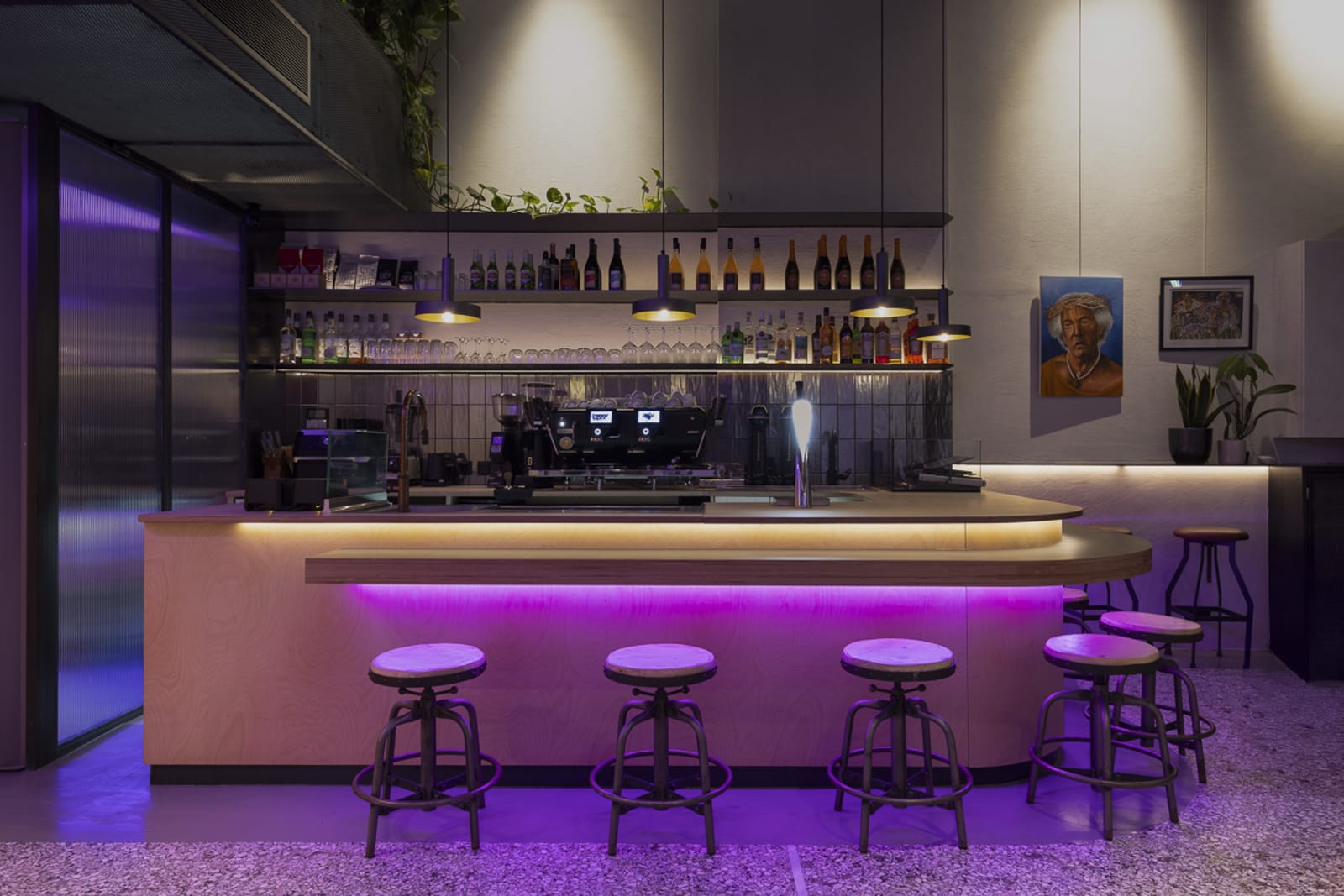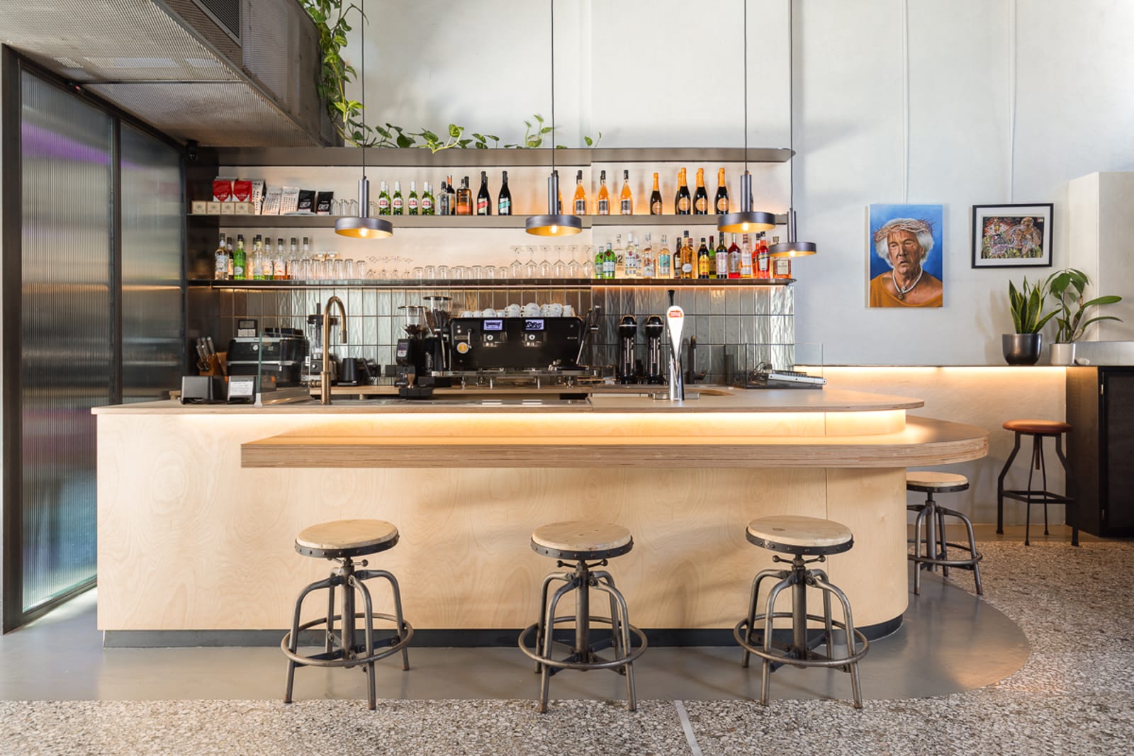For this reason, we chose a single bar height (lower than standard) that accommodates all users, so that everyone sits at the same level and maintains direct visual contact with the staff behind the bar.