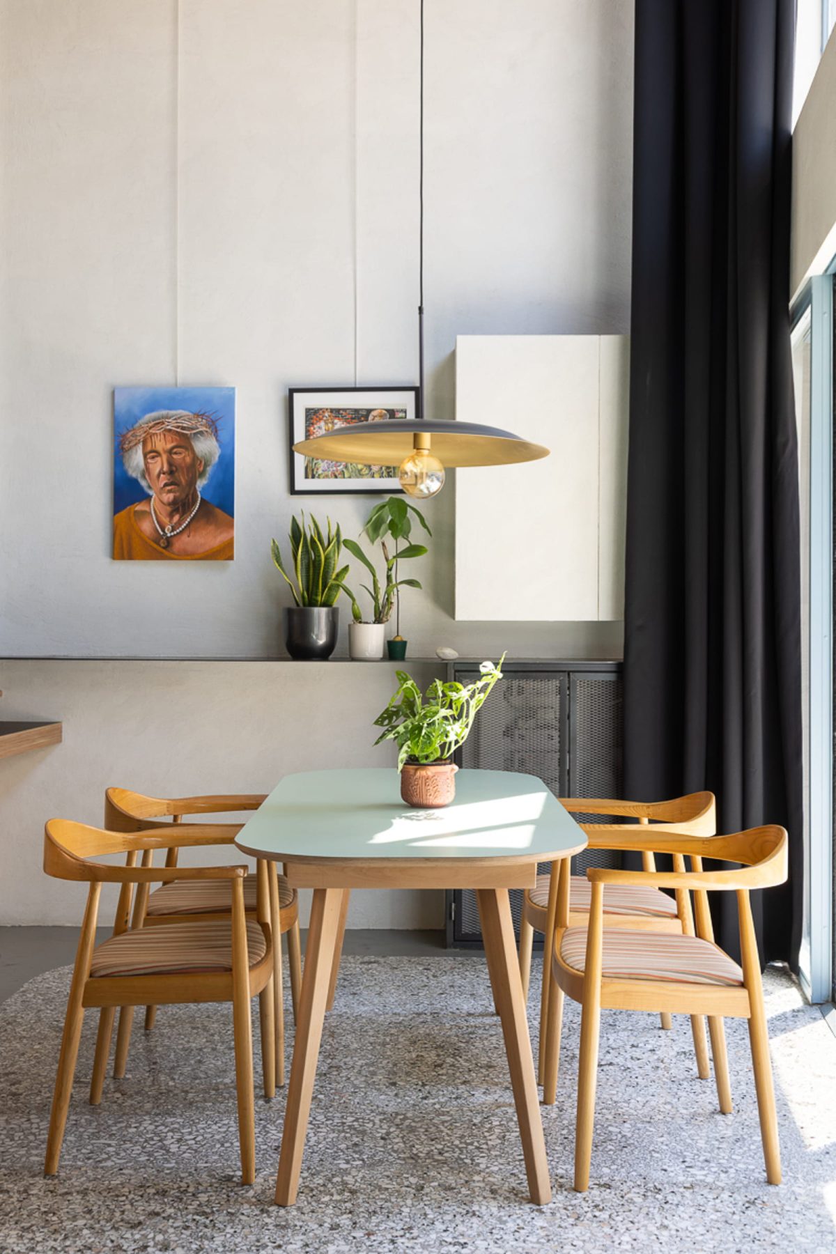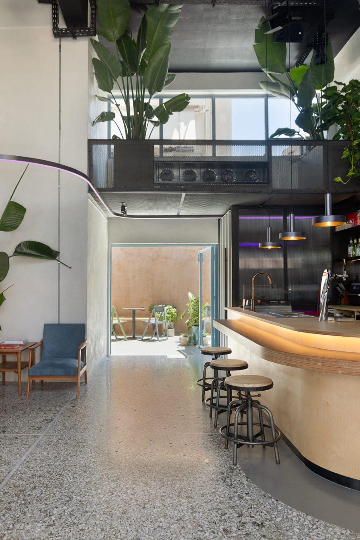 Ιn terms of material selection, the design focused on restoring and enhancing the space’s industrial character. Tiles that had been added during a previous renovation were removed, revealing the original terrazzo flooring beneath. For the new constructions, plywood, raw metal, and bent metal sheets were chosen.