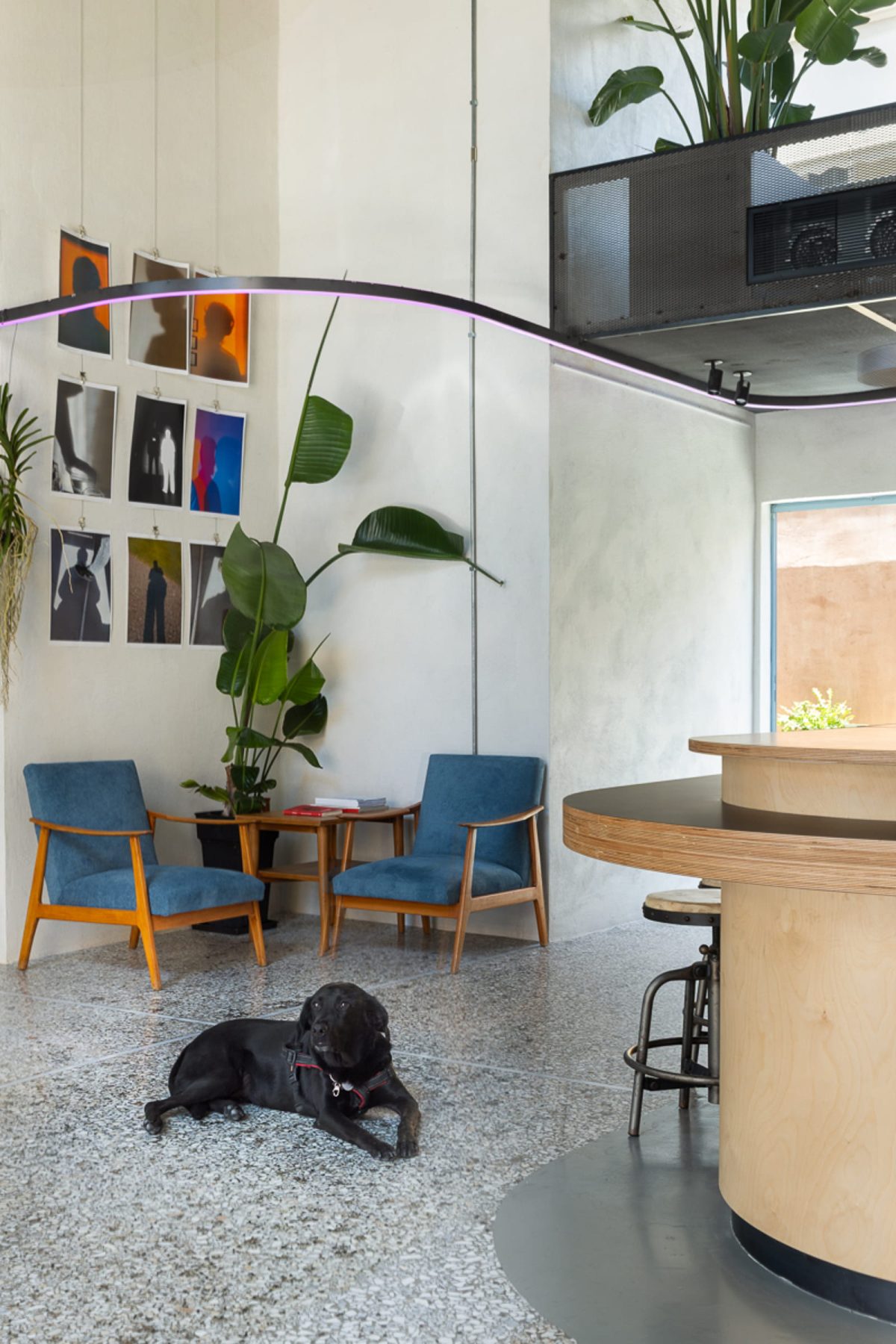The design scope included the façade, interior, and courtyard. A restrained, minimalist approach was adopted, integrating industrial elements throughout.