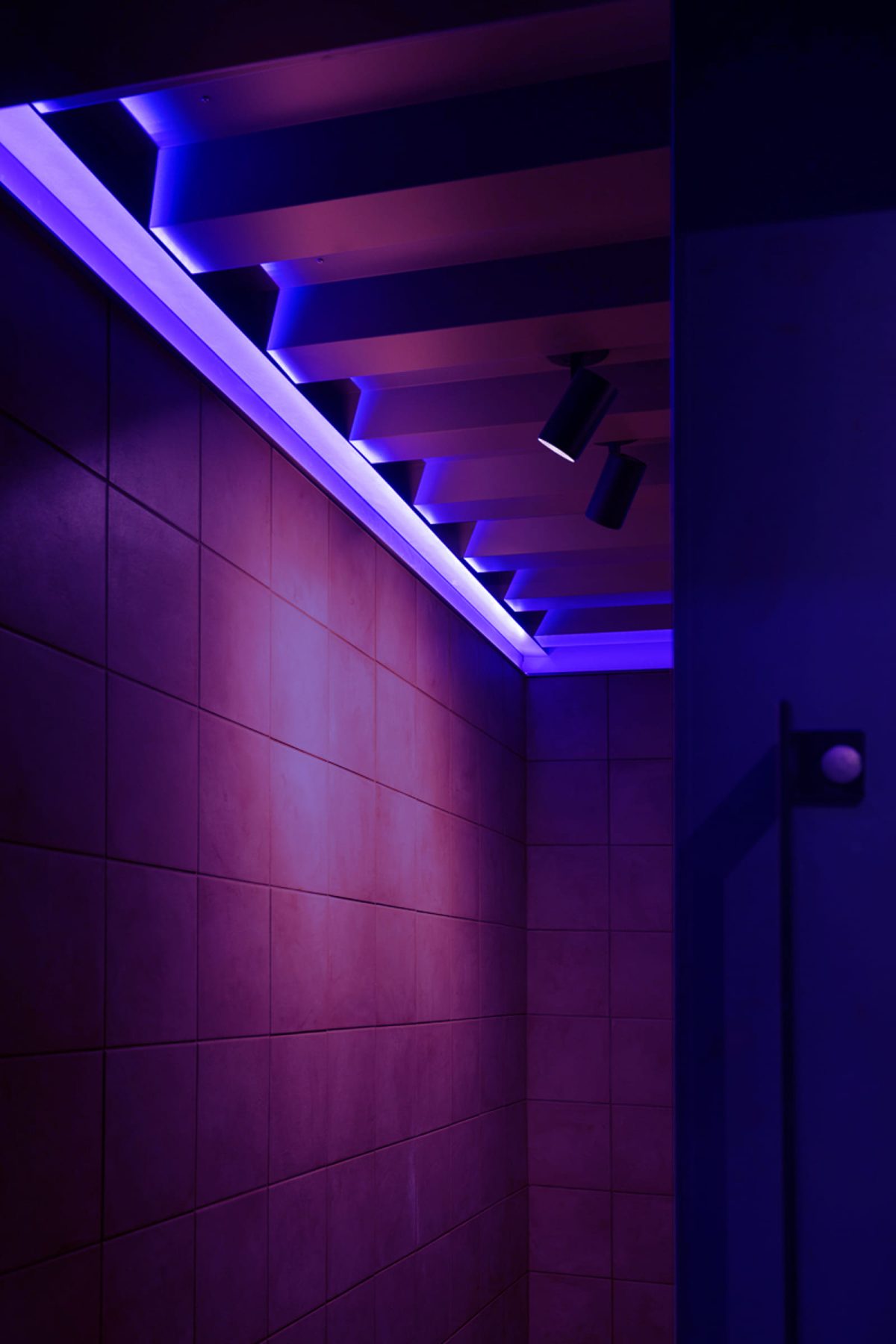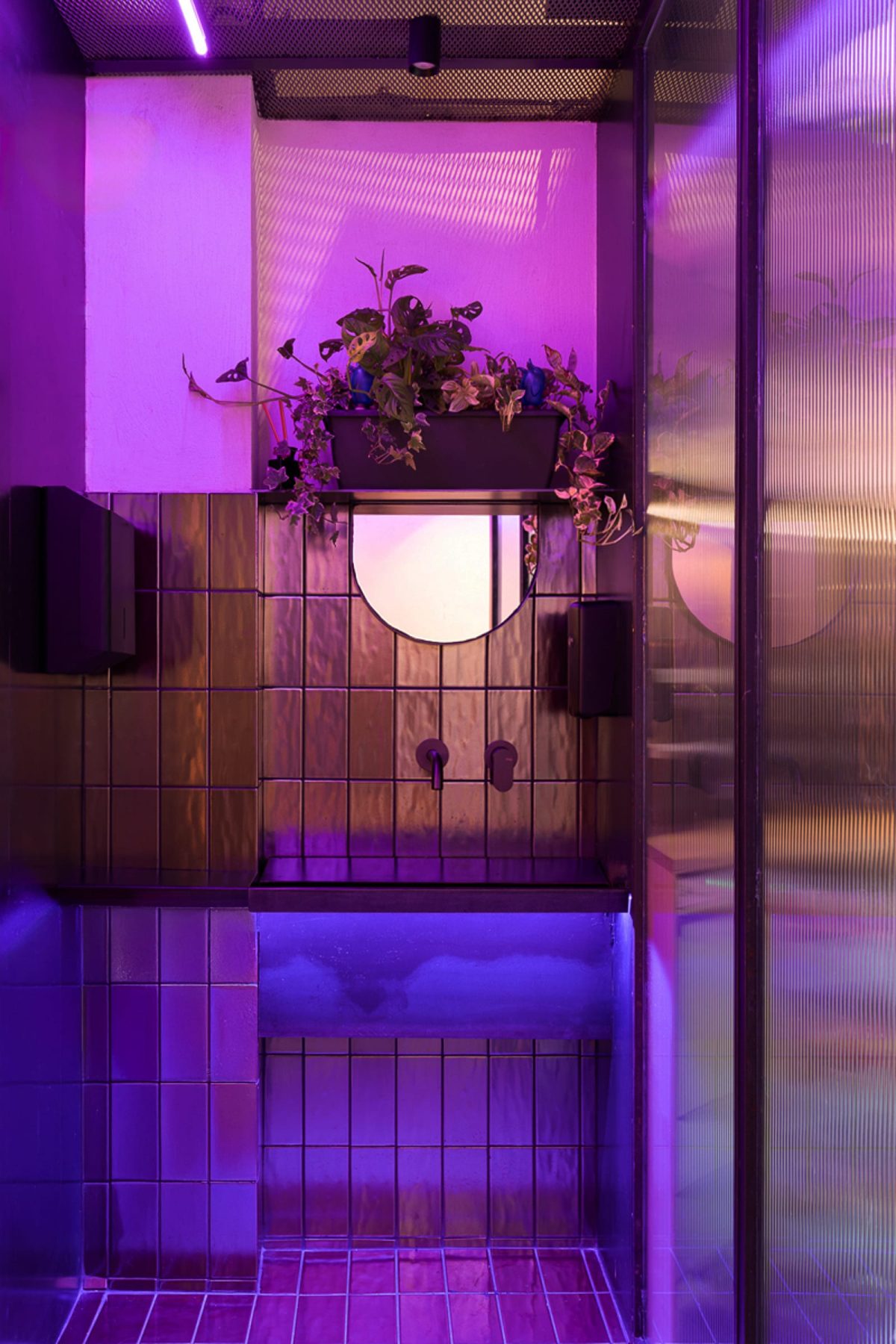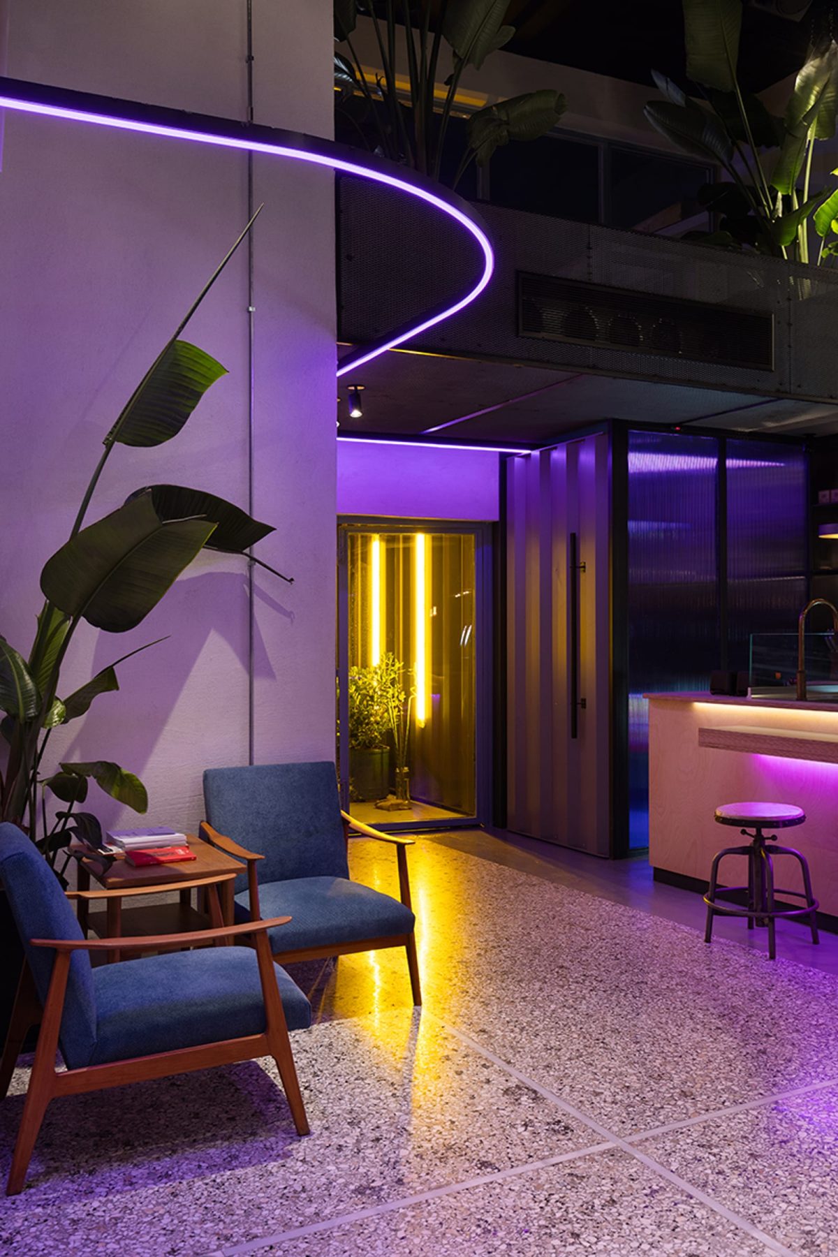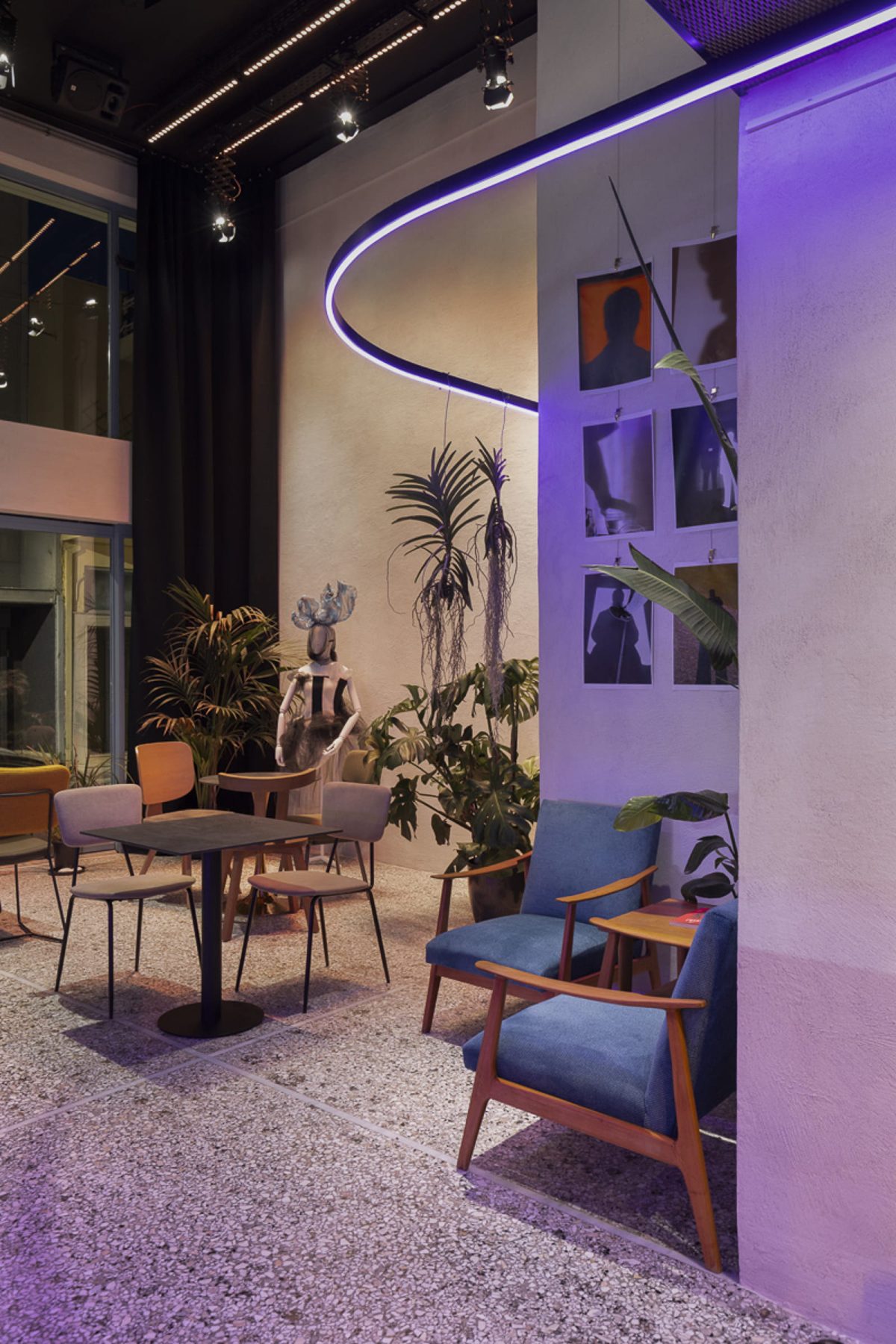 Οι ευθειογενείς καμπύλες επικρατούν σε όλα τα επίπεδα του χώρου, από τον σχεδιασμό της μπάρας στο επίπεδο του εδάφους μέχρι τον φωτισμό νέον και τις διώροφου ύψους κουρτίνες στην οροφή.