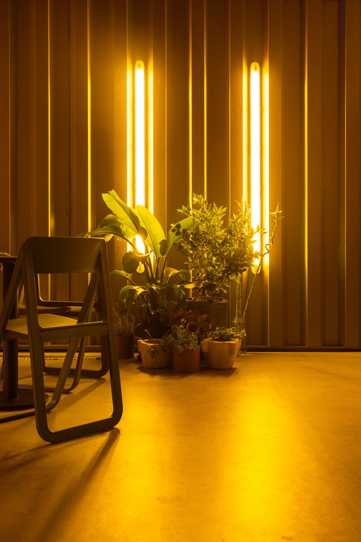 Ο εξωτερικός χώρος μεταλλάσσεται από έναν ήρεμο χώρο σε γήινα χρώματα και φυτά το πρωί, σε έναν ζωντανό νυχτερινό χώρο συνάντησης.