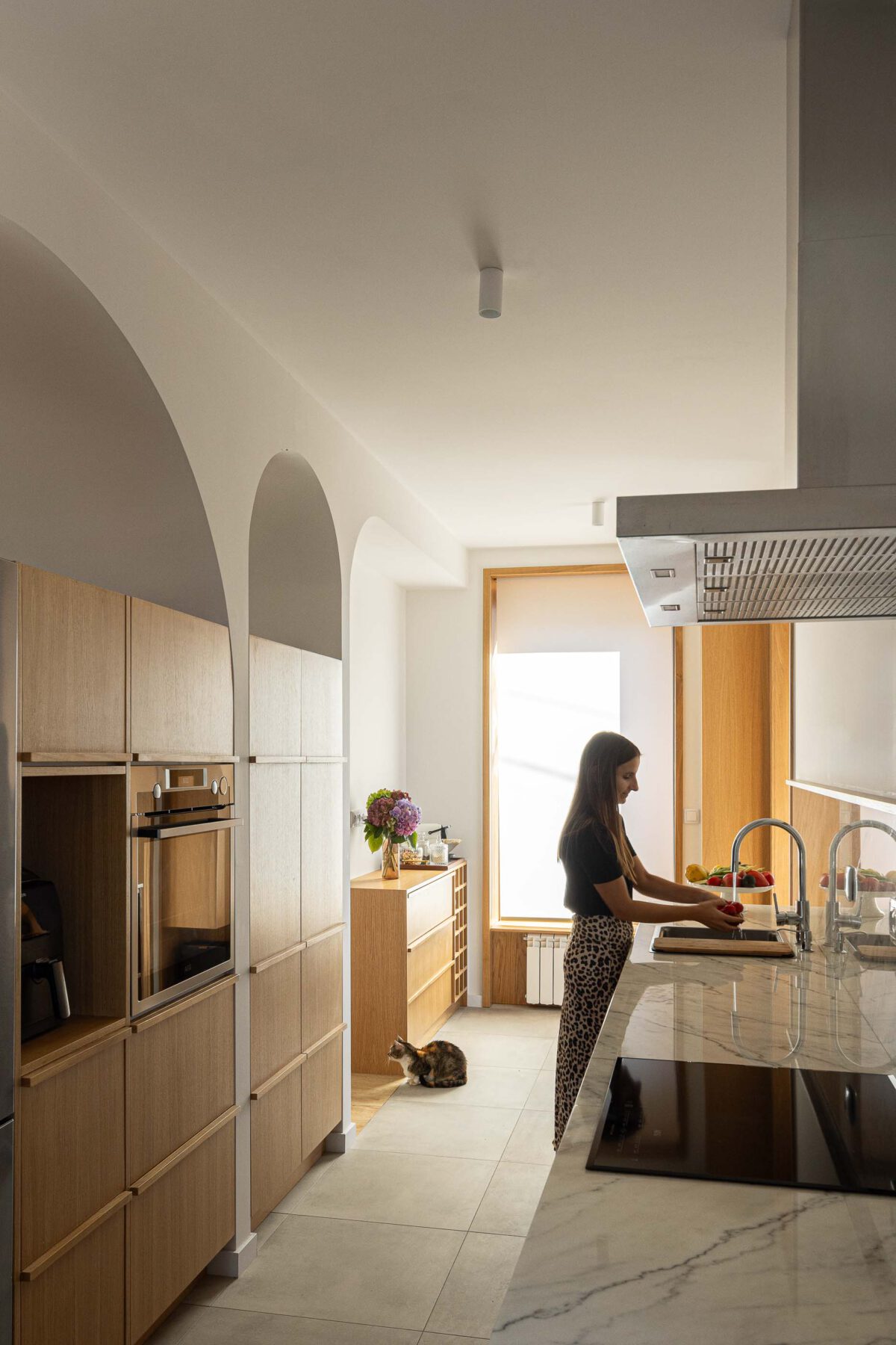 The connection between them is made by a concrete staircase covered in wood. It is a suspended and decorative element, which strictly matches the metrics imposed by the arches. It starts and arrives inside the arches.