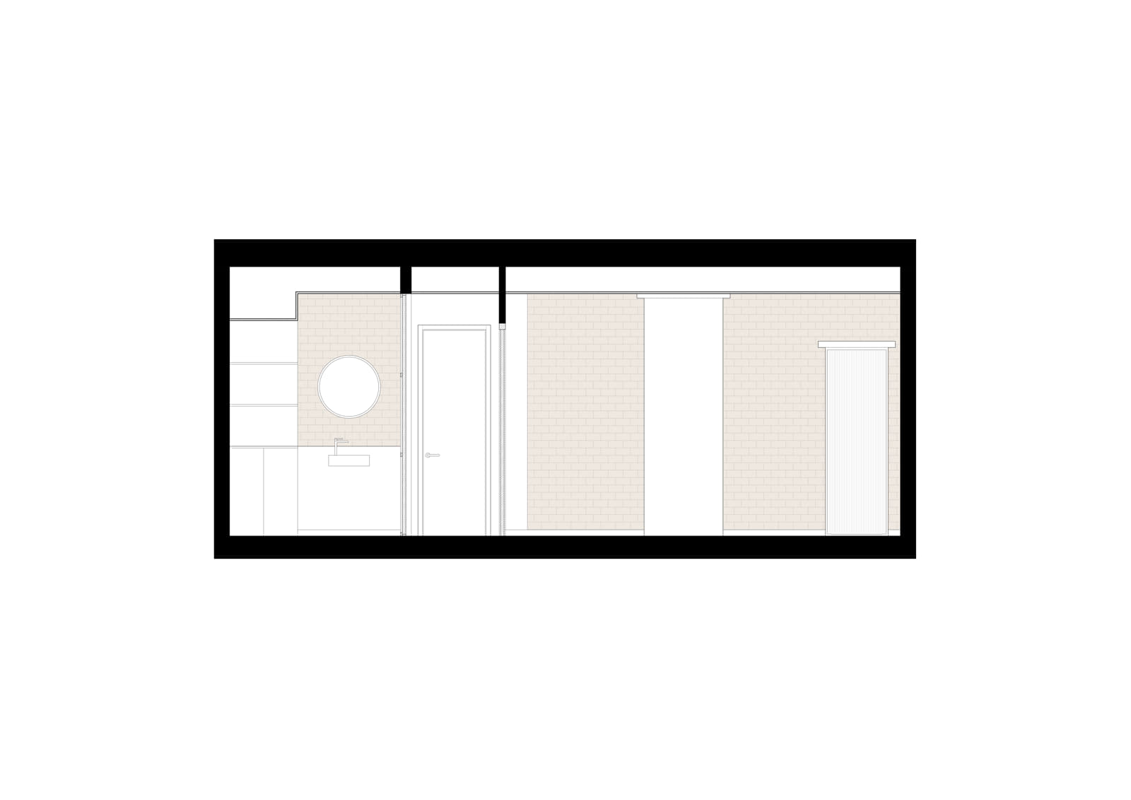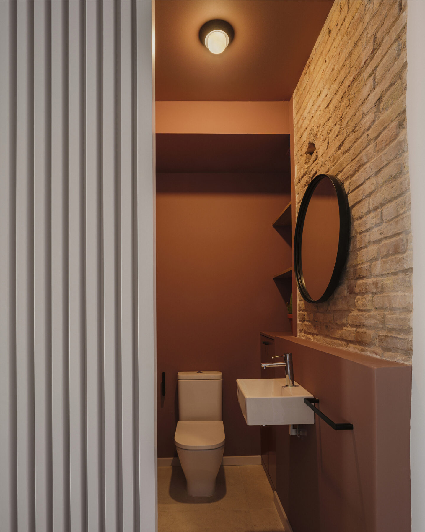 Additionally, the day area features a clever permeable paneling of lacquered wooden slats that hides a storage room for surfboards and a small bathroom inspired by Cala Rotja in Menorca. The private area of the house, consisting of an office and a bedroom with an en-suite bathroom and walk-in closet, retains the old reddish brick load-bearing wall, whose original openings connect the walk-in closet with the bedroom and bathroom.