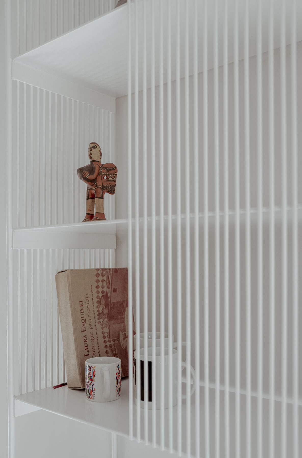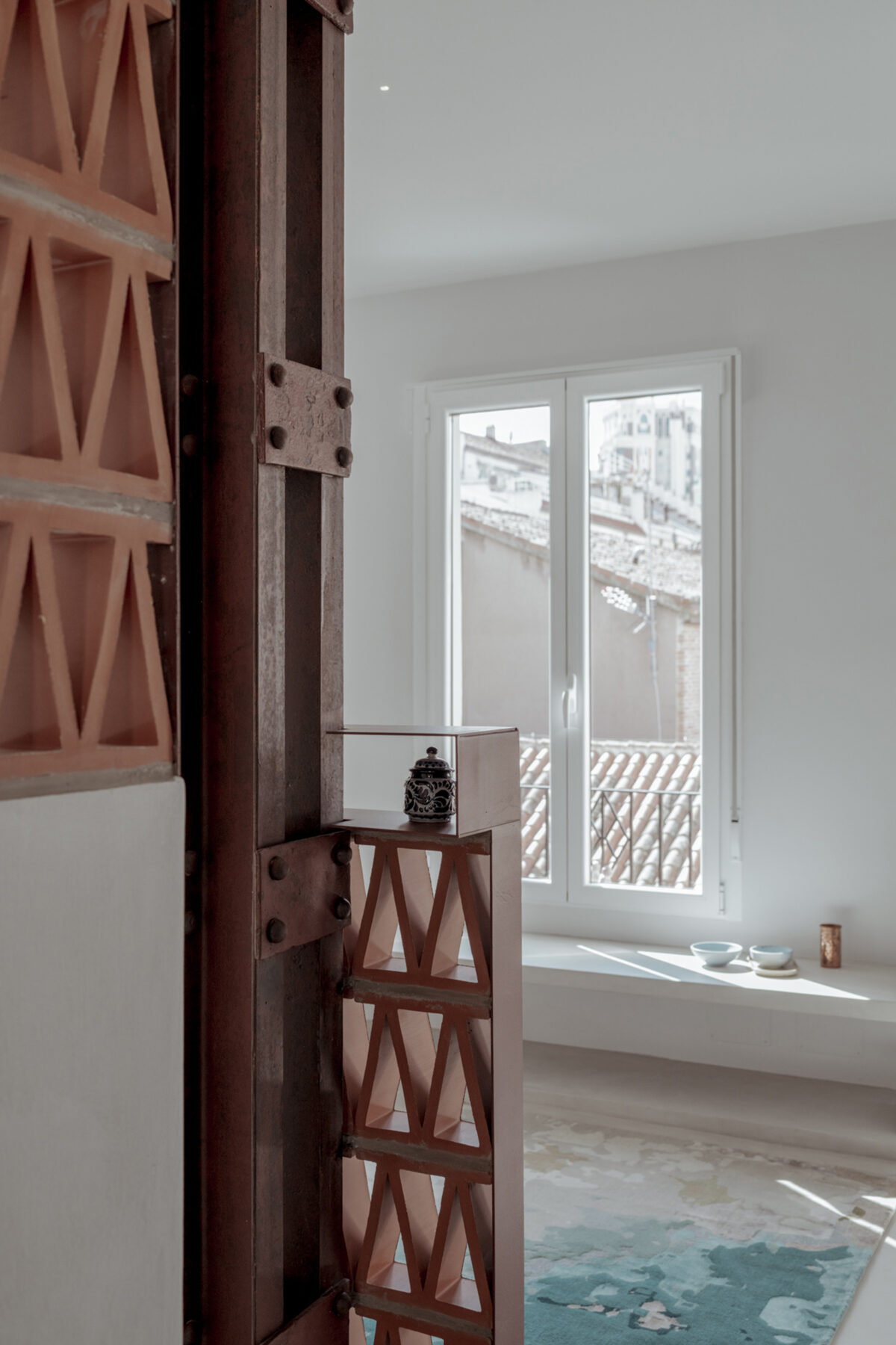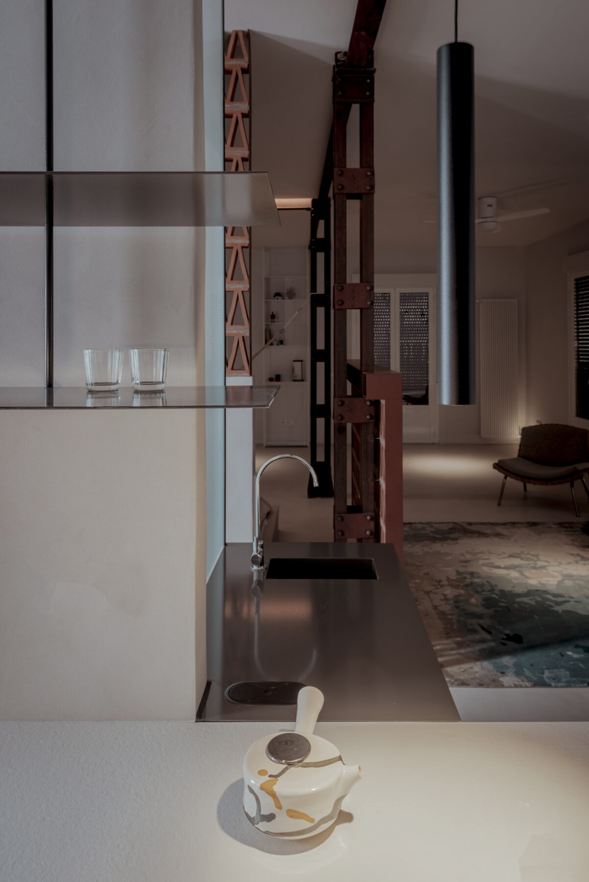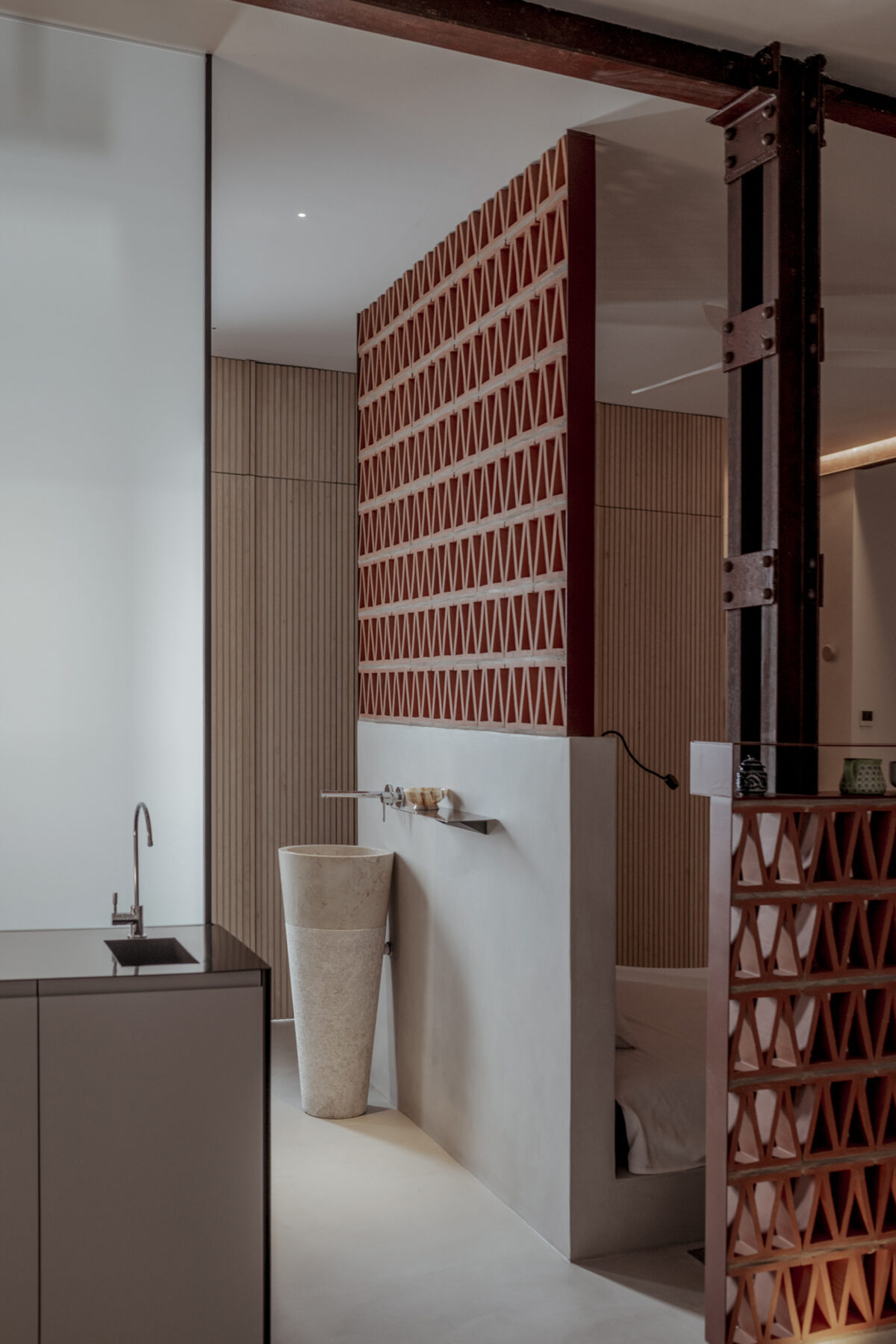 The minimum number of partitions possible is built to maintain this spatial and lighting effect, working on the idea of filters and transparencies, which are provided by ceramic lattices, glass in different finishes, or furniture elements such as metal shelves, which help to differentiate environments, always within the same continuous space.