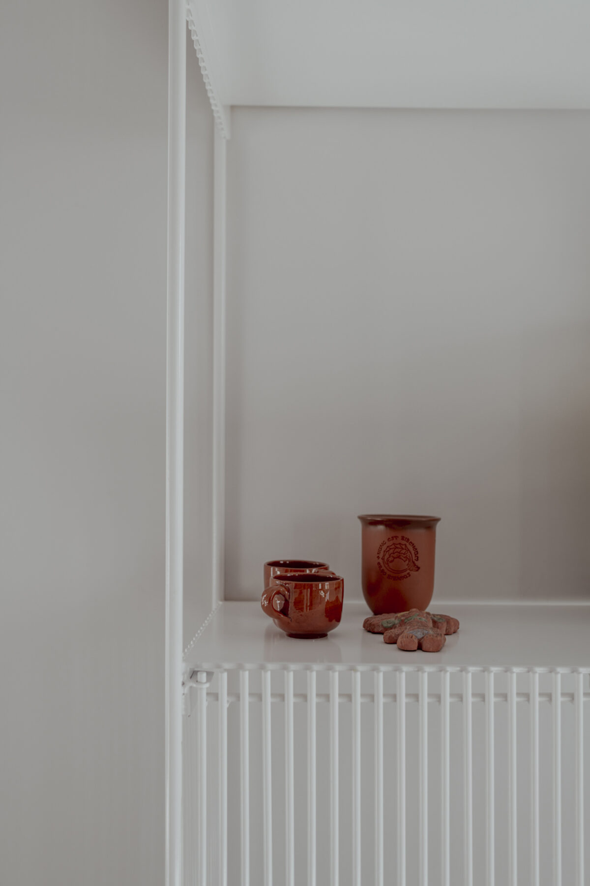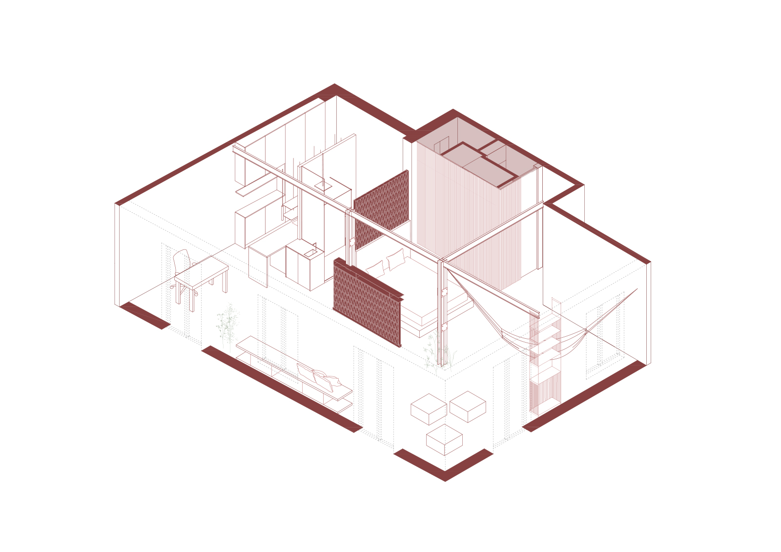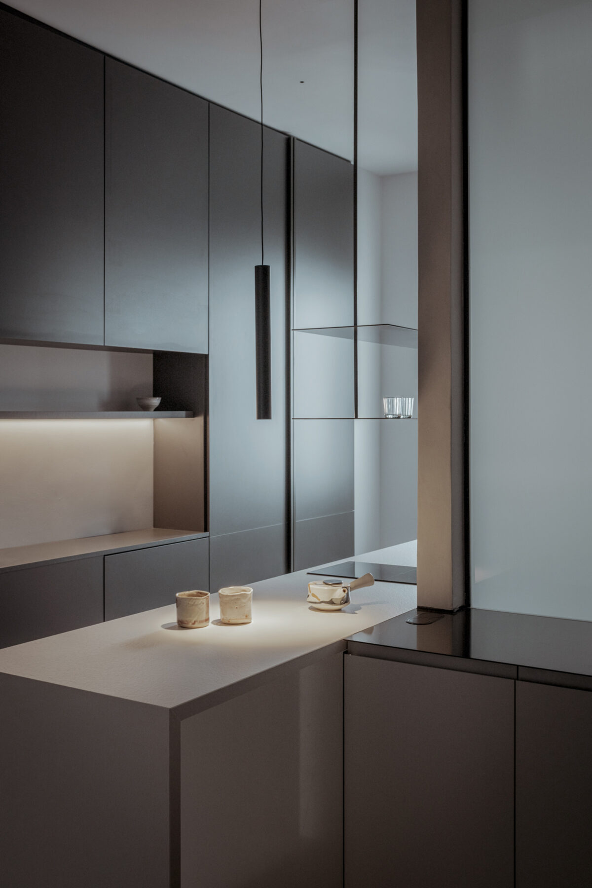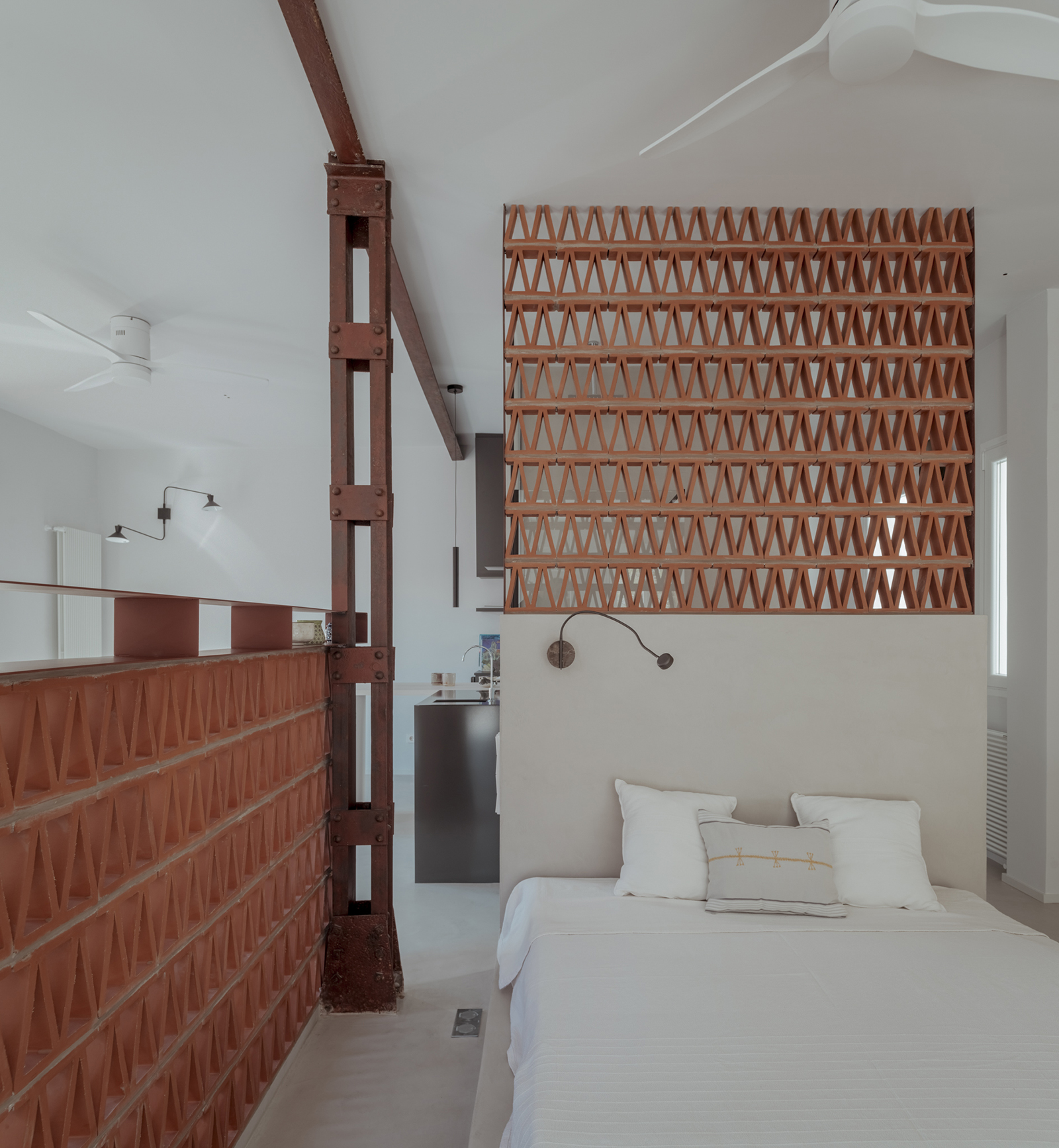 The minimum number of partitions possible is built to maintain this spatial and lighting effect, working on the idea of filters and transparencies, which are provided by ceramic lattices, glass in different finishes, or furniture elements such as metal shelves, which help to differentiate environments, always within the same continuous space.