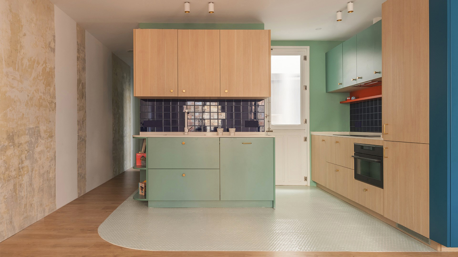 The kitchen space is kept open and connected to the original restored balconies of the façade through which a warm southern light enters.