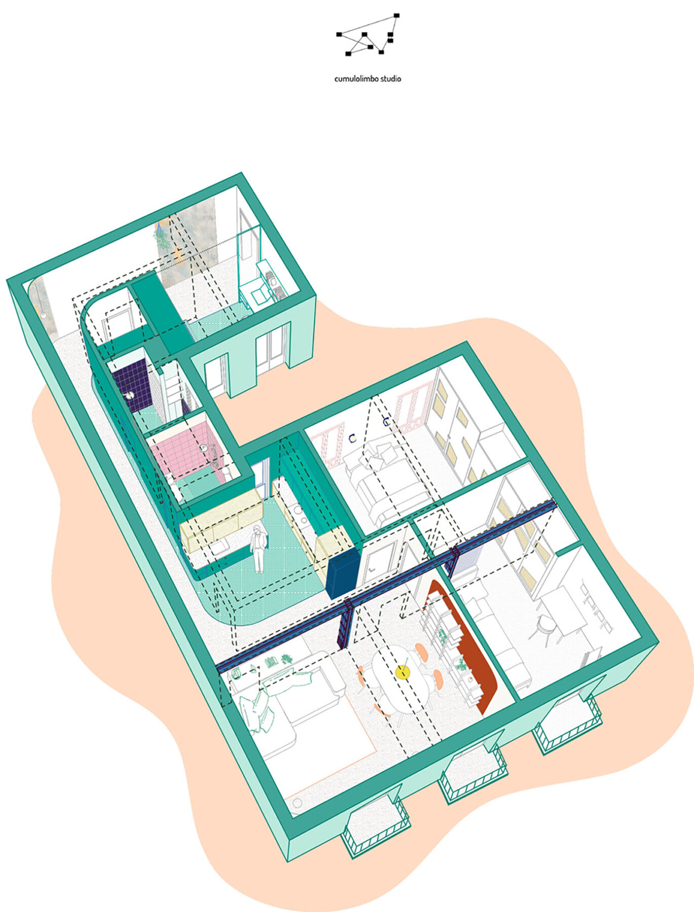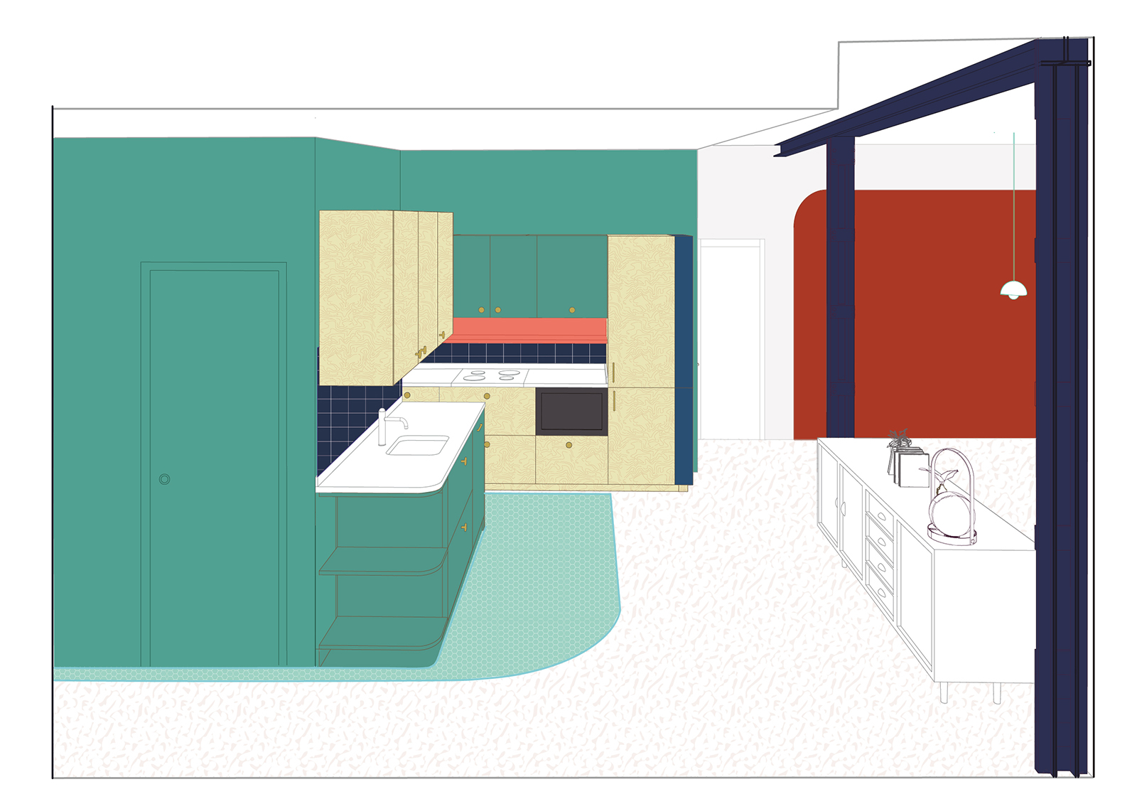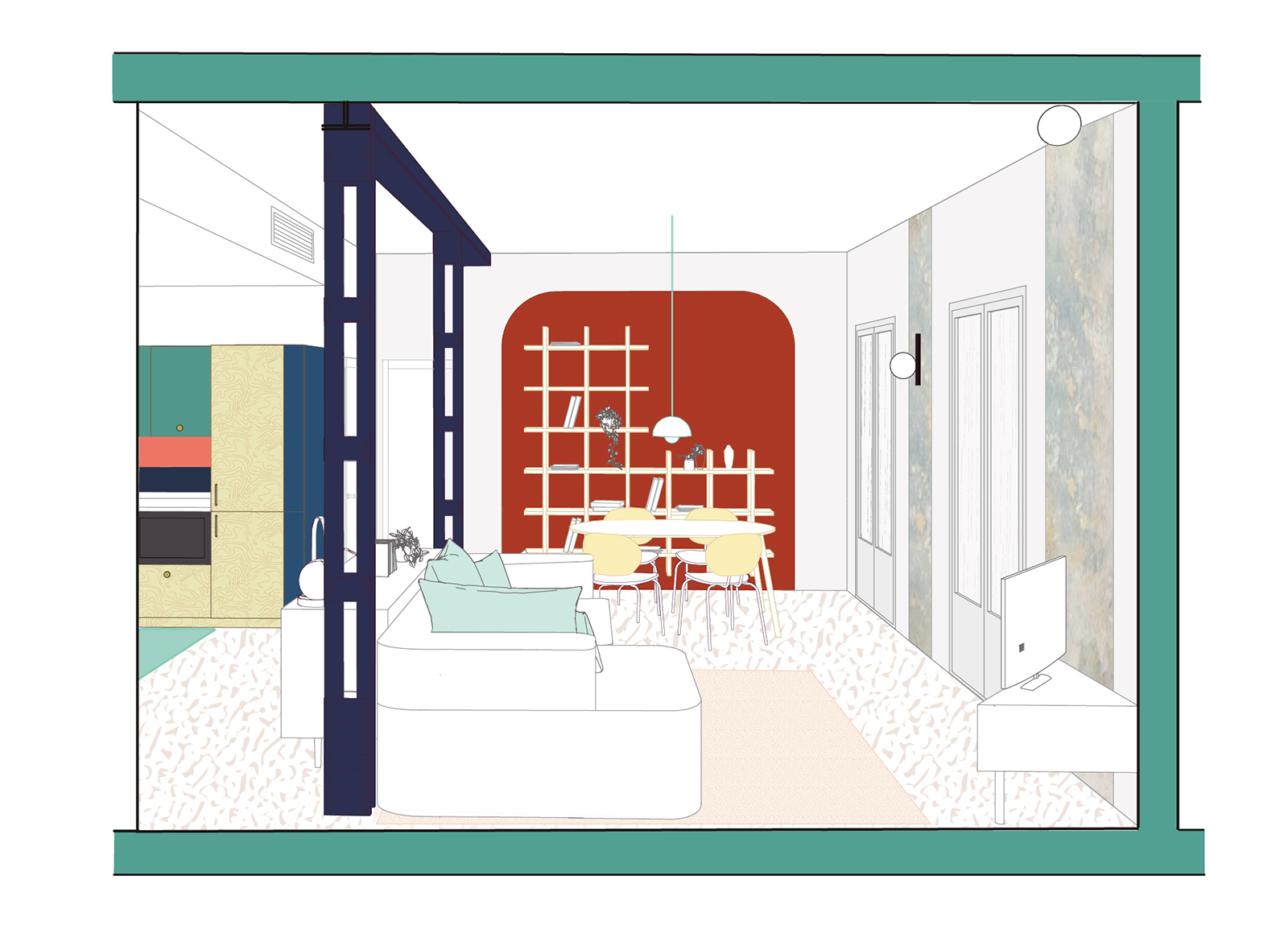 This forms a solid, colourful and compact volume containing the two bathrooms and the kitchen. The movement, therefore, between the two areas is marked by a patterned walk between Pompeian bands and a neutral green cloth that achieves the perfect difference between the two main spaces and generators of the dwelling.