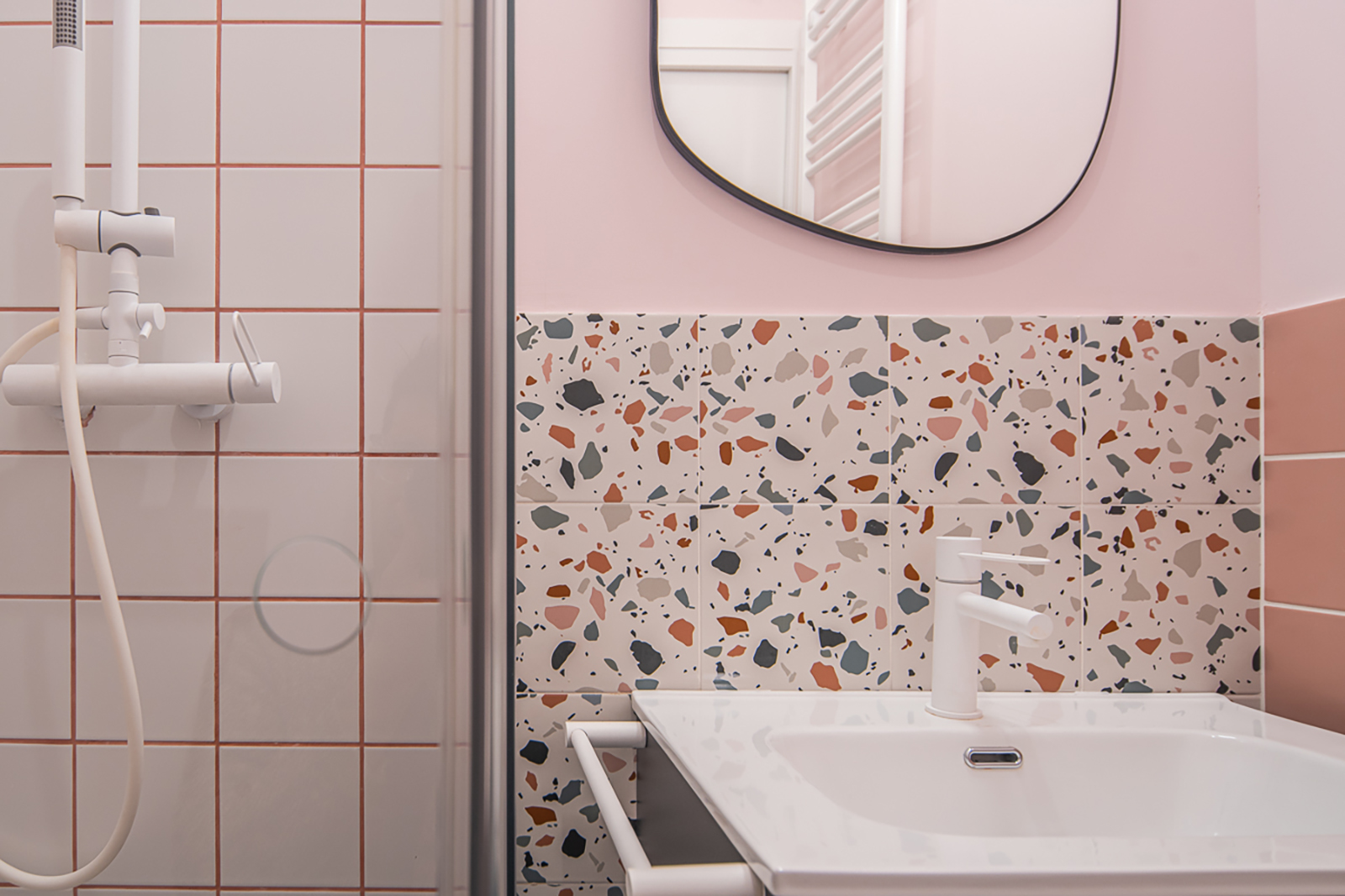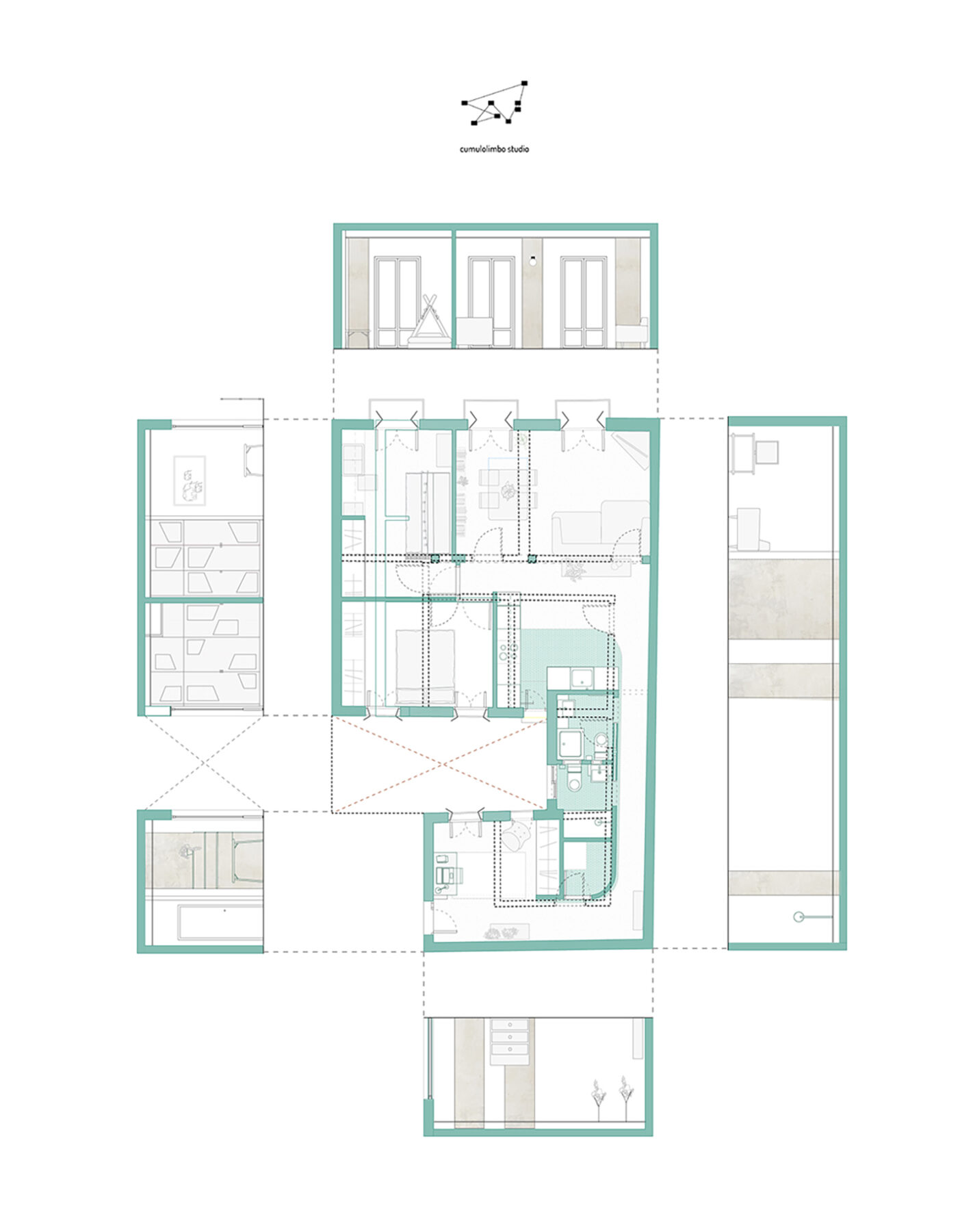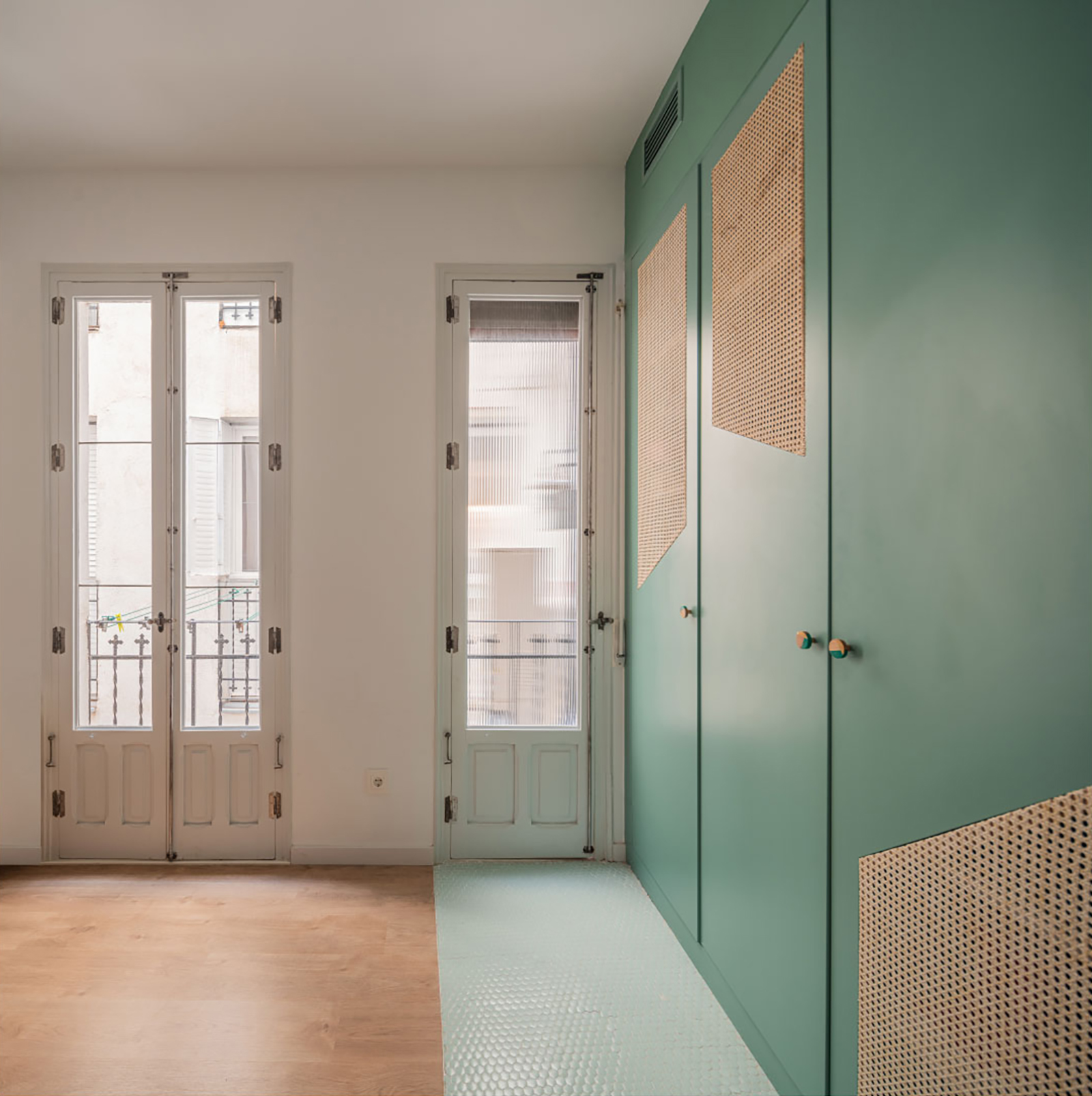 This forms a solid, colourful and compact volume containing the two bathrooms and the kitchen. The movement, therefore, between the two areas is marked by a patterned walk between Pompeian bands and a neutral green cloth that achieves the perfect difference between the two main spaces and generators of the dwelling.