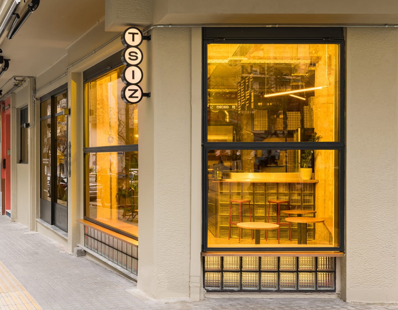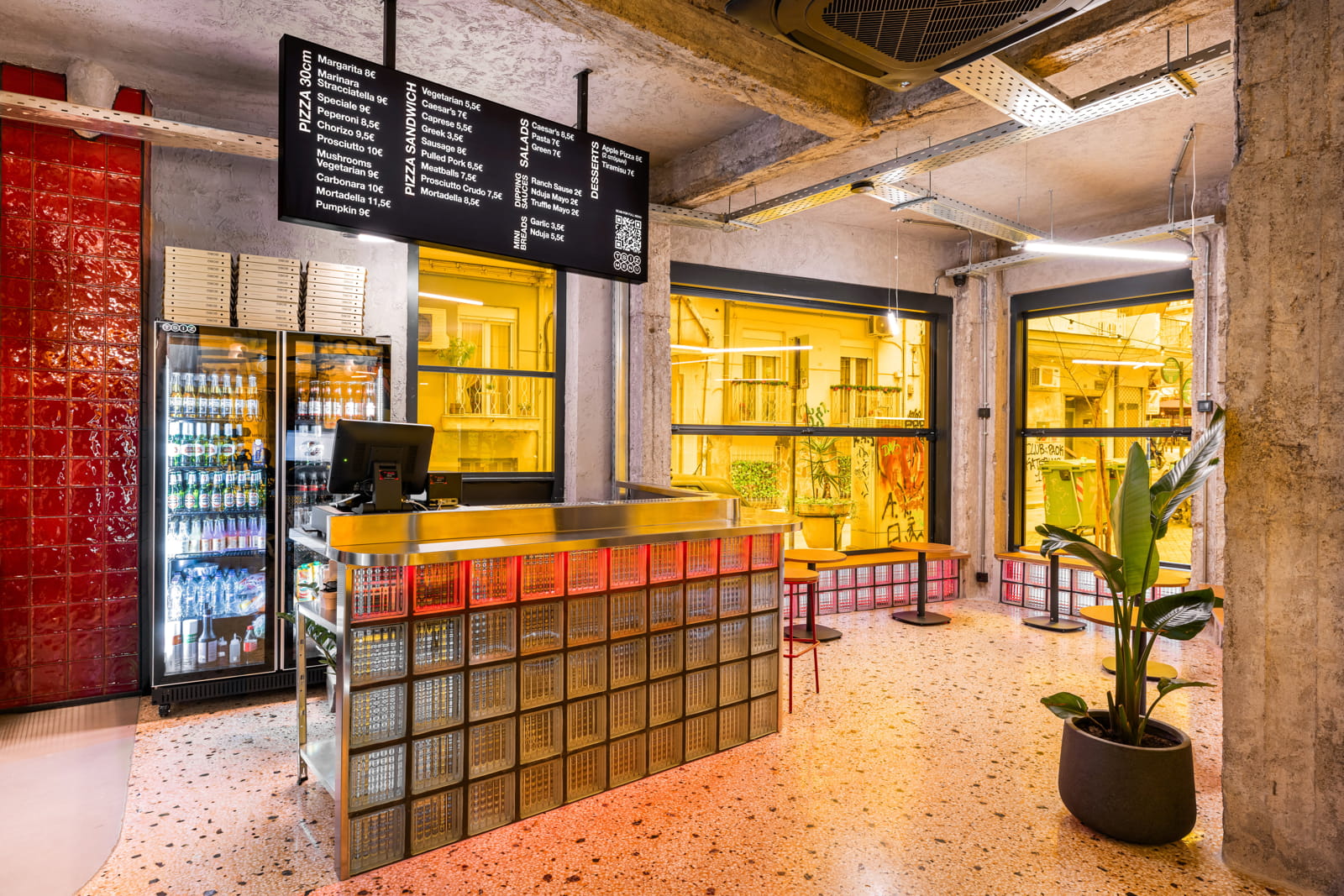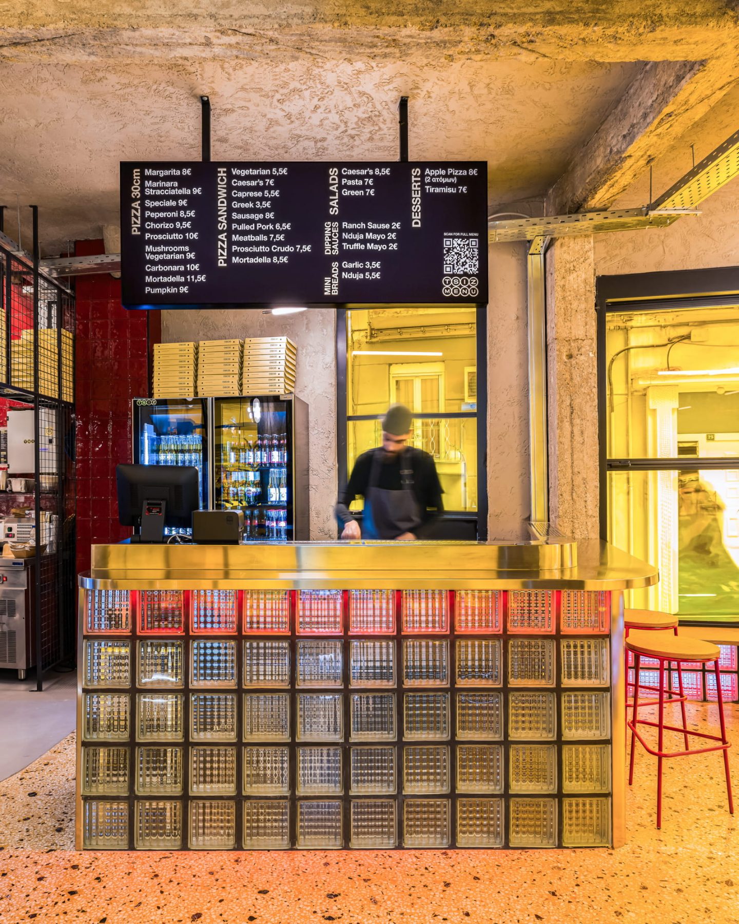 TSIZ Pizza Bar in Thessaloniki, designed by Chrysanthi Karta, reinterprets the pizza bar typology through an architecture articulated by light, colour and transparency. Blurring the boundary between interior and street, the project reveals pizza-making process as an urban experience. Exposed structures, glass bricks, stainless steel, and saturated red and yellow tones compose a cohesive industrial environment and a bespoke spatial identity.
