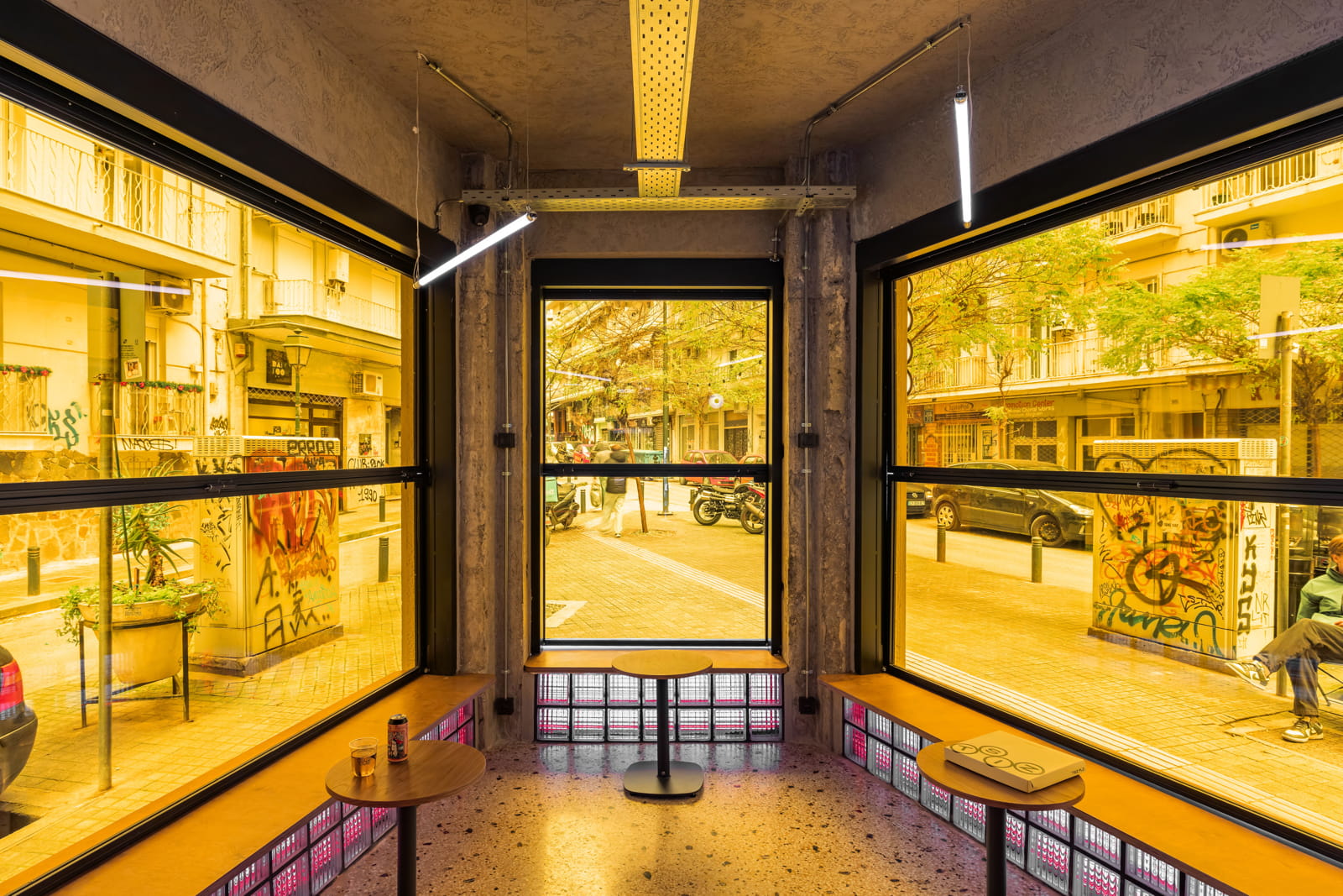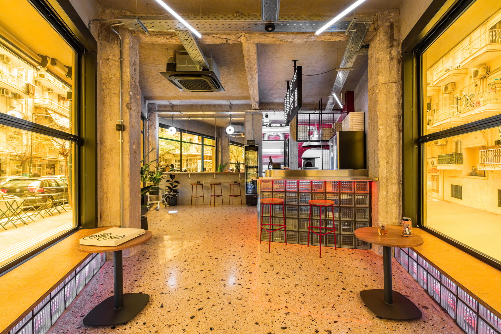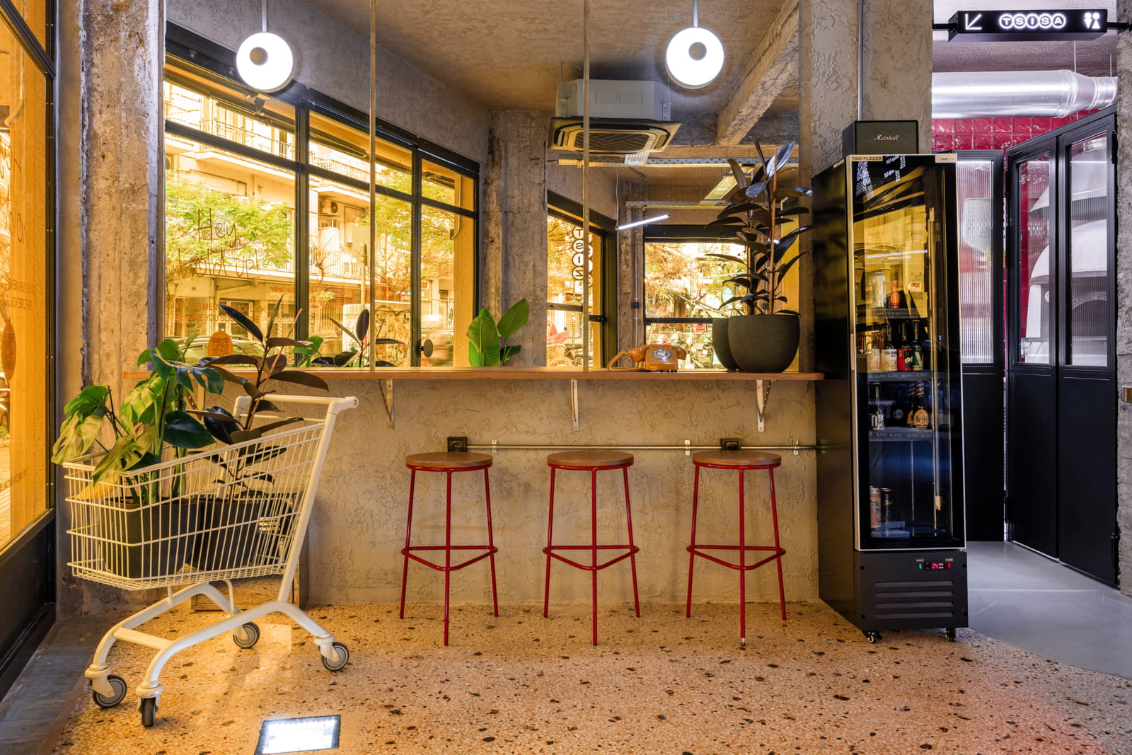 TSIZ Pizza Bar in Thessaloniki, designed by Chrysanthi Karta, reinterprets the pizza bar typology through an architecture articulated by light, colour and transparency. Blurring the boundary between interior and street, the project reveals pizza-making process as an urban experience. Exposed structures, glass bricks, stainless steel, and saturated red and yellow tones compose a cohesive industrial environment and a bespoke spatial identity.