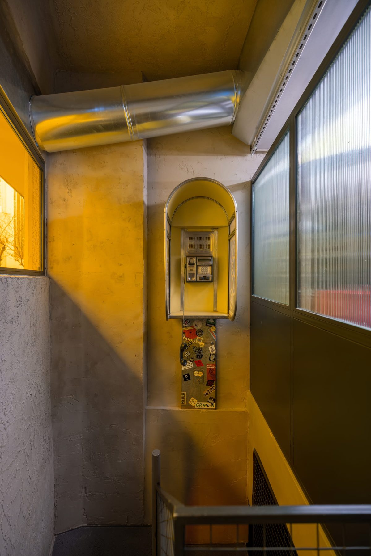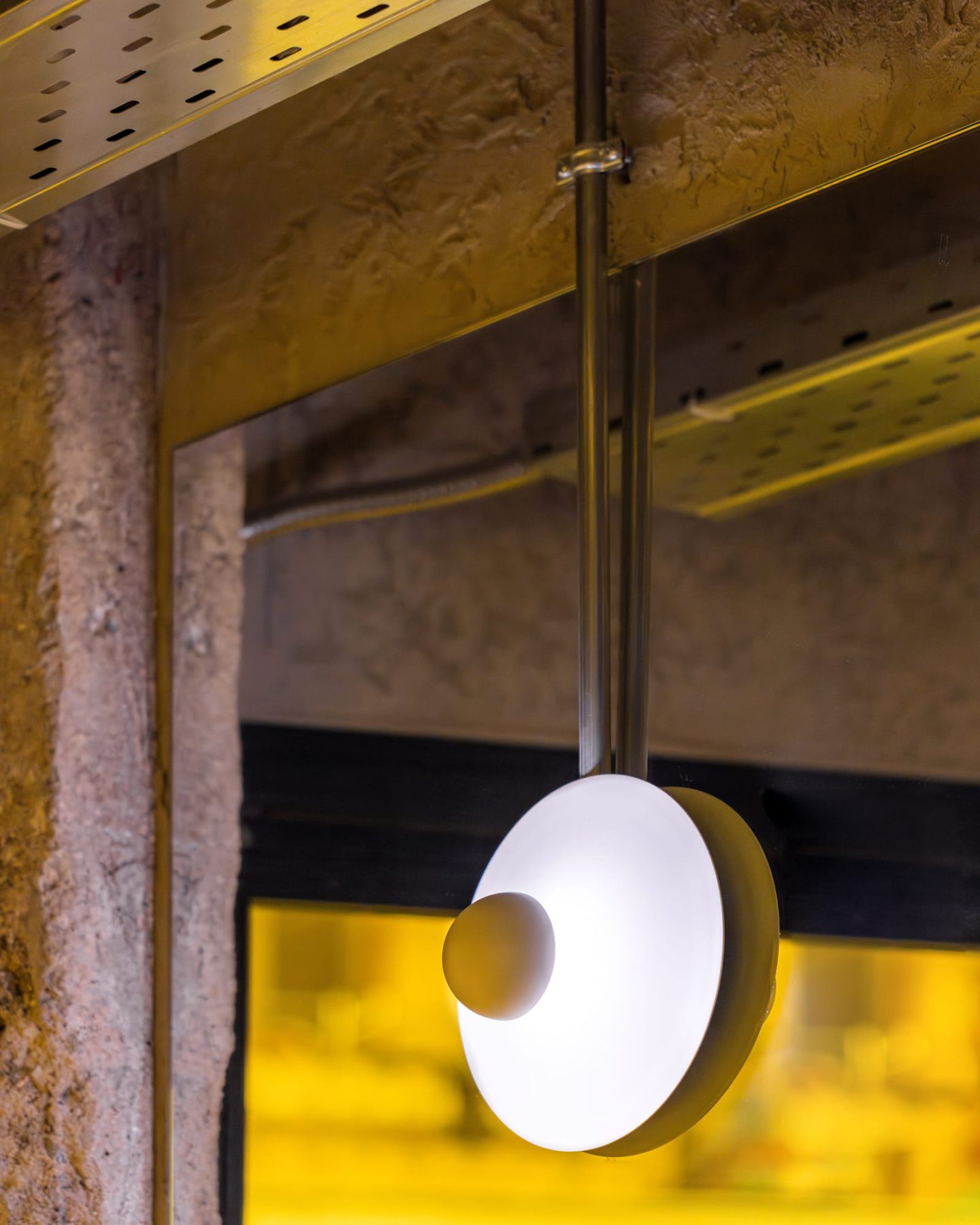 This mechanism invites the street into the space while offering passersby a direct view of the pizza-making process. Warm red interior lighting filters through the glass-brick benches and, combined with yellow window films, transforms TSIZ into a luminous presence within the urban streetscape.