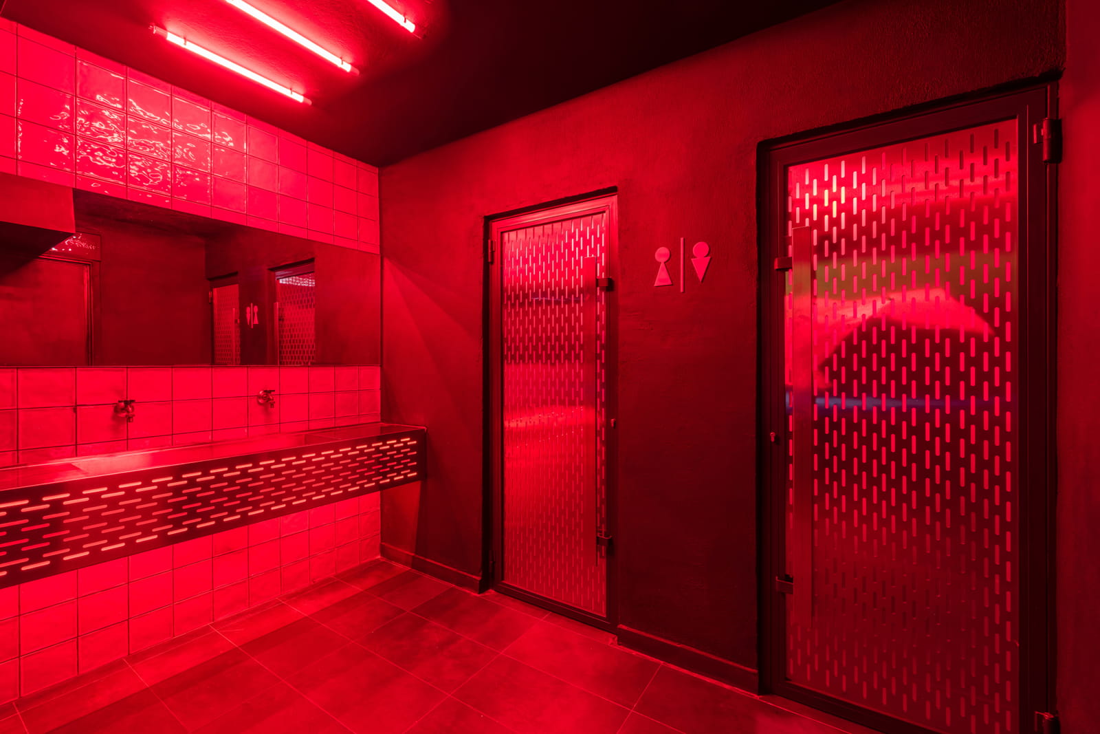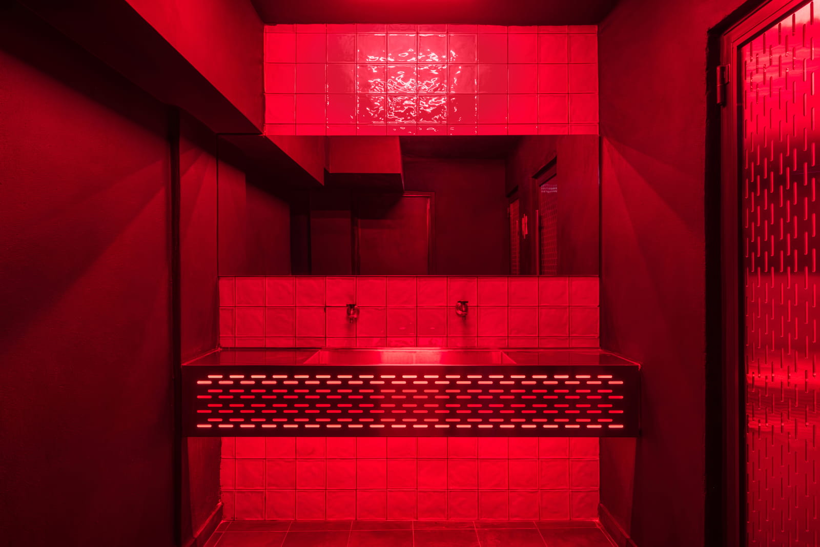 The restroom continues the project’s immersive material and chromatic logic, conceived as an intensified interior condition. Saturated red lighting, reflective surfaces and perforated stainless-steel sink and door panels generate a dense, atmospheric environment in which light, texture and reflection dissolve spatial boundaries. Red ceramic tiles, linear luminaires and mirrored planes amplify depth and abstraction, reinforcing the restroom as an experiential continuation of TSIZ’s architectural narrative.