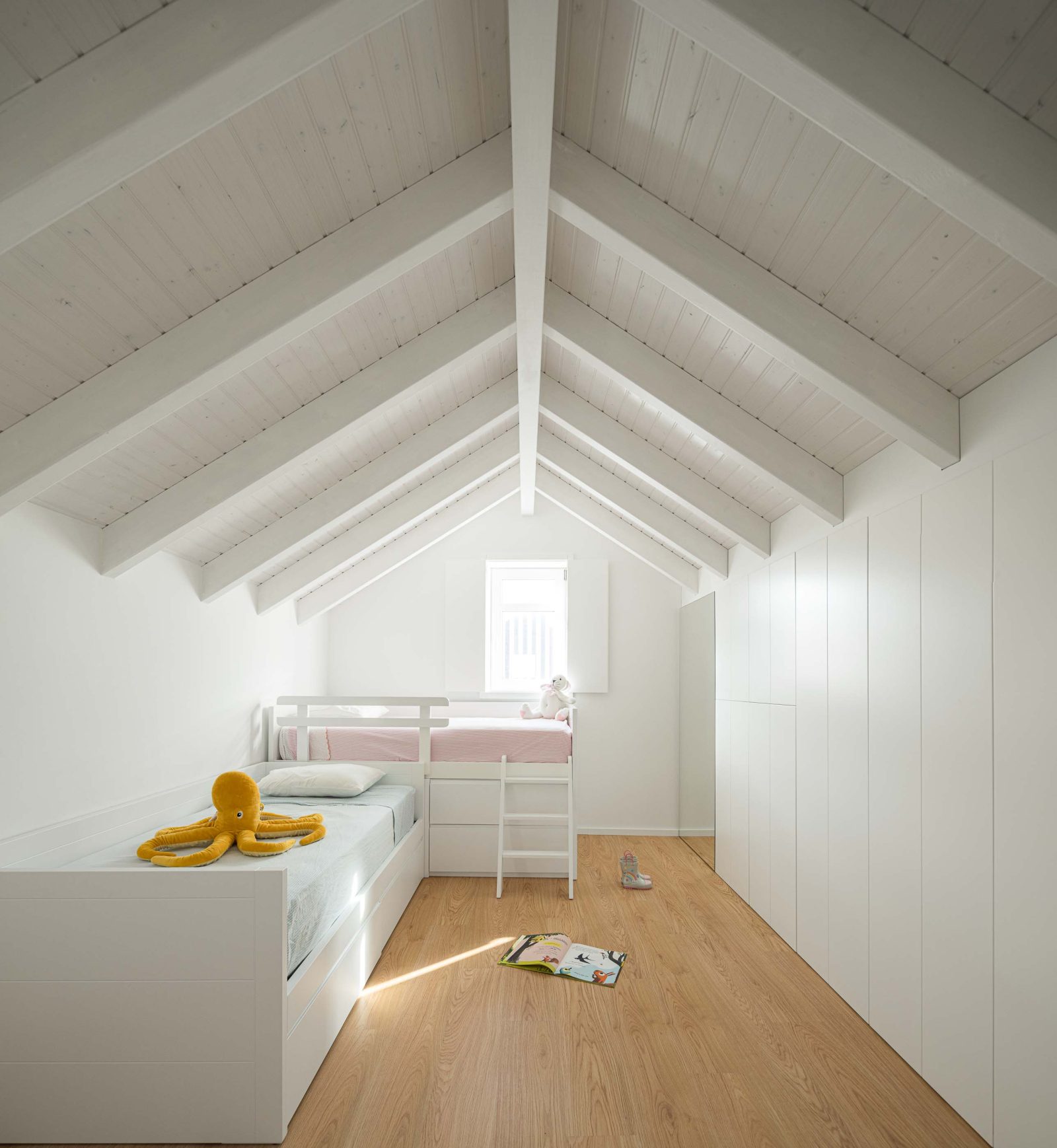 In the loft, the two bedrooms and the bathroom take advantage of the different roof sections, highlighted by wooden beams.