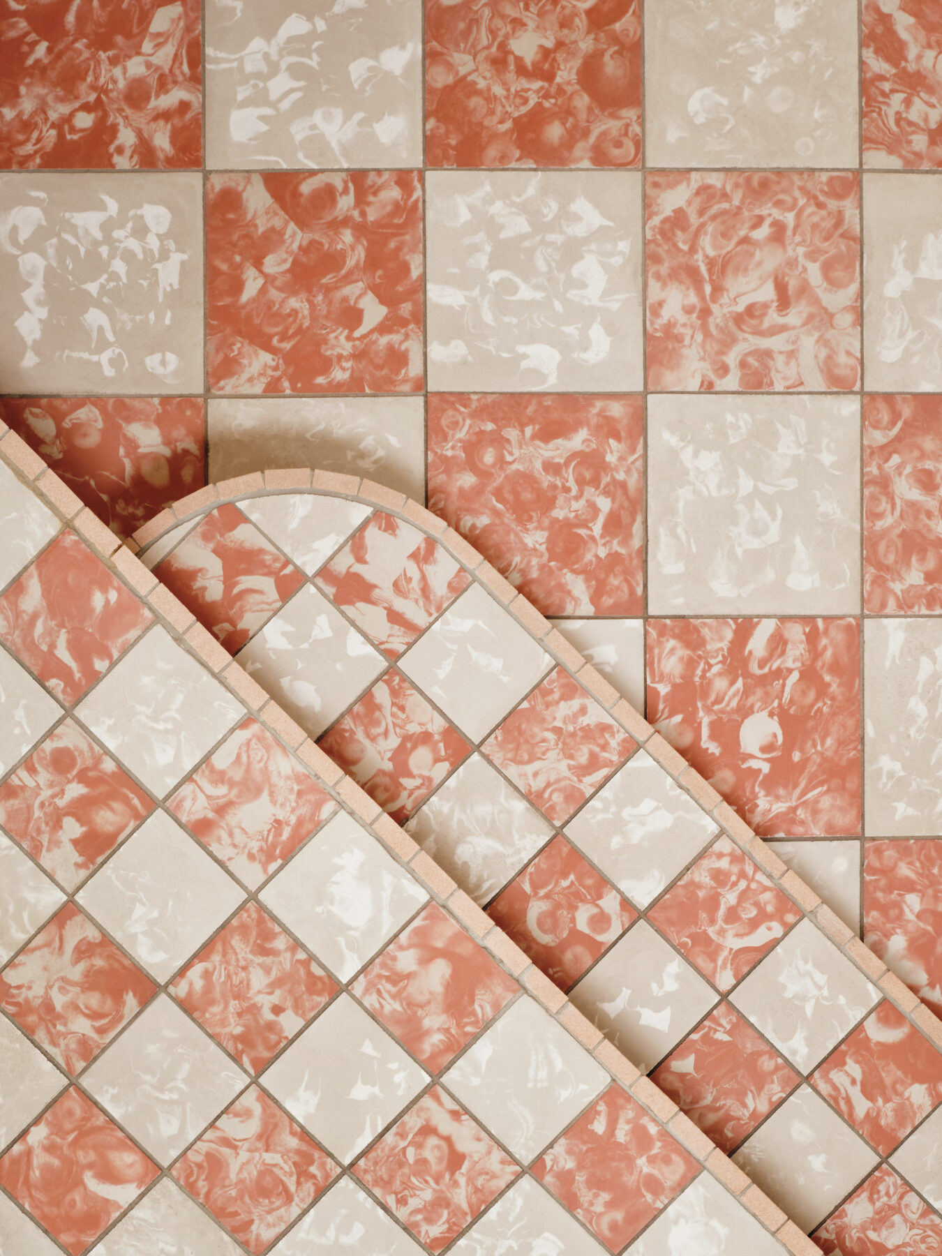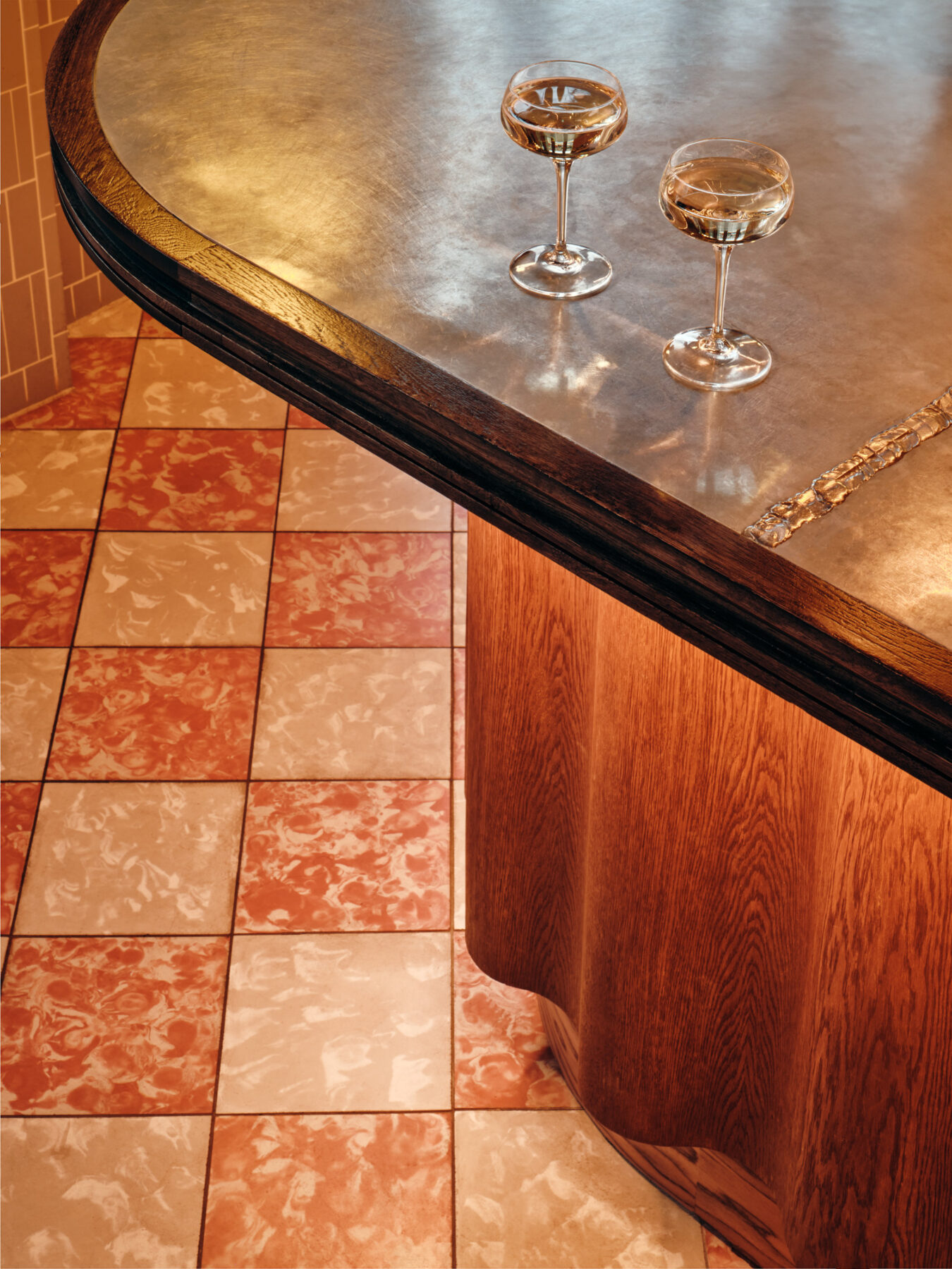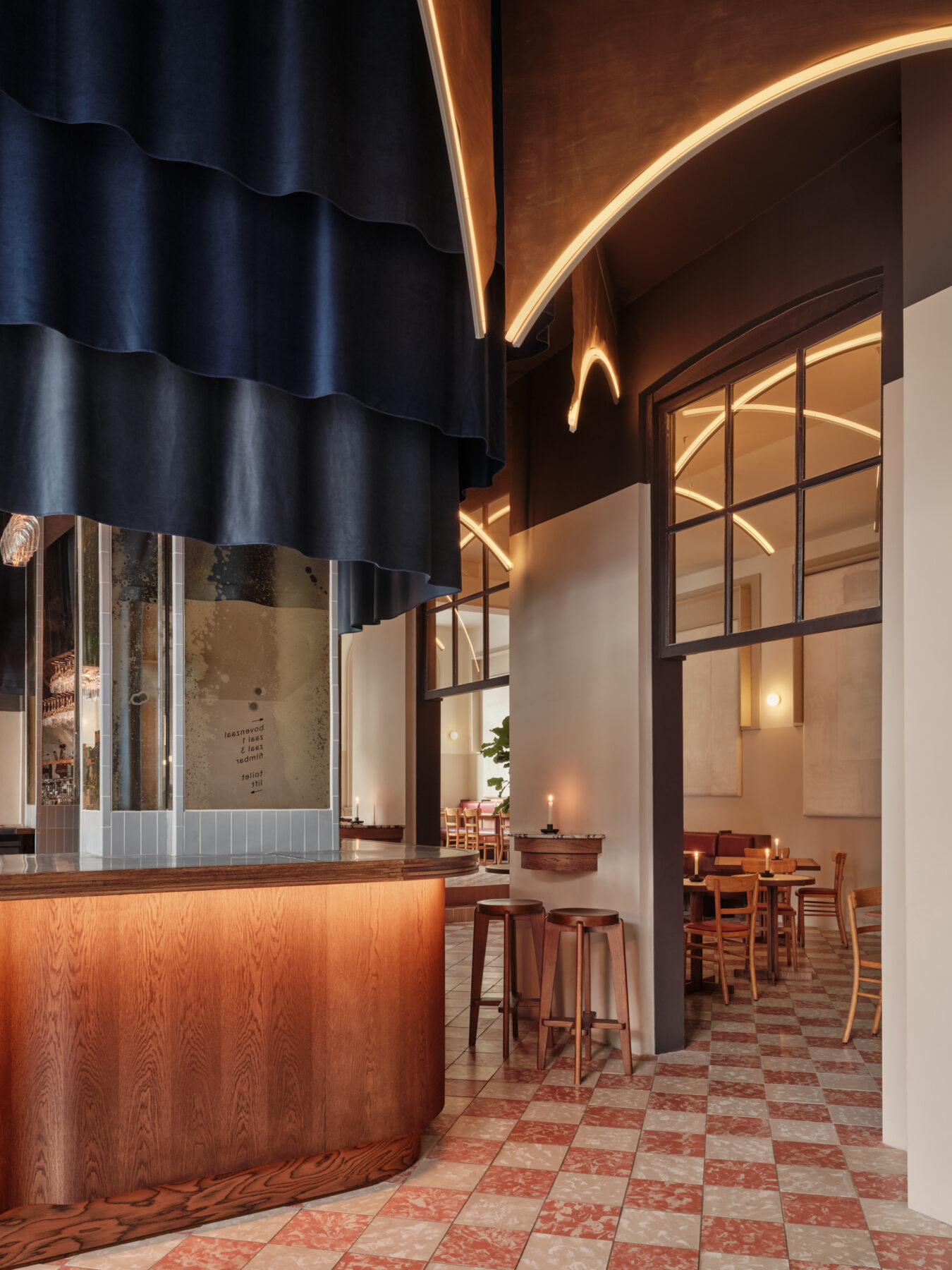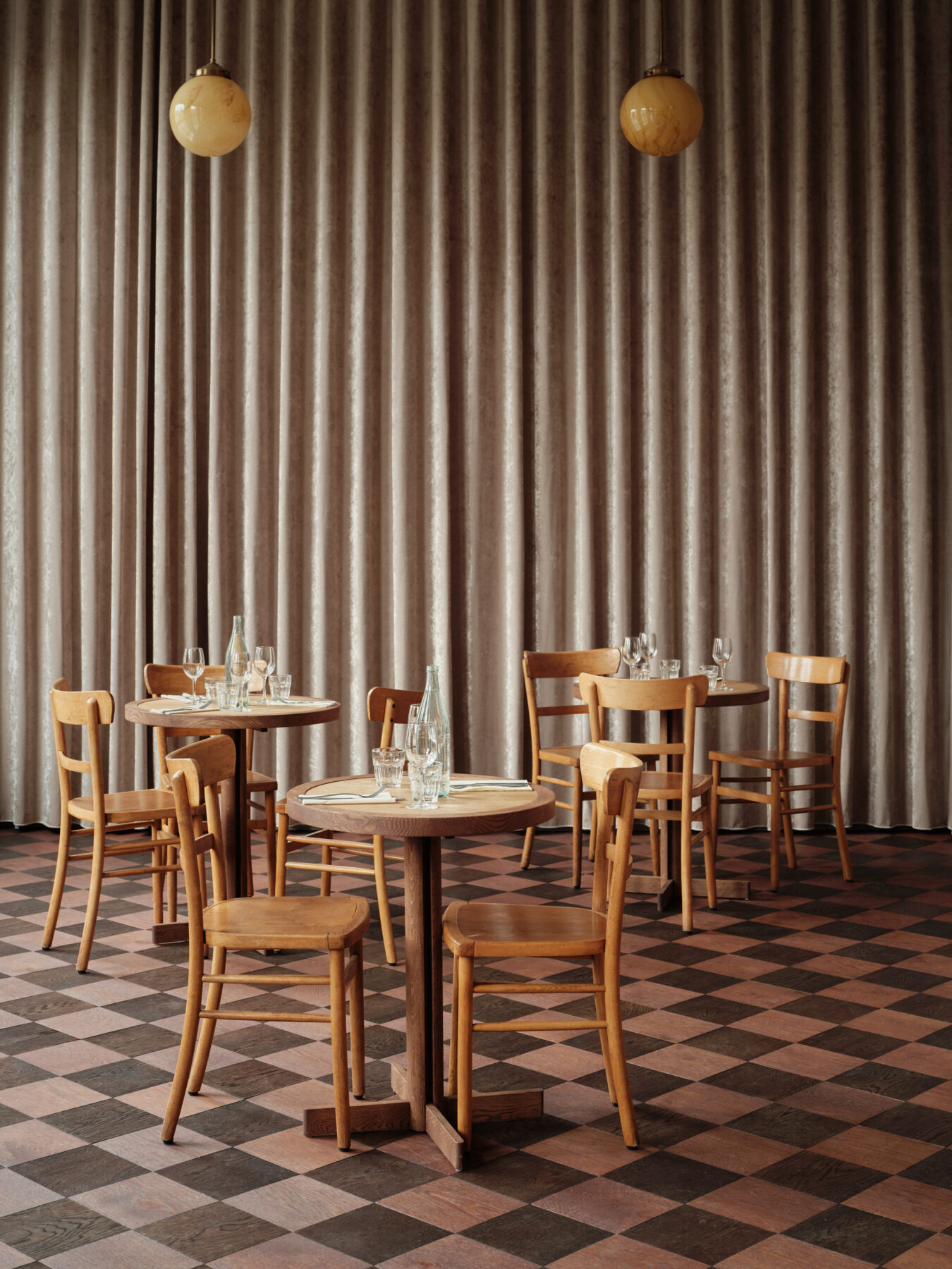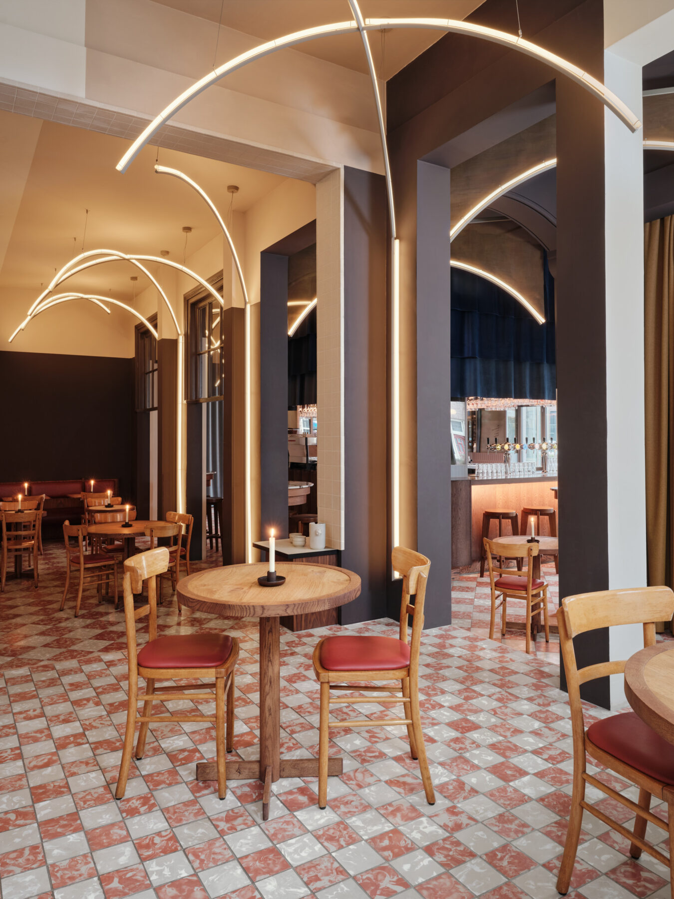 Two parts of the brasserie have been elevated to play with height: one corner of the brasserie has been elevated so that you can now look out of the high windows, which were previously too high; while the main space opposite the kitchen is also elevated. They both stand on a warm-coloured, chess-patterned stone floor consisting of Aigües tiles handmade in Mallorca. The elevated parts of the brasserie are differentiated by an alternative floor pattern that has square instead of diagonal floor tiles.