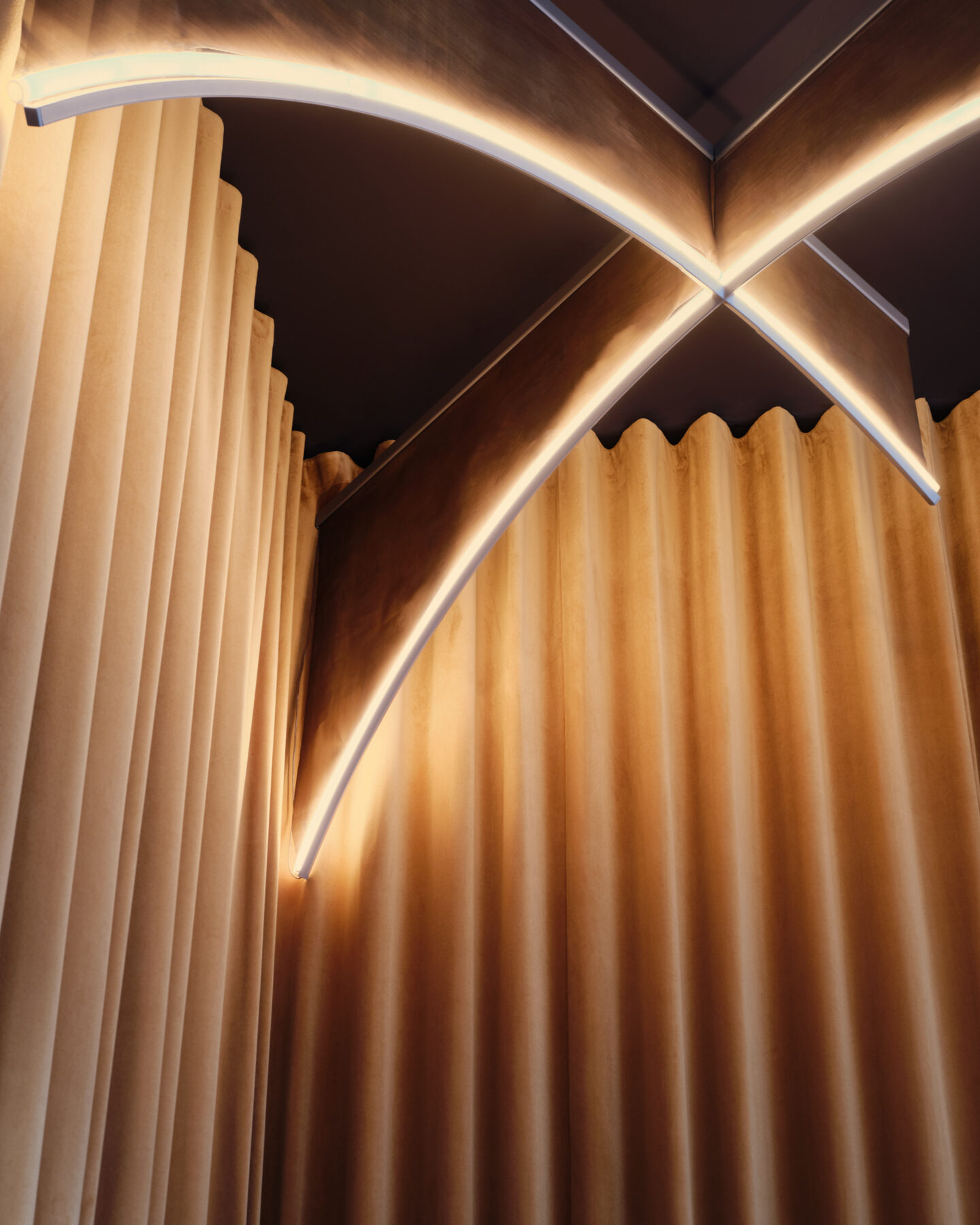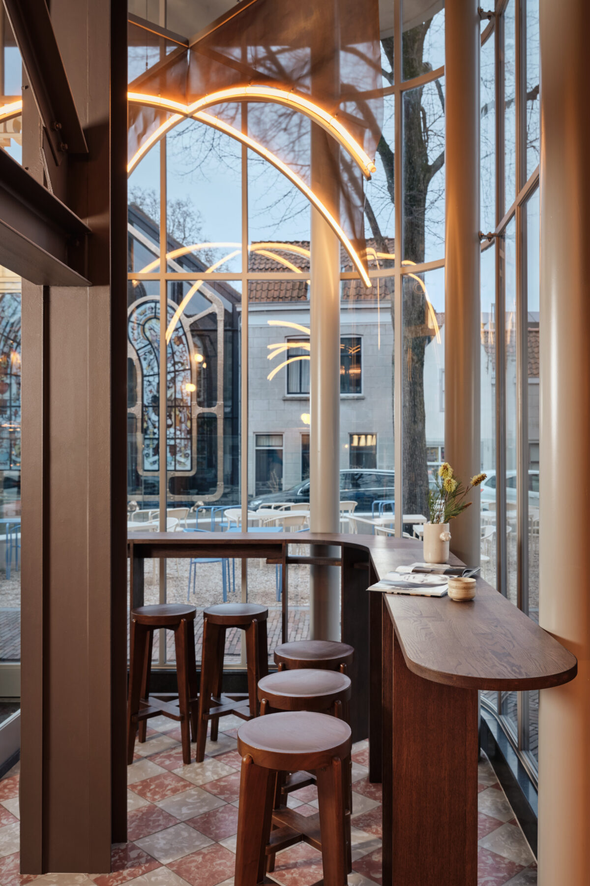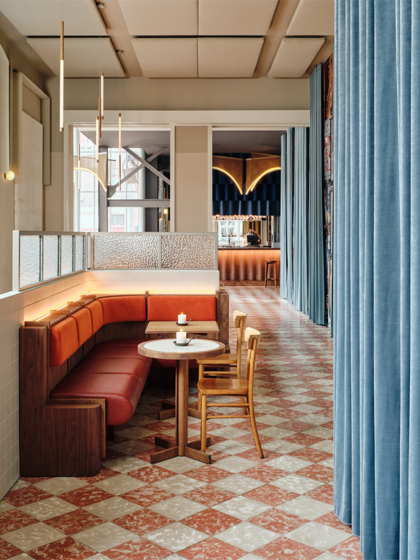 All the areas of the brasserie are visually connected by hanging lights in the shape of cloister arches given extra depth by aged brass mesh crowns above them. The lights reflect gently off the darker walls and ceilings surrounding them to create an intimate atmosphere and lead you to the heart of the brasserie: the dramatic bar. It’s an ode to cinema and the performing arts: a stage with a majestic three-layered velvet curtain in shades of indigo, from which delicious cocktails are served under a spotlight. You can enjoy this performance from all around the bar thanks to seating that extends the bar space and offers direct access to the brasserie around you and the terrace outside.