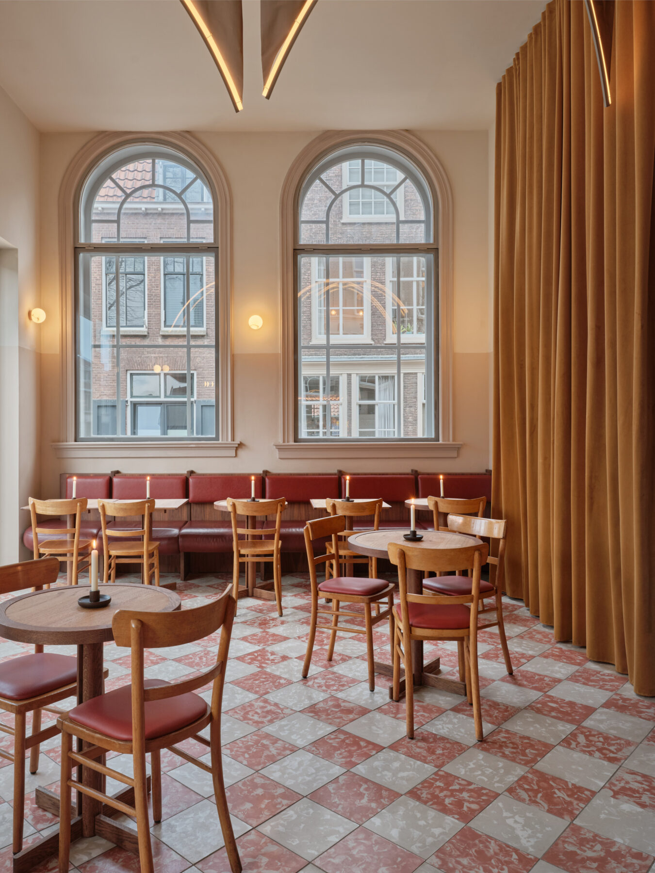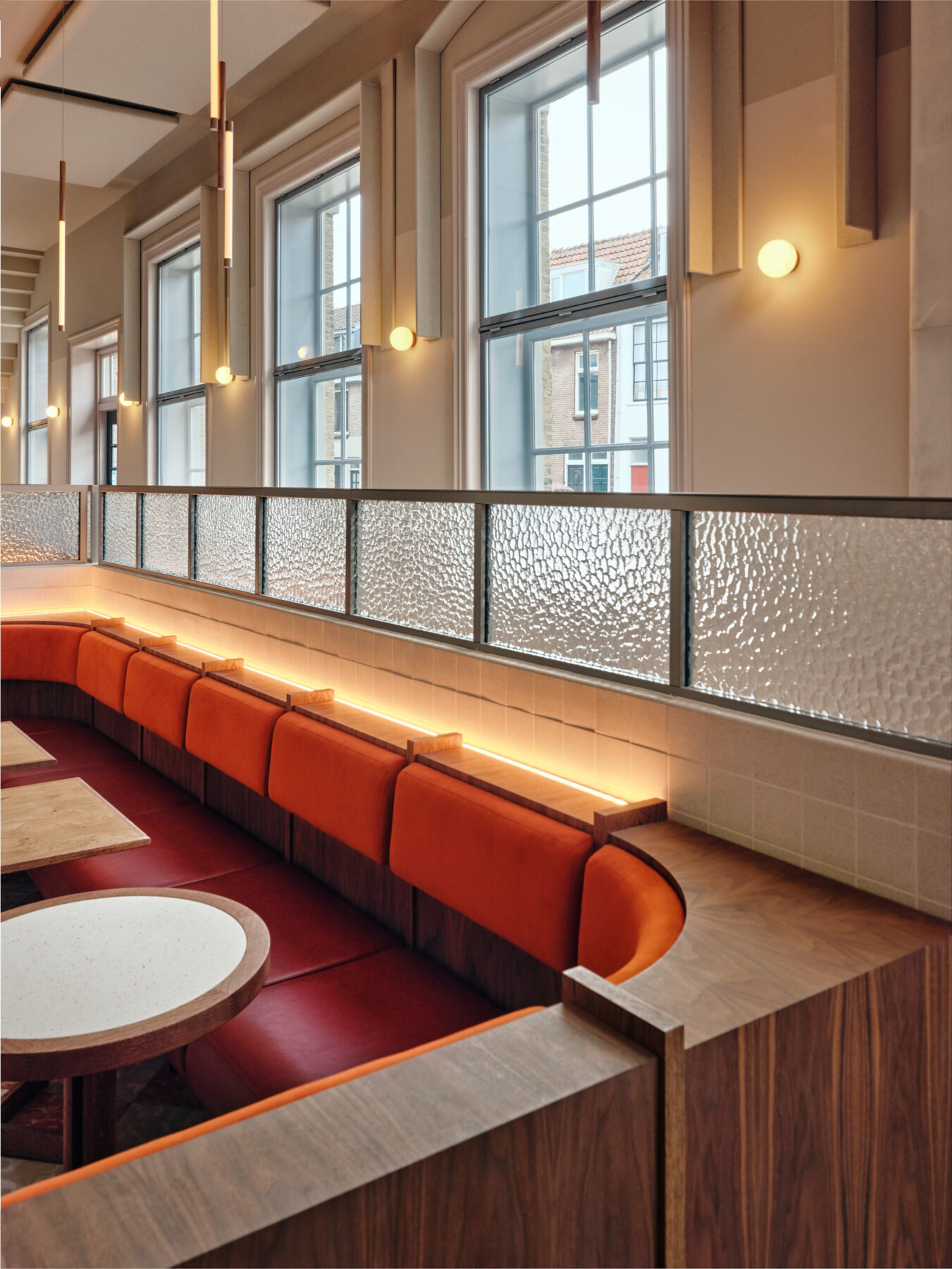 This multifunctional event room is perfect for hosting anything from poetry recitals to dance performances. Dark brown and taupe velvet curtains hang all around the worlds, concealing a door to a kitchen which allows events to be fully catered. Lighting is provided by coloured glass hanging lights that hang like planets from the ceiling, and the De Witt signature alabaster lights on the walls. The window frames here are darker to better frame the view over the picturesque houses on the other side of the street. It’s the perfect culmination of a collection of carefully designed spaces that will host many unforgettable evenings for the people of Dordrecht.
