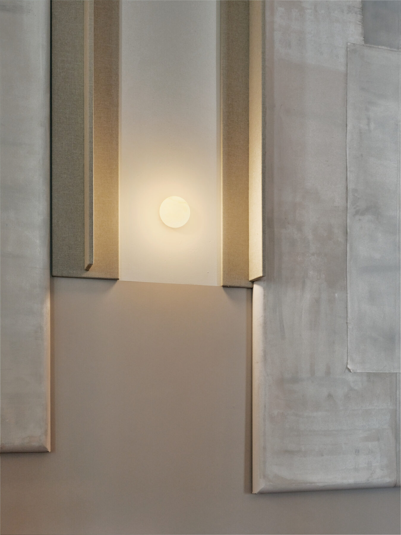 Windows in these spaces, and throughout the ground floor feature wimple frames. This shape is inspired by the head covering of the nuns who used to live here, and they’re made of made of dark thick linen and a warmer shade of grey. Wimples also surround a series of ‘fake windows’ that mirror door openings in the brasserie. These are made of recycled canvas and have been painted in shades of ivory, off-white and subtle power dues to create new artworks that capture the interplay of light and shadow throughout the interior. Between these windows are handcrafted alabaster lights that decorate the entire interior of De Witt.