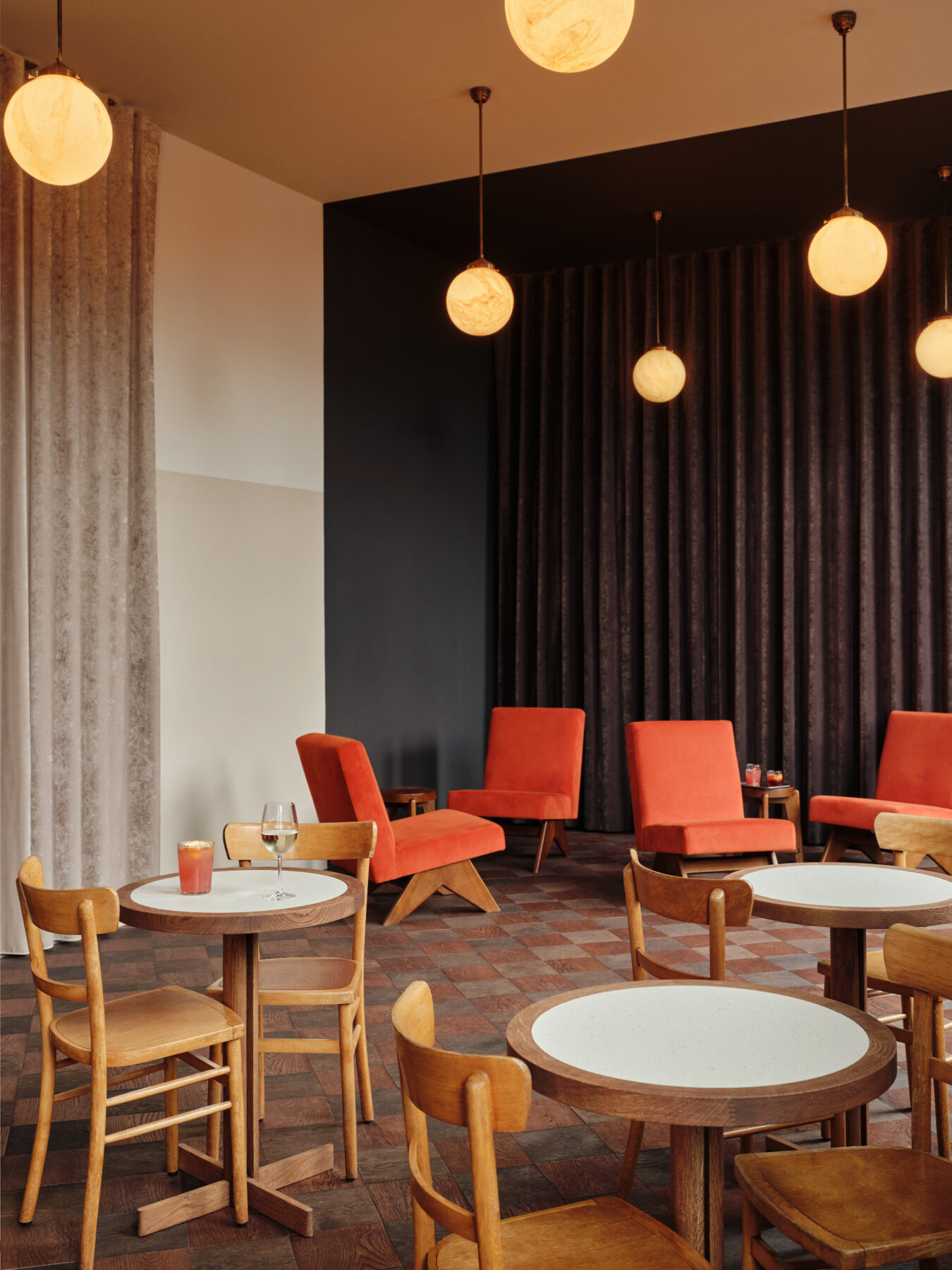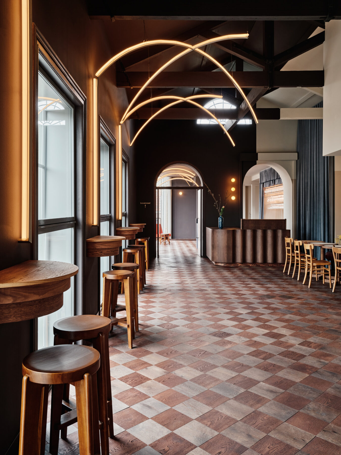 To make the space more welcoming, the orientation was rotated to face the square outside and invite the city inside. You enter the main brasserie by turning right immediately after entering the building. Here’ll you find an open kitchen with a long vermillion bench opposite, at which diners can sit at to watch their food being prepared. The kitchen features tiles and windows that recall the building’s past as a school, as well as custom lights inspired by the time it was a laboratory. These lights consist of layers of bronze mirrors, lights and glass panels that allude to the protective screens used during experiments. The long bench opposite has lighting integrated under the leather back rests that reflect the speckled tiles and glass panelling above it – another reference to the old school inspiration. Further lighting in this area is provided by wooden hanging lights. The shape of these strip lights alludes to the test tubes that used in the laboratory and come in three dynamic forms: with the oak part on top; in the middle; or at the bottom. While the chairs in the brasserie are vintage chairs given a new life, the tables are custom-made. There are two types: round and square, made with two types of wood with different edgings and interiors.