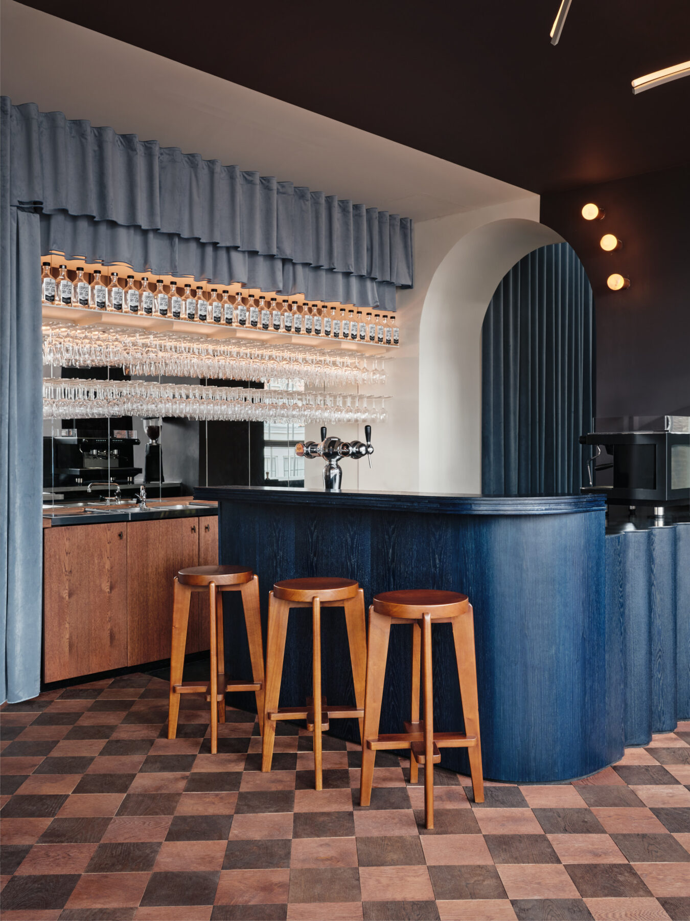 The bar itself is crafted like a curtain, with waves carved into its wooden base. The veins of the oak travel in two directions to form an eye-catching contrast: vertical on the bar, horizontal on the base. As a nod to a classic brasserie the bar top is made of zinc. Columns in the corners of the bar have been tiled with pale blue tiles and handmade aged mirrors, designed to fit in precisely with the city’s colour scheme. As a final allusion to the performing arts, the feet of wine glasses have been positioned to hang just beneath the curtain, appearing like a ballerina’s dress beneath the curtain.