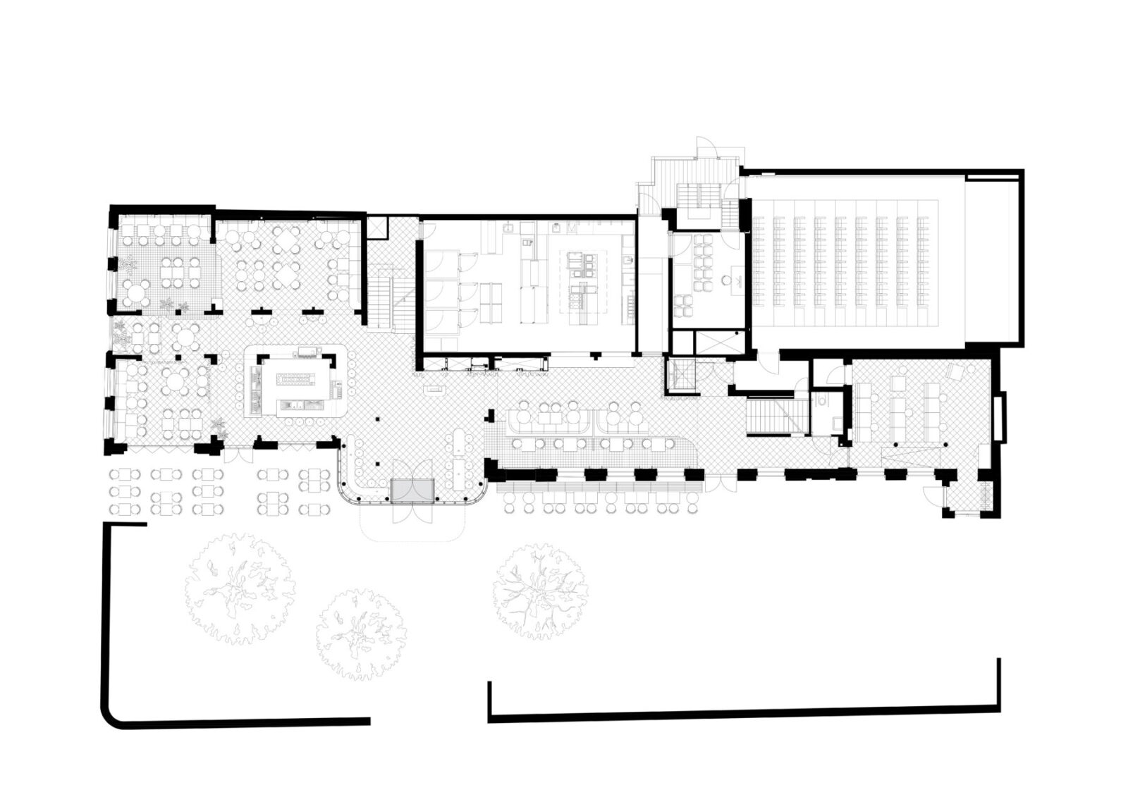 The former café and restaurant have been replaced in a radical reshaping of the ground floor. Studio Modijefsky opened up the entire space, removing walls and an elevator, to create one larger brasserie boasting a main area, three smaller areas and a bar.