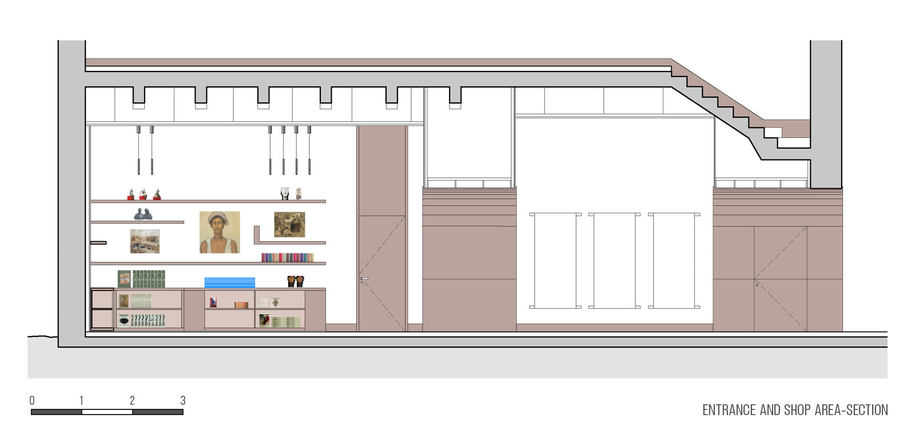 The Museum Shop was designed in the northeastern part of the building. Its furniture included display cabinets and showcases, the cash register counter as well as shelving on the surrounding walls. In immediate vicinity to the Shop, the Educational Programs – Multipurpose Spaces were allocated. To the north of the Antechamber is the Exhibition Foyer, from where the elevator to the first floor is accessible. Furthermore, the Exhibition Foyer borders the Periodical Exhibitions space and the visitors’ sanitary areas. Due to the special requirements in electromechanical installations, a mechanical mezzanine floor level was added to place the relevant equipment.