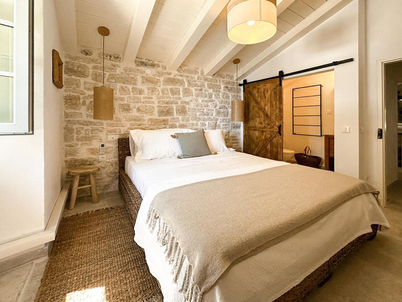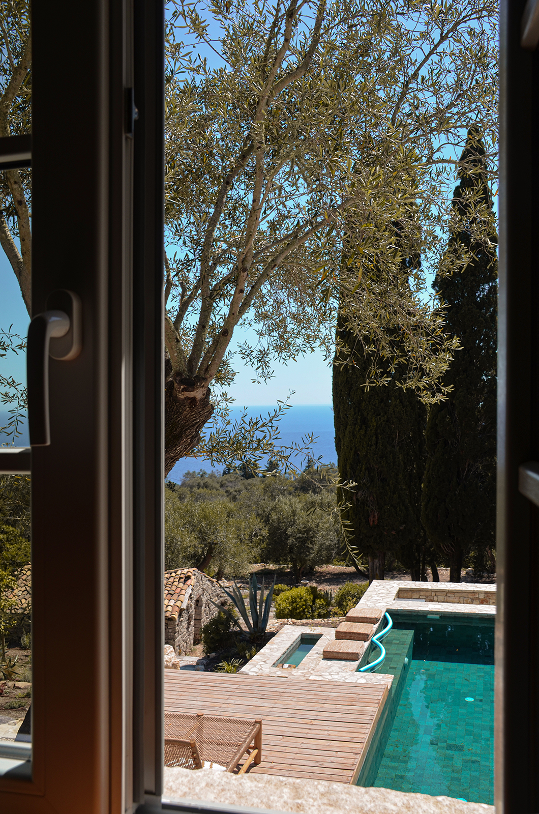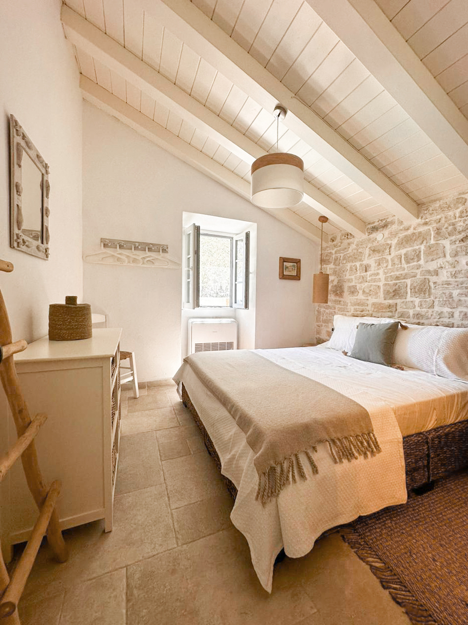 Πέτρινες καμάρες, λευκασμένες δοκοί και δάπεδα από φυσική πέτρα ή ξύλο συνθέτουν μια παλέτα ήρεμηςμοντέρνας έκφρασης, όπου η υλικότητα, το φως και η σκιά γίνονται οι πρωταγωνιστές. Παράθυρα τοποθετημένα στο κέντρο των παλαιών πέτρινων τοίχων πλαισιώνουν θέες προς το Ιόνιο, τον ελαιώνα και την πισίνα, διατηρώντας μια σταθερή σύνδεση με το τοπίο.