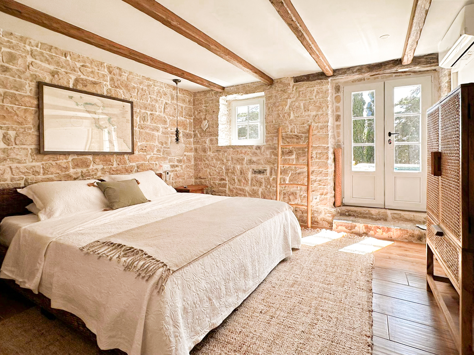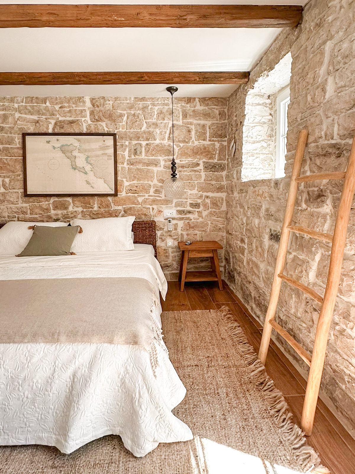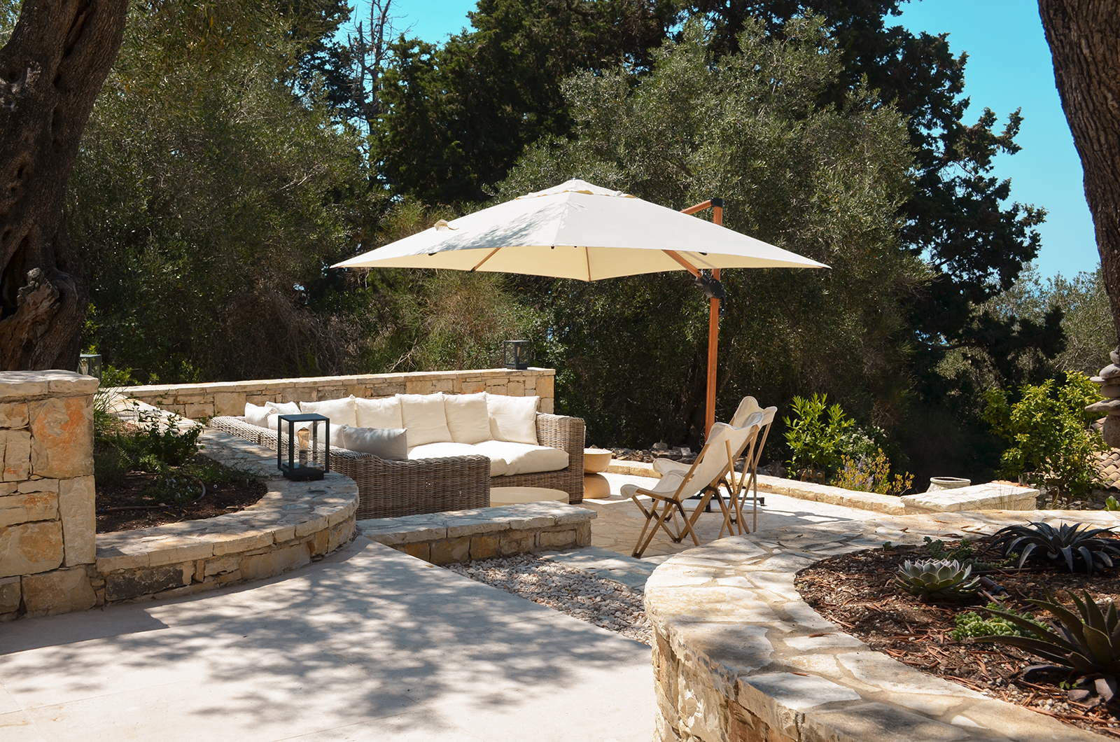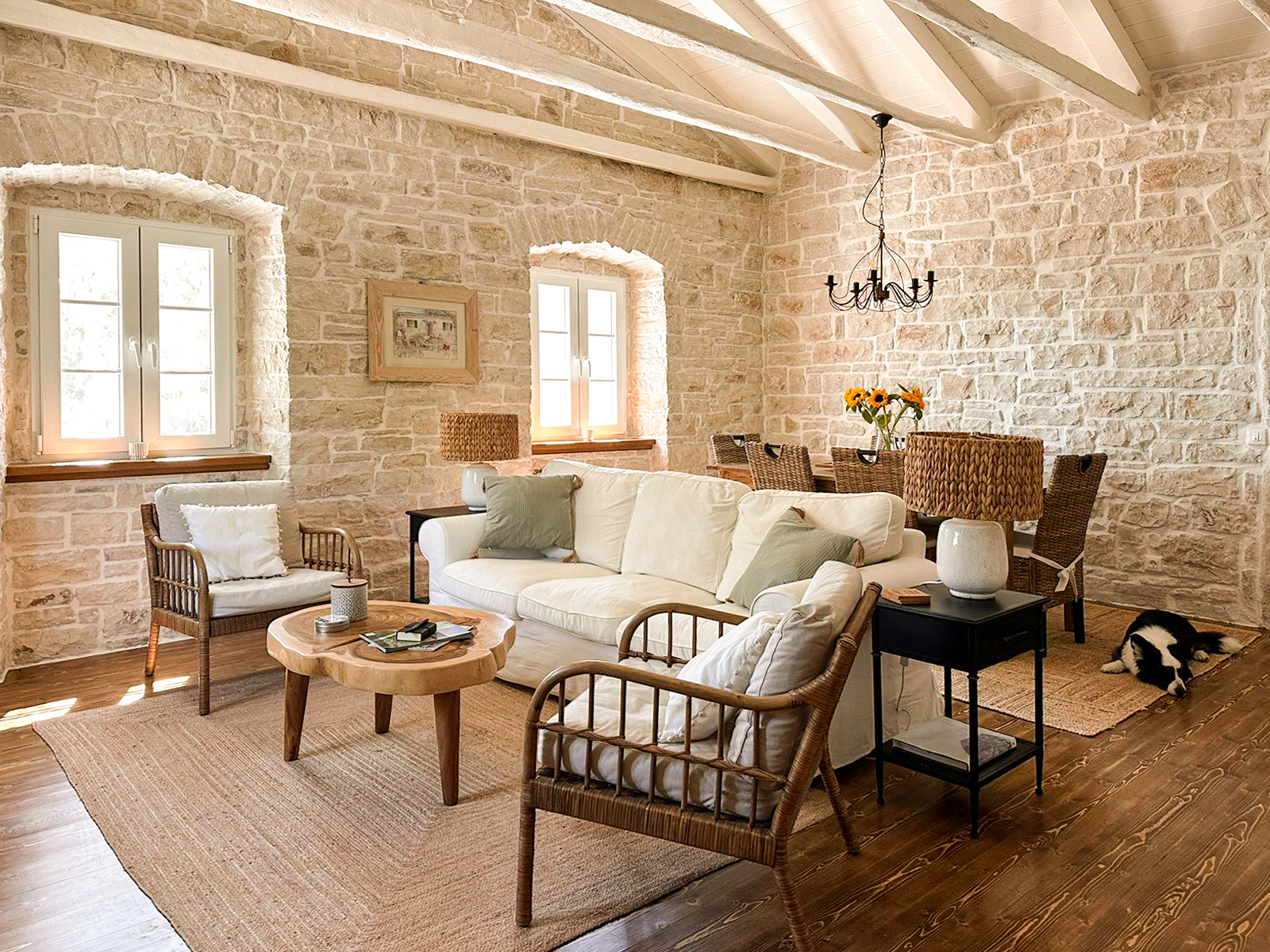 Πέτρινες καμάρες, λευκασμένες δοκοί και δάπεδα από φυσική πέτρα ή ξύλο συνθέτουν μια παλέτα ήρεμηςμοντέρνας έκφρασης, όπου η υλικότητα, το φως και η σκιά γίνονται οι πρωταγωνιστές. Παράθυρα τοποθετημένα στο κέντρο των παλαιών πέτρινων τοίχων πλαισιώνουν θέες προς το Ιόνιο, τον ελαιώνα και την πισίνα, διατηρώντας μια σταθερή σύνδεση με το τοπίο.