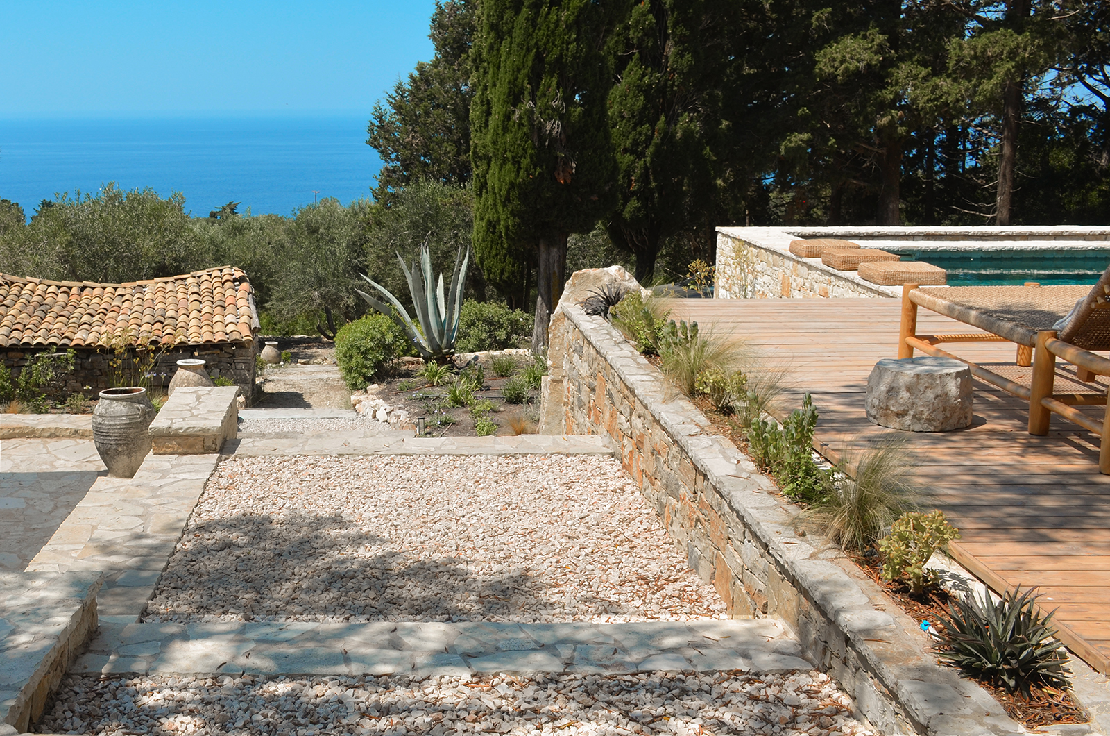 These elements form a tactile, enduring shell that anchors the residence within the timeless terrain of Paxos—an island where olive groves, dramatic cliffs, and the ever-present Ionian horizon shape both view and spirit.