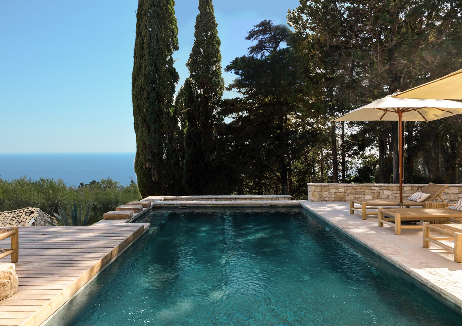 Inside, the villa’s material narrative continues with original masonry walls left exposed, carefully cleaned and repointed to reveal their layered history. Vaulted timber ceilings, whitewashed, reclaimed beams, and natural stone or timber floors establish a palette of quiet modernity—where texture, light, and shadow become architectural protagonists. Deep – set windows frame curated vistas of the Ionian Sea, olive groves, and the pool, reinforcing a constant dialogue with the landscape.