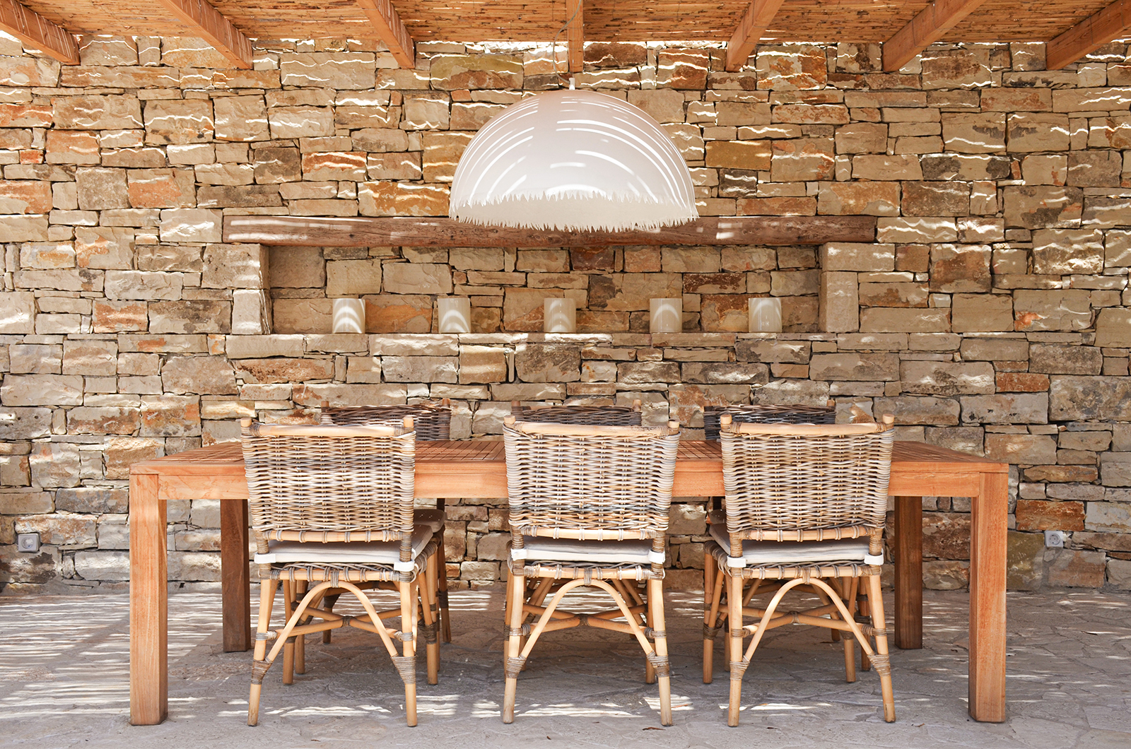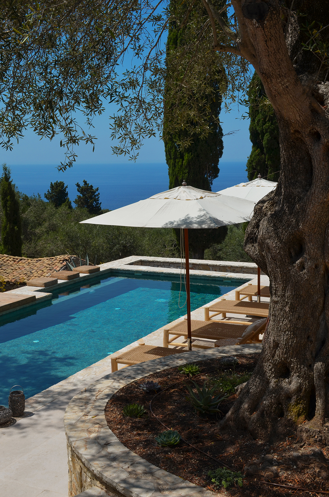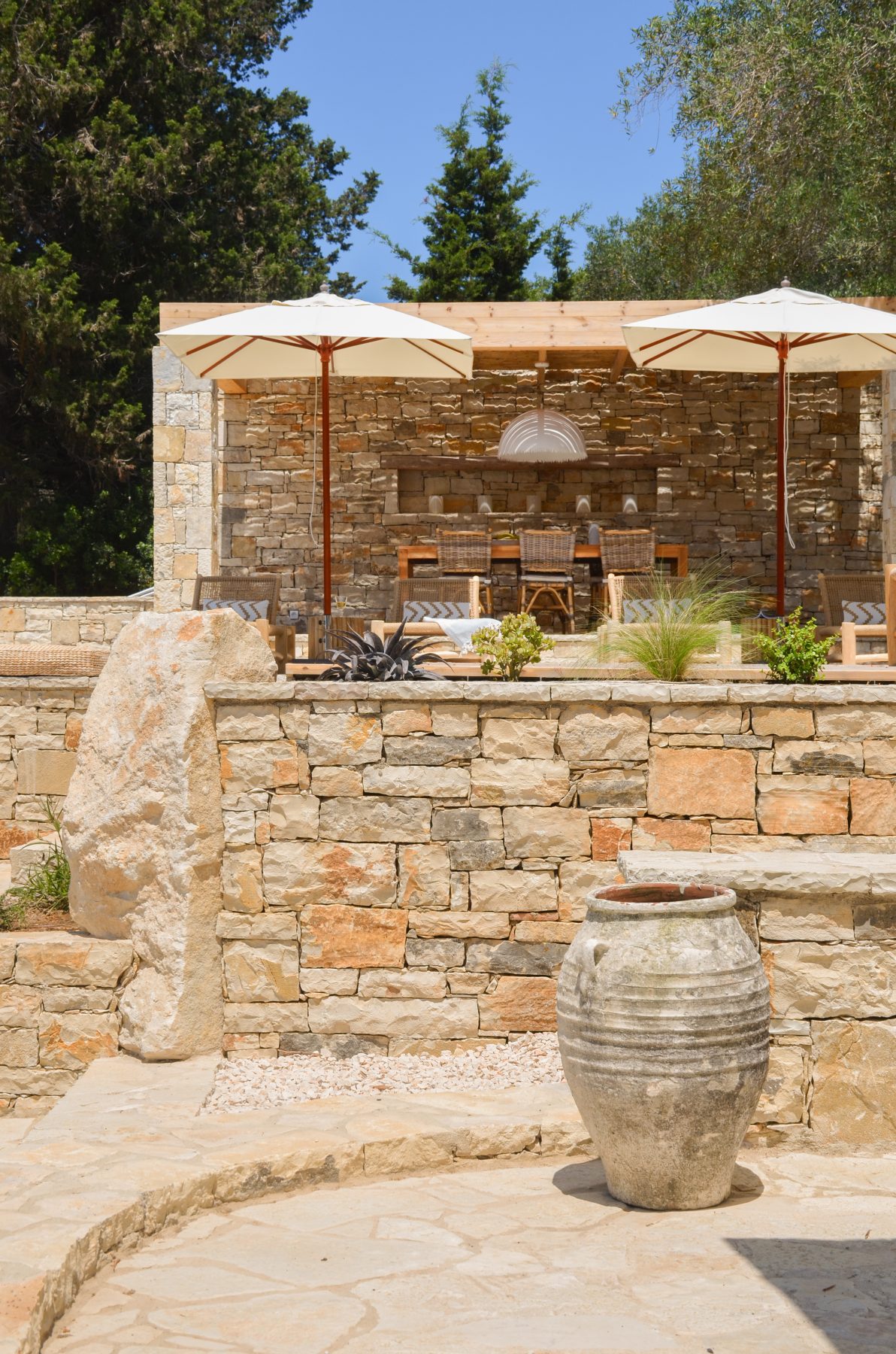 Στον εξωτερικό χώρο, η πισίνα με σμαραγδένια ψηφιδωτά —εμπνευσμένη από τις πράσινες αποχρώσεις της αγαπημένης παραλίας “Κάκη Λαγκάδα” — εκτείνεται κάθετα στο σπίτι, πλαισιωμένη από χαμηλούς πέτρινους τοίχους και αιωνόβιες ελιές που ρίχνουν διάσπαρτες σκιές.
