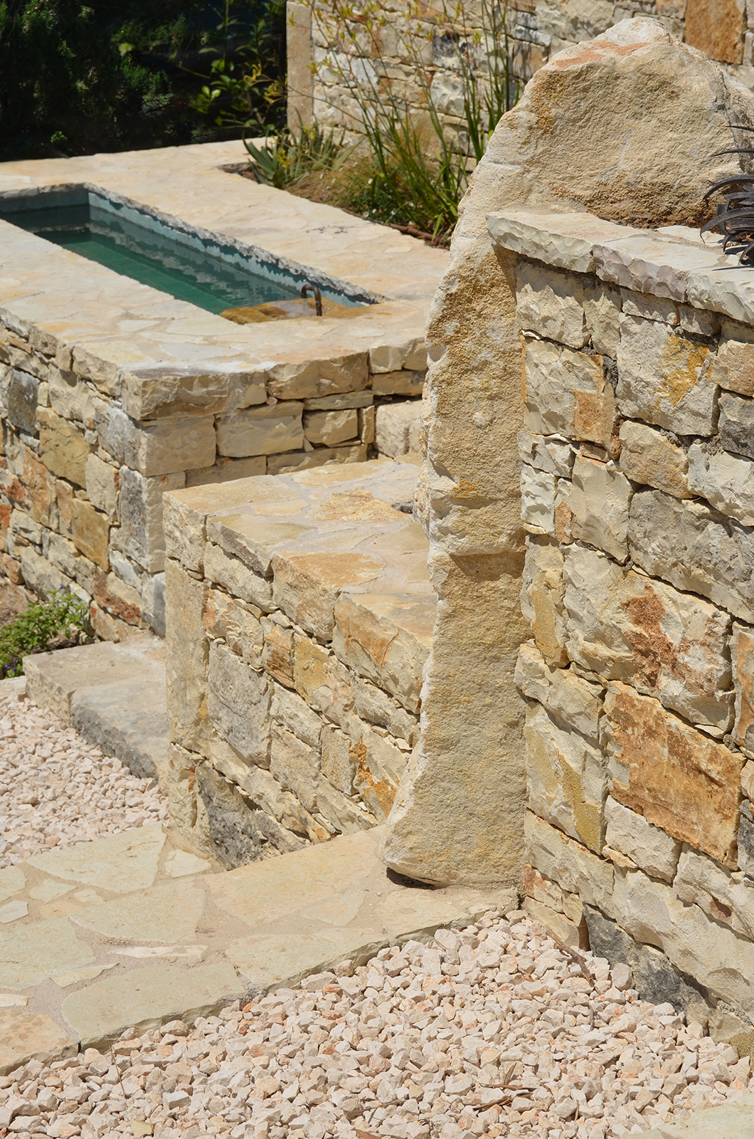 Όλες οι πέτρες της κατοικίας και των εξωτερικών διαμορφώσεων προέρχονται από τον ίδιο τον χώρο της εκσκαφής και επεξεργάστηκαν μια-μια στο χέρι.