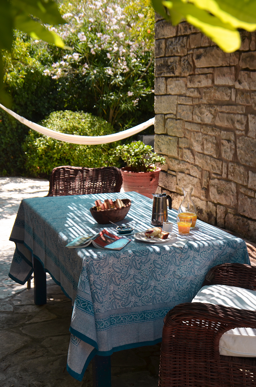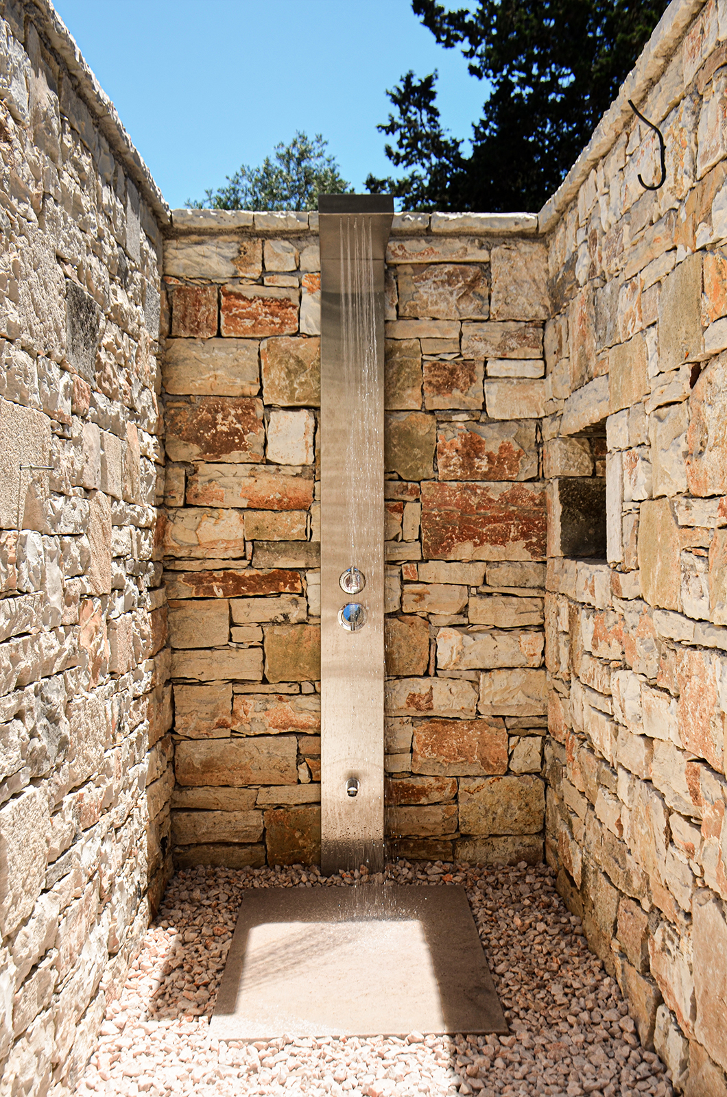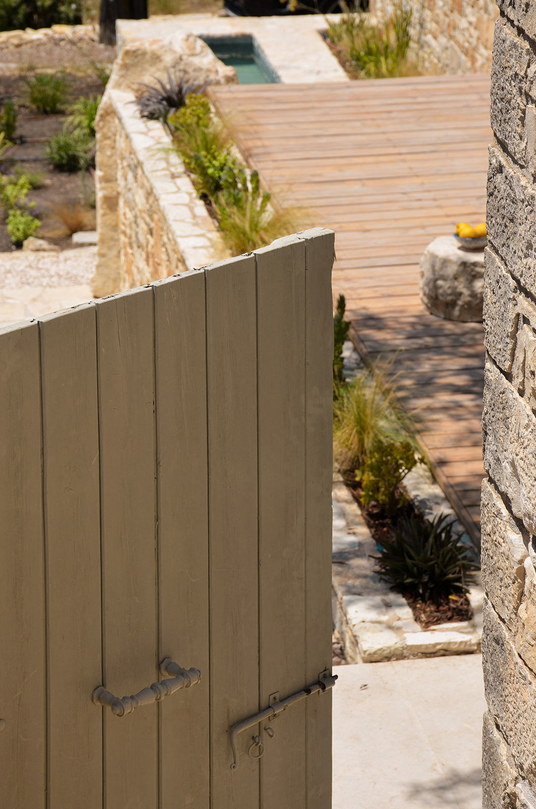 Η μακρόστενη μορφή της πισίνας αντανακλά τον κεντρικό όγκο του σπιτιού, δημιουργώντας μια σχέση ανάμεσα στο παλιό και το νέο. Χαμηλοί πέτρινοι τοίχοι και αιωνόβιες ελιές απαλύνουν το όριο του δομημένου χώρου, ενώ ξύλινα deck και λιτά έπιπλα από ρατάν και καμβά ενισχύουν την αίσθηση χαλαρής κομψότητας.
