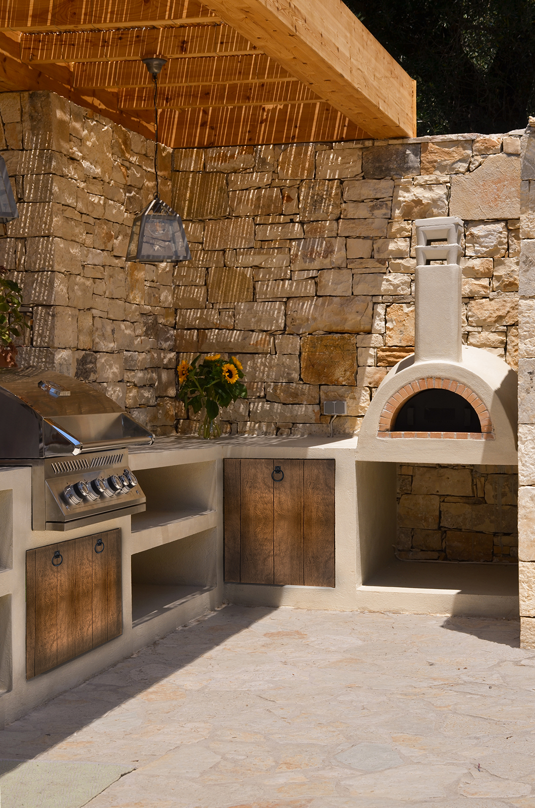 Πέτρινα σκαλοπάτια ακολουθούν την φυσική κλίση του εδάφους, οδηγώντας σε μονοπάτια και υπερυψωμένες φυτεμένες ζώνες – παχύφυτα και αγαύες – εκφράζοντας μια σχεδιαστική φιλοσοφία ριζωμένη στη βιωσιμότητα και την τοπική ευαισθησία. Η εξωτερική κουζίνα – με ξύλινα ντουλάπια και πάγκους από πατητή τσιμεντοκονία κάτω από πέργκολα από μπαμπού – επεκτείνει τη γλώσσα των υλικών του σπιτιού στον εξωτερικό χώρο. Η κουζίνα συνδέεται οπτικά και λειτουργικά με την εξωτερική τραπεζαρία, δημιουργώντας έναν ενιαίο, γήινο χώρο εξωτερικής ζωής.