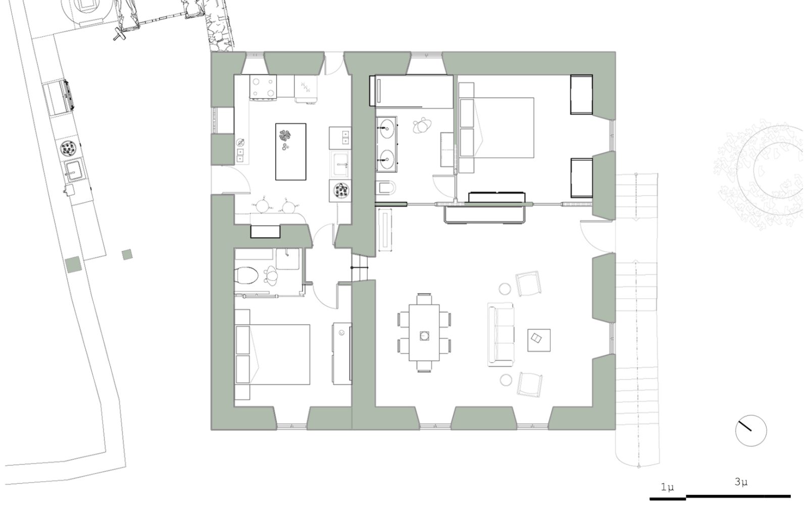 Η κάτοψη – λιτή αλλά γενναιόδωρη – οργανώνεται γύρω από τον κεντρικό, ανοιχτό χώρο καθιστικού και τραπεζαρίας. Τα υπνοδωμάτια στα άκρα εξασφαλίζουν ιδιωτικότητα, διατηρώντας ταυτόχρονα οπτική συνέχεια με τον εξωτερικό χώρο. Η κουζίνα, ελαφρώς υποχωρημένη, ισορροπεί μεταξύ λειτουργικότητας και ανοιχτότητας. Η κυκλοφορία ακολουθεί γραμμικά τους παλιούς τοίχους, σεβόμενη το ιστορικό αποτύπωμα.