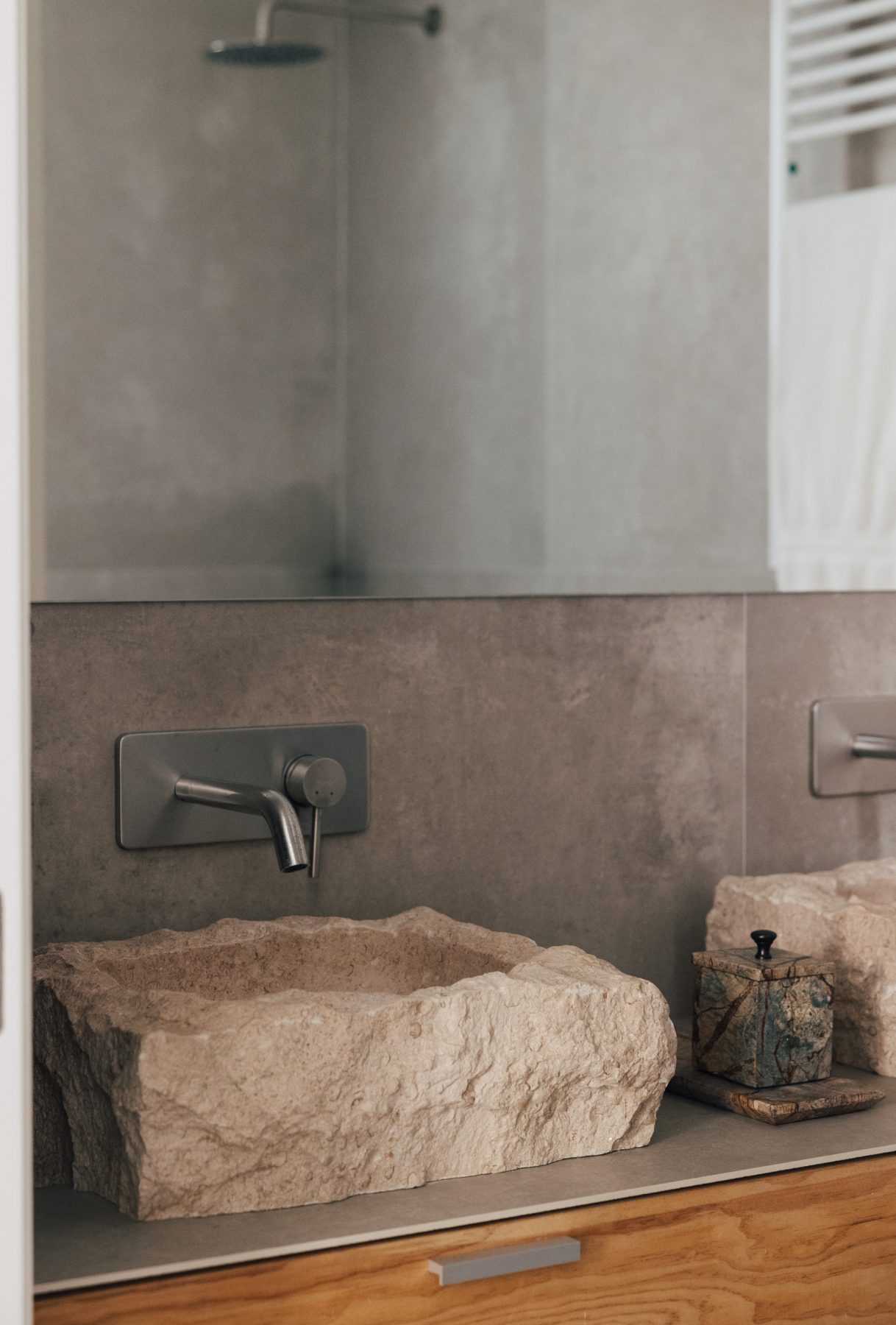 Materiality balances contemporary finishes with reclaimed elements, including interior doors and stone washbasins sourced from demolition sites and carefully restored to align with the couple’s aesthetic sensibility while ensuring durability.