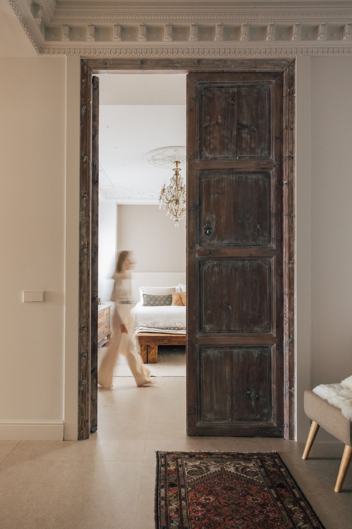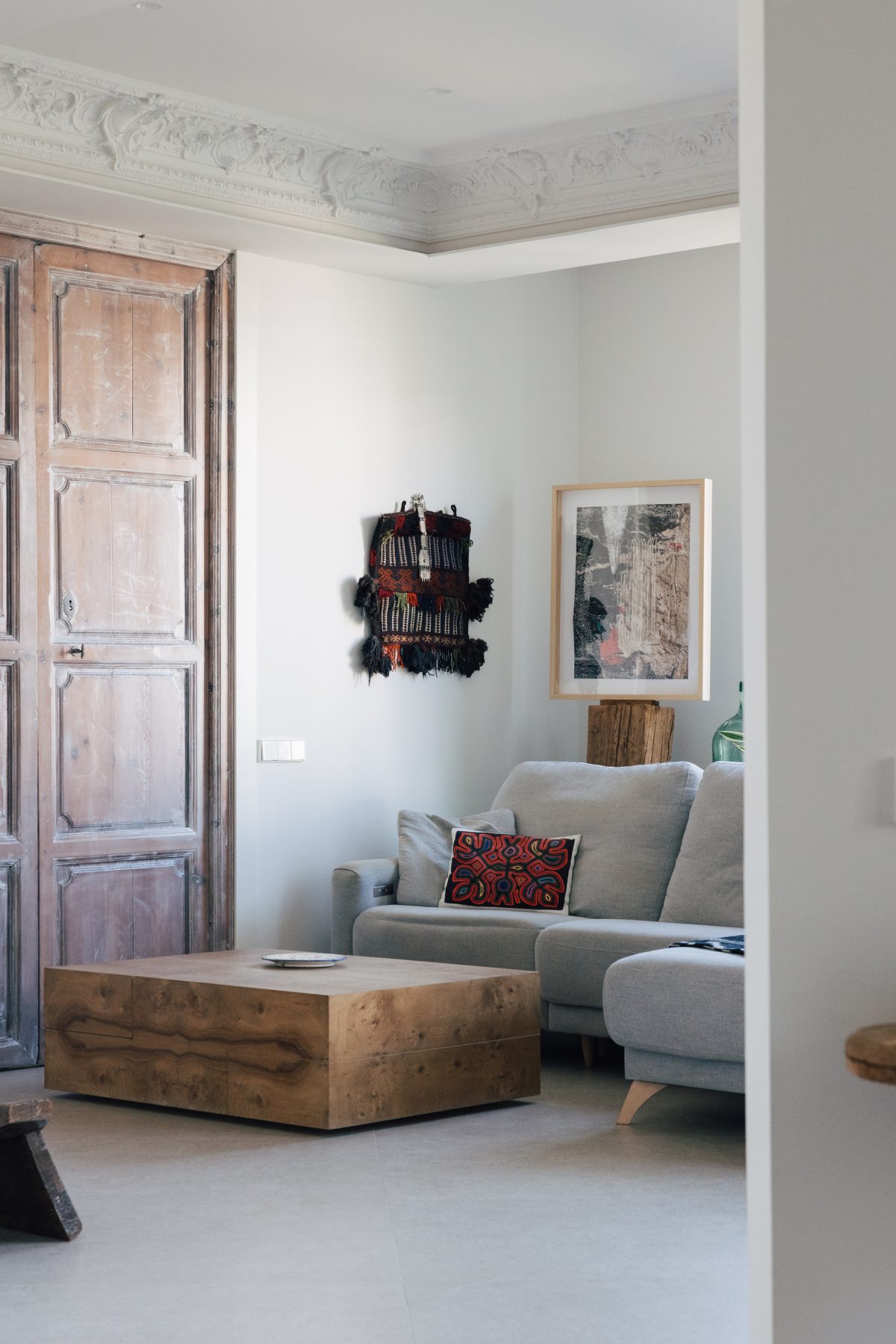 Emma Sepúlveda and her husband moved to Valencia to be closer to their son, choosing to anchor their new life in a Gran Vía apartment shaped by the rhythms of Mediterranean living. The renovation brief was precise: recover the full height of the ceilings, preserve or reinterpret the original moldings, and establish a sequence of open, continuous spaces reminiscent of their American homes, while maintaining a visual dialogue with the tree-lined boulevard below.