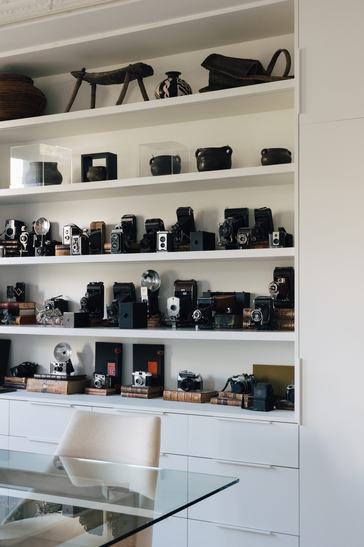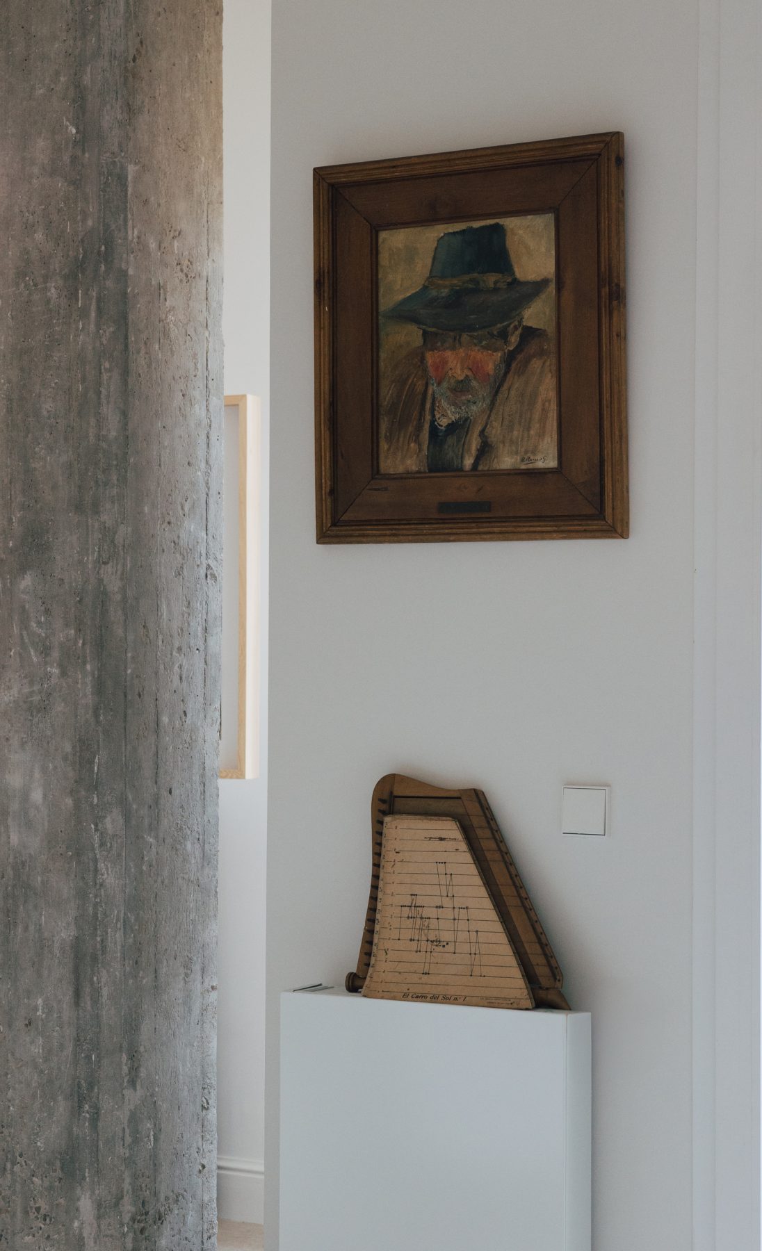 Particular attention was given to the integration of workspaces within the domestic environment. An open studio area, defined by a custom display unit for photography equipment, sits adjacent to the living zones, allowing creative activity to remain visually connected to daily life. Two reclaimed doors, carefully selected and restored by HOMU Arquitectos, mark the threshold to Sepúlveda’s private studio.