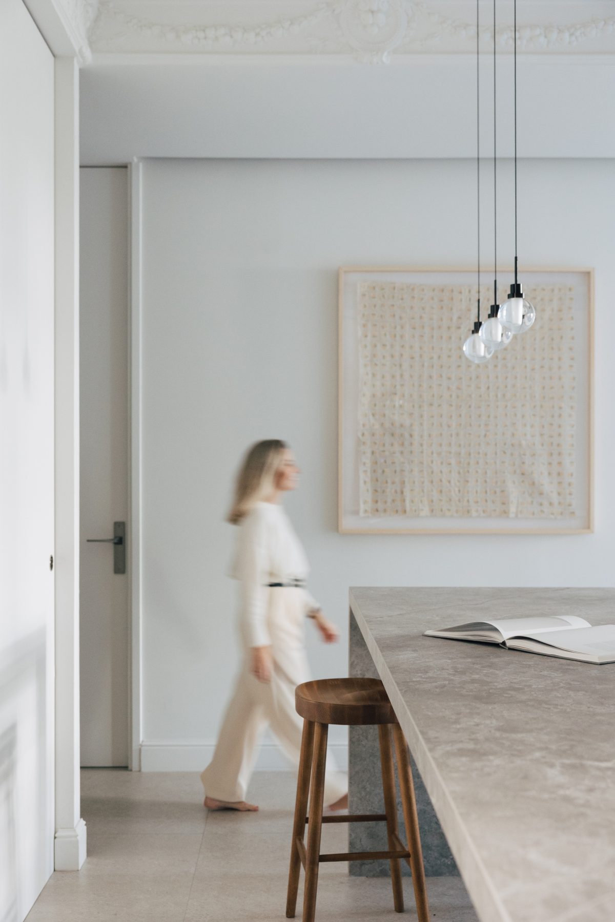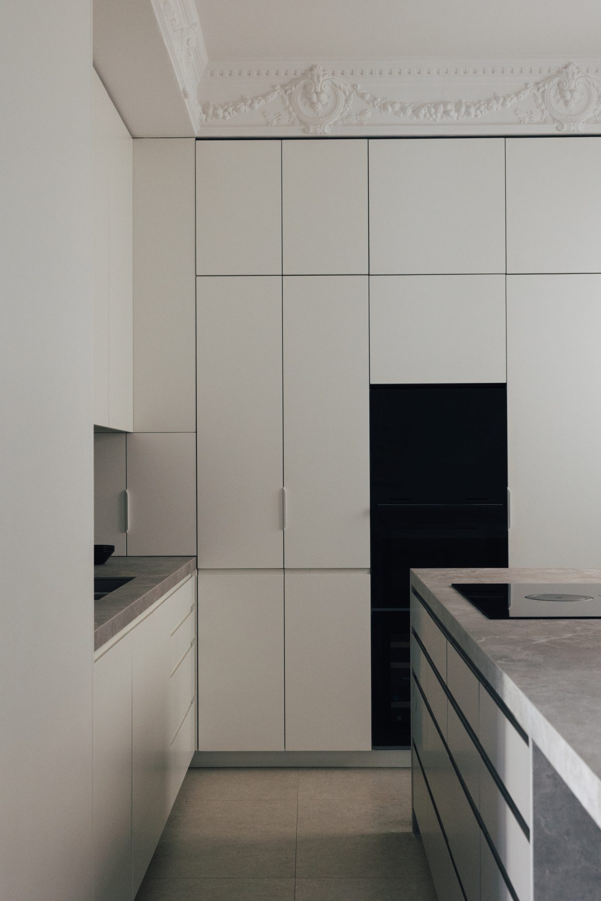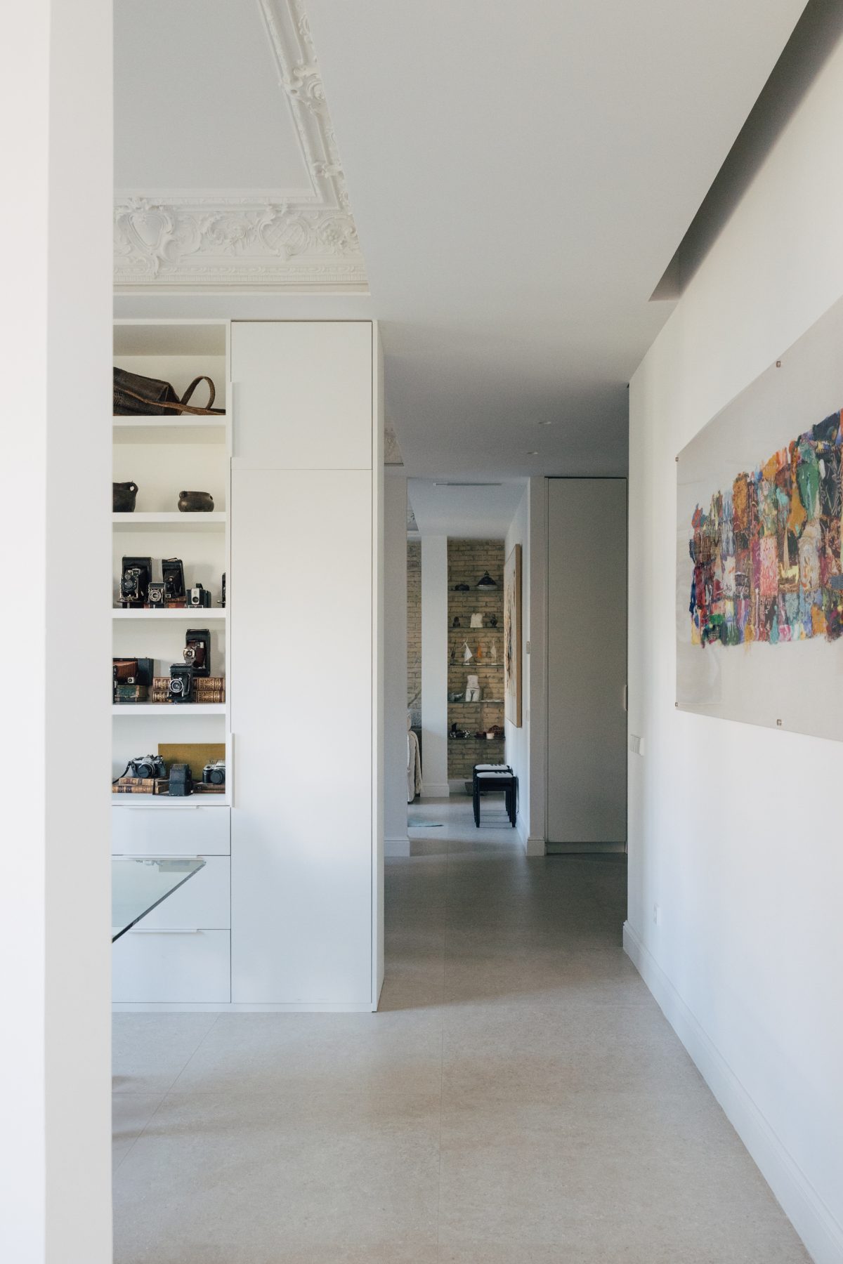 The interior language aligns with what the architects describe as a “minimalism with soul and purpose.” A restrained palette of whites, greys and ash tones evokes the neutrality of a blank page, allowing artworks, photographs and personal objects gathered across decades to emerge naturally within the space. Although the original moldings could not be preserved due to the installation of a new HVAC system, the intervention allowed for increased ceiling height and the introduction of larger, contemporary moldings proportioned to the renewed volumes and integrated into the bespoke carpentry. A continuous ash-grey porcelain floor runs throughout the apartment, enhancing spatial continuity and visual calm.