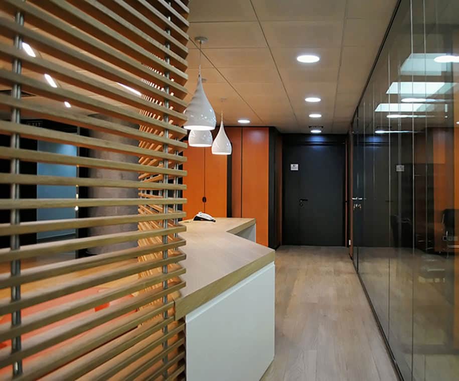 Our concept was focused on making the space brighter, full of light, and to provide visibility to the surrounding environment from almost anywhere inside. We used frameless double glass separators, to replace the wooden panels between the private offices and the common central space, in order to separate spaces and synchronously provide acoustical privacy. At the same time roller blinds that are hidden in the ceiling close remotely in each office to provide an extra visual privacy when necessary.