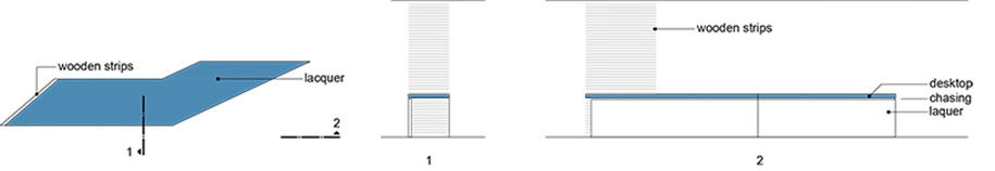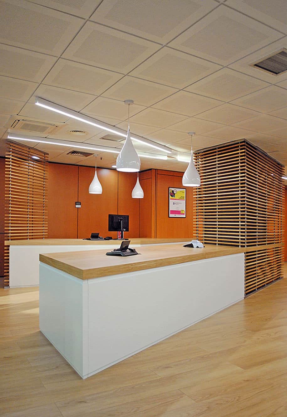 Τα γραφεία της γραμματείας του ενιαίου χώρου σχεδιάστηκαν ως μεμονωμένες νησίδες. Η θέση και η μορφή τους καθορίστηκε από τους άξονες κίνησης προς τα κλειστά γραφεία των στελεχών και από τα στατικά στοιχεία του κτιρίου, τα οποία ενσωματώθηκαν σε αυτές. Η διάταξη των φωτιστικών της ψευδοροφής ενίσχυσε την λογική των αξόνων κίνησης. Σε κάθε νησίδα ενσωματώθηκαν ξύλινες περσίδες σαν ένα ημιπερατό διαχωριστικό, δημιουργώντας μια ζεστή ατμόσφαιρα.