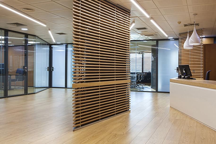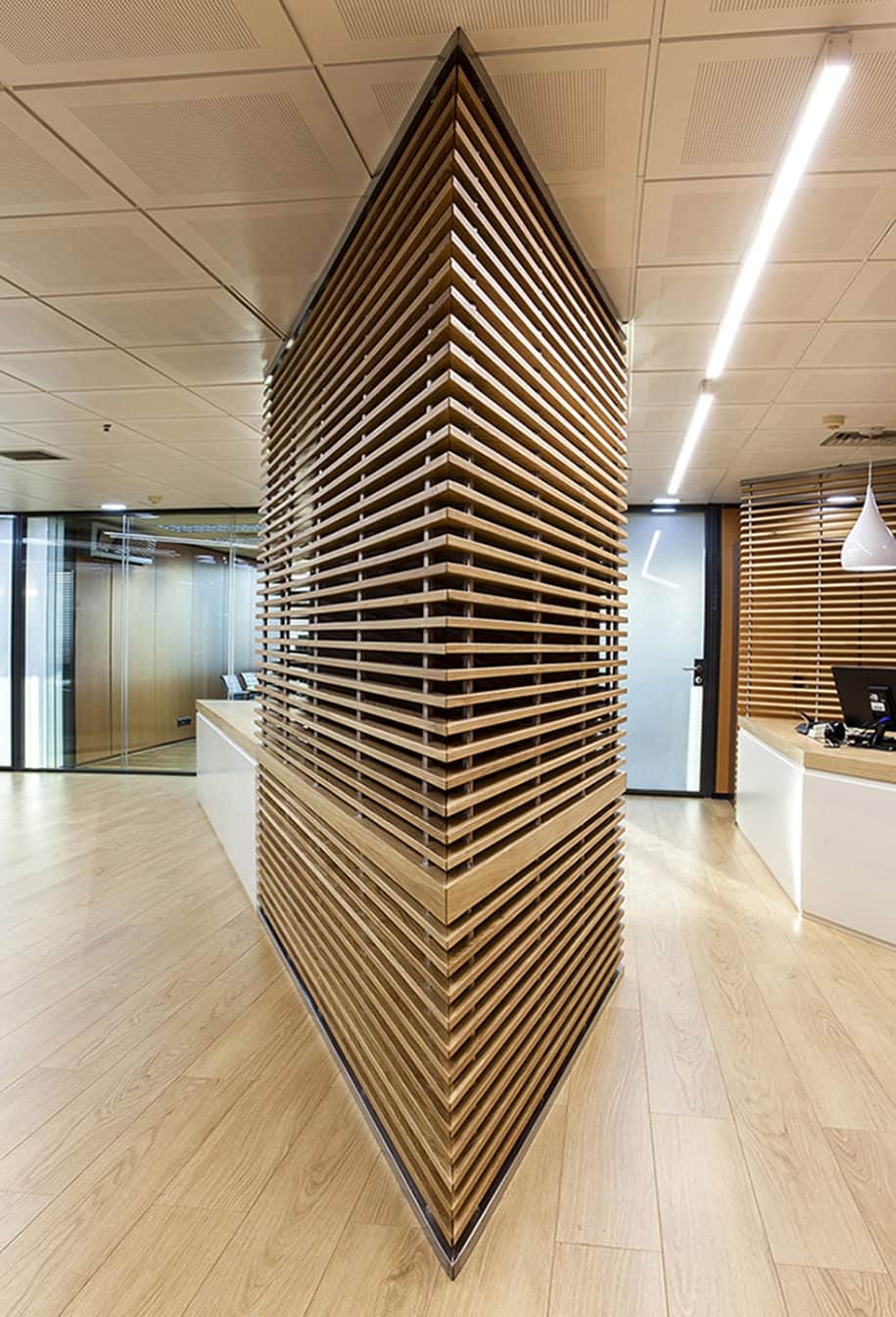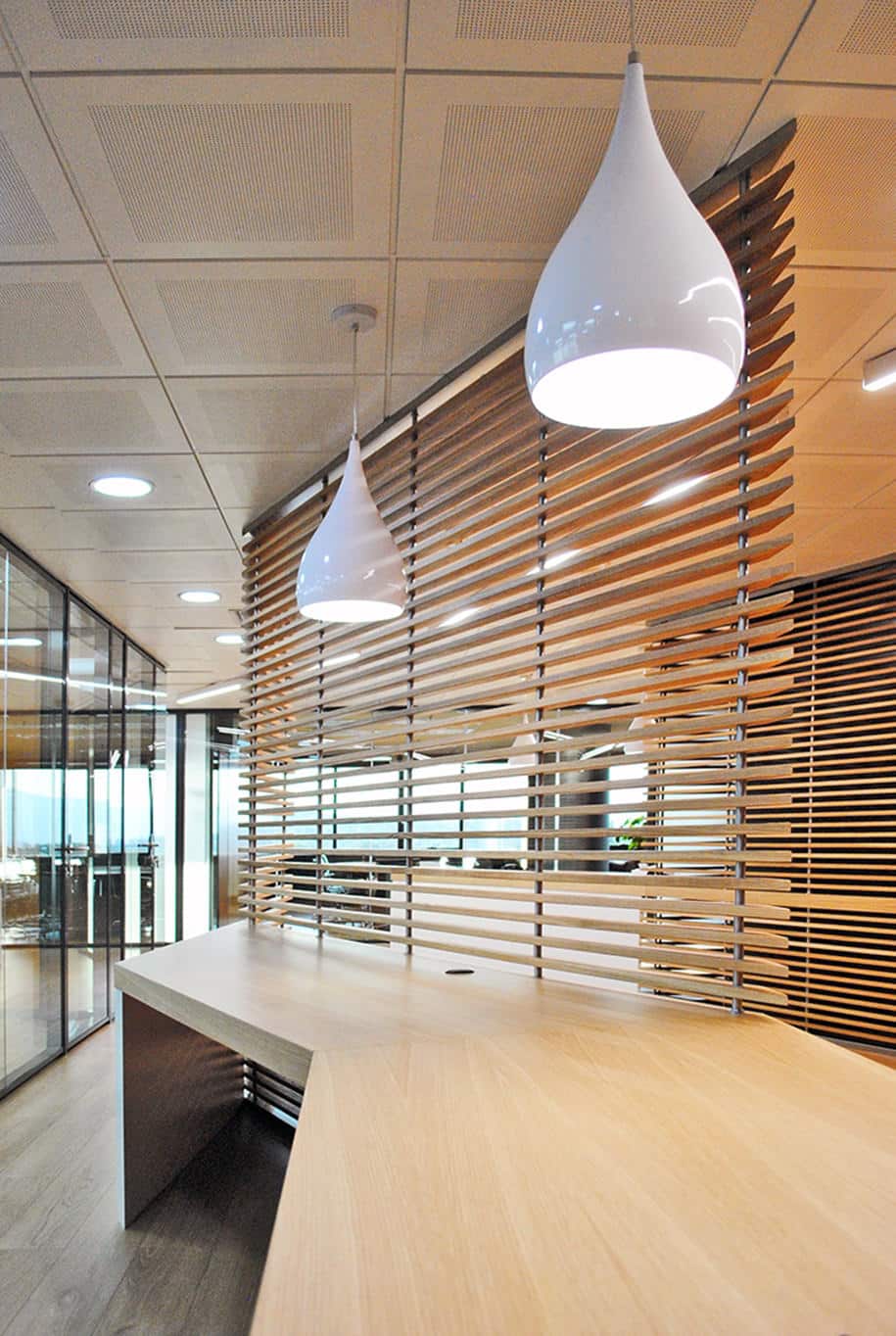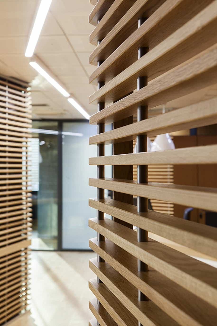 The secretarial desks were arranged in the open-plan space as free standing islands. The axes of movement toward the private offices shaped these islands while integrating the existing structural columns to the design. The arrangement of lights in the ceiling reinforced the aforementioned idea. The wooden louvres became another visual separator between the islands to give a sense of privacy while creating a warmer environment.