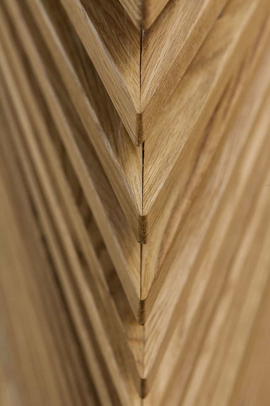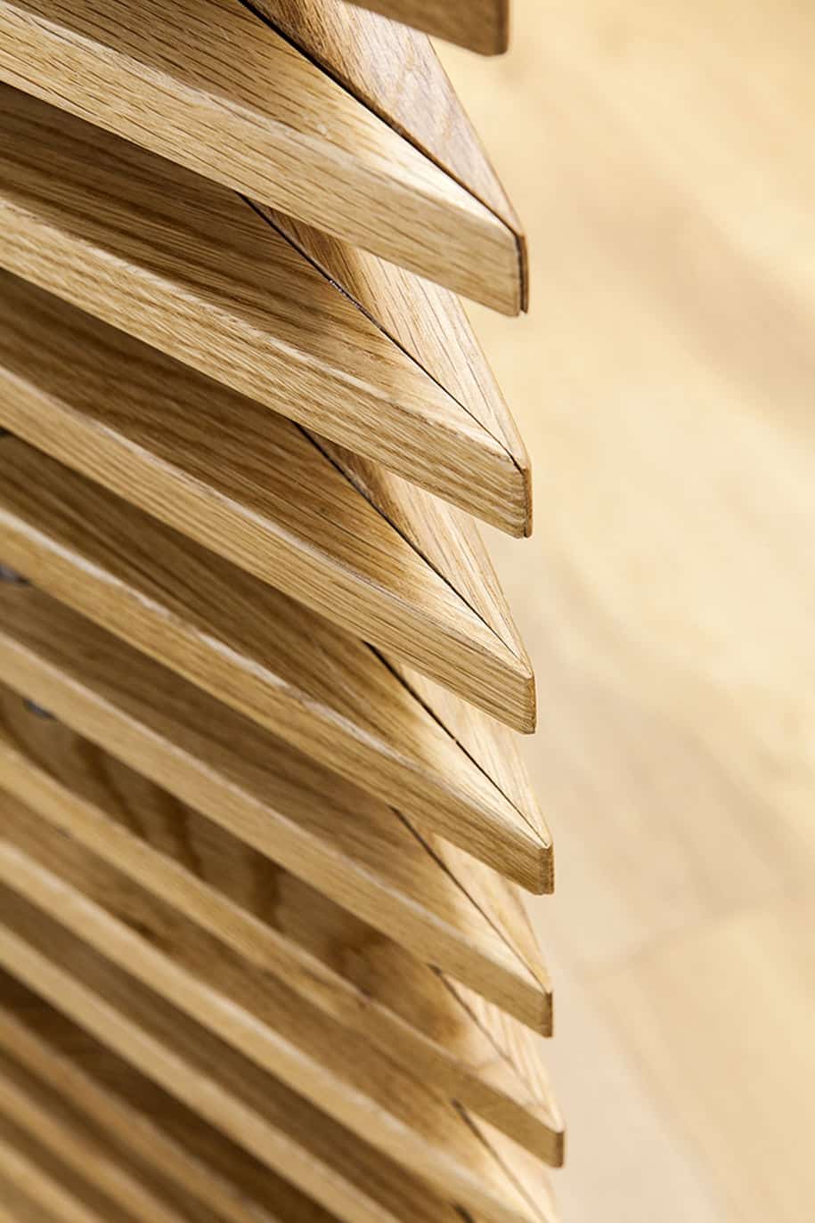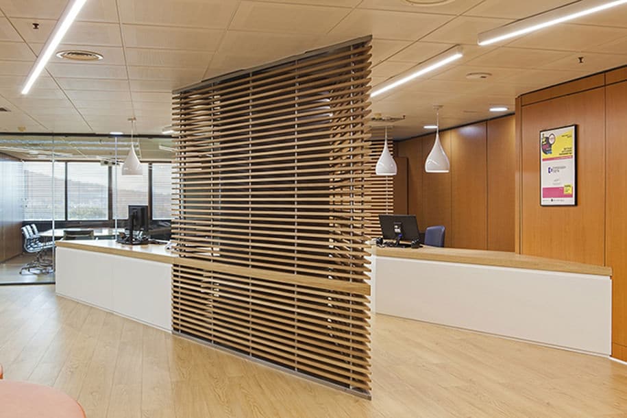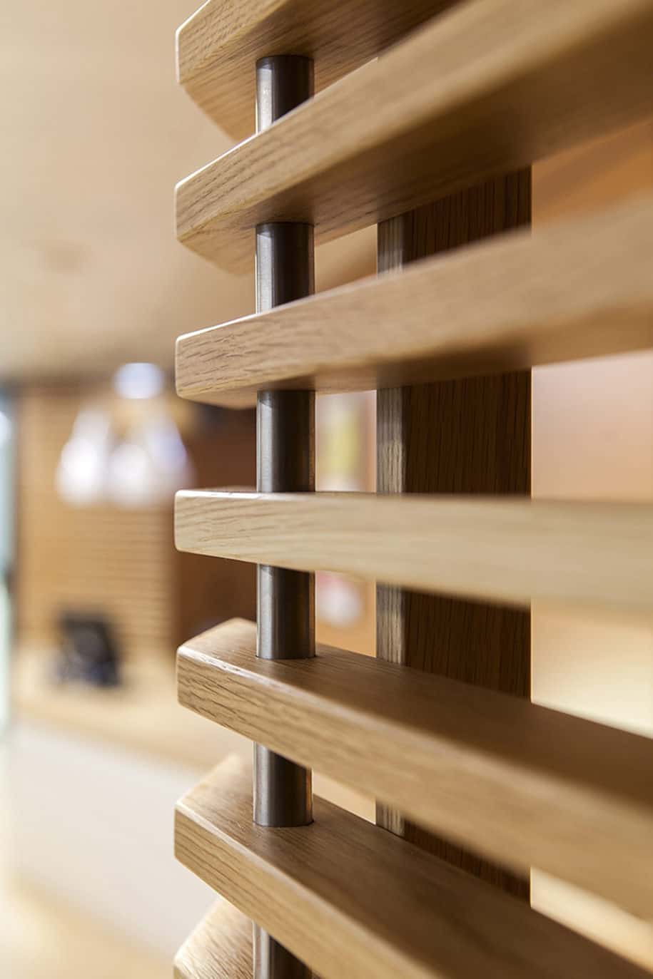 The secretarial desks were arranged in the open-plan space as free standing islands. The axes of movement toward the private offices shaped these islands while integrating the existing structural columns to the design. The arrangement of lights in the ceiling reinforced the aforementioned idea. The wooden louvres became another visual separator between the islands to give a sense of privacy while creating a warmer environment.
