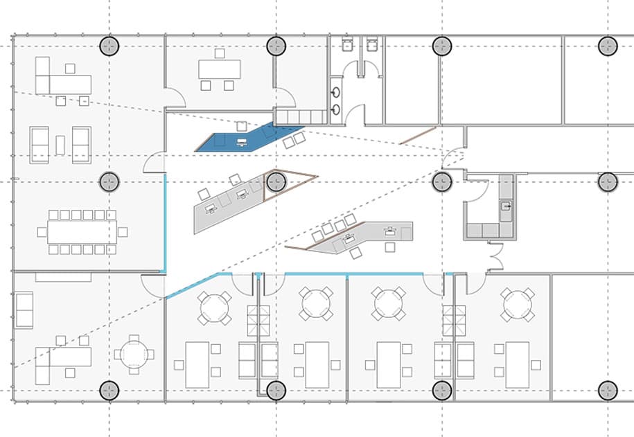 All private offices for the executives were arranged in the perimeter, alongside the glass facades of the building, leaving a significant common area in the middle. This central space is substantial to the office operation because it functions as the reception area for visitors and hosts all open-plan secretarial desks.
