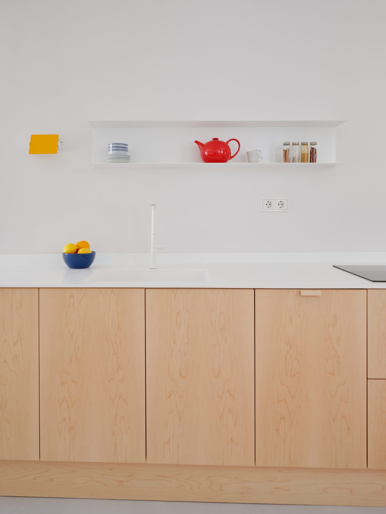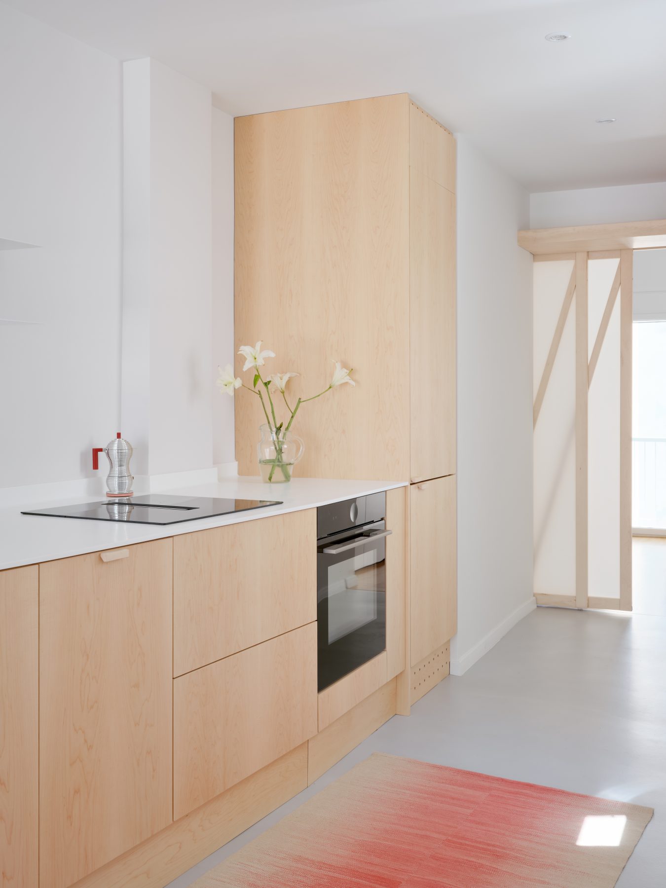 Setting aside her signature colorful aesthetics, Scalise designed this bright new home based on a palette of whites, concrete gray and maple wood as a manifestation to serenity.