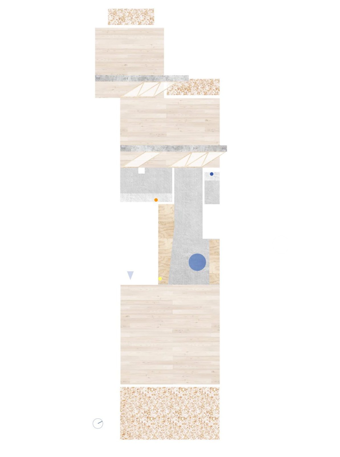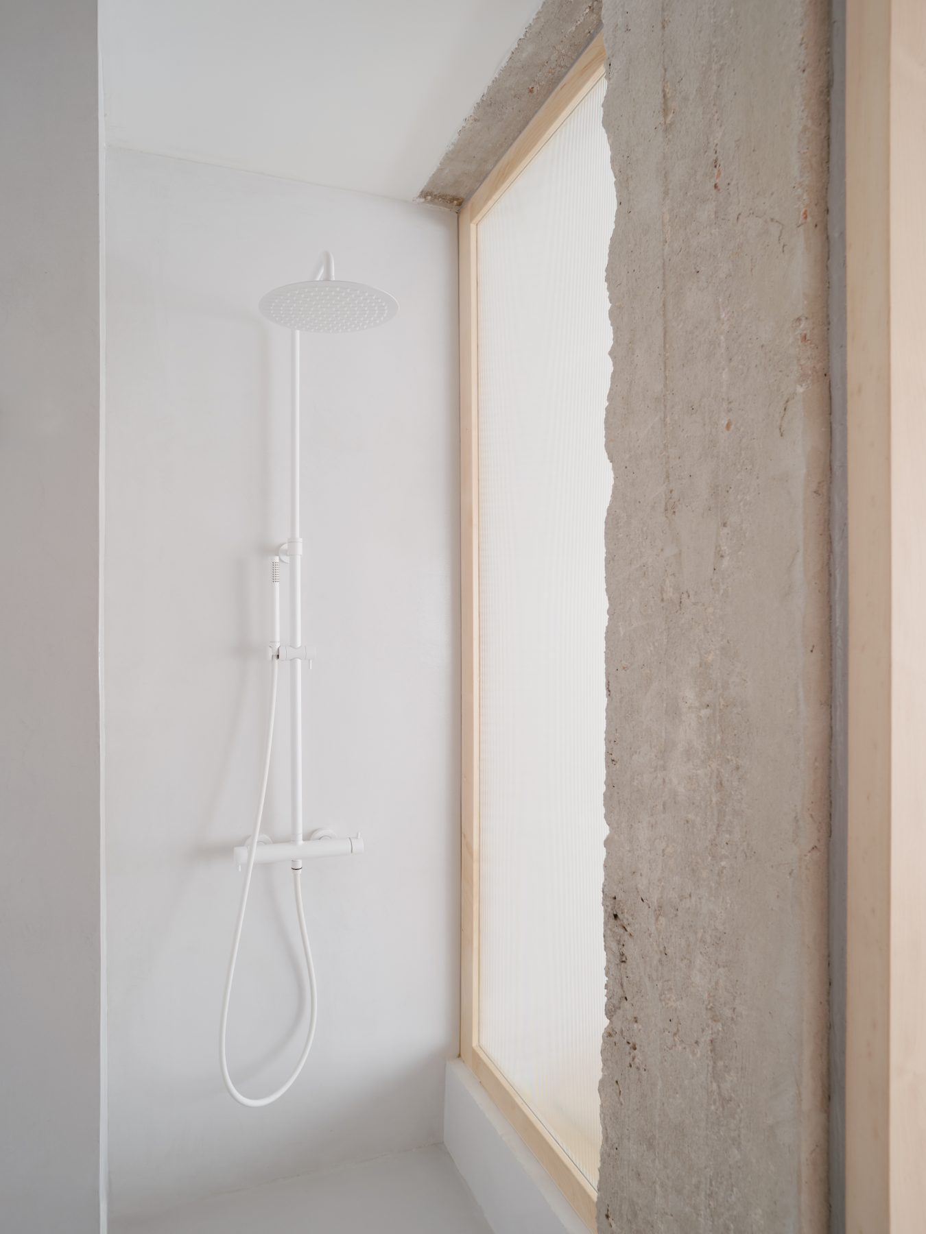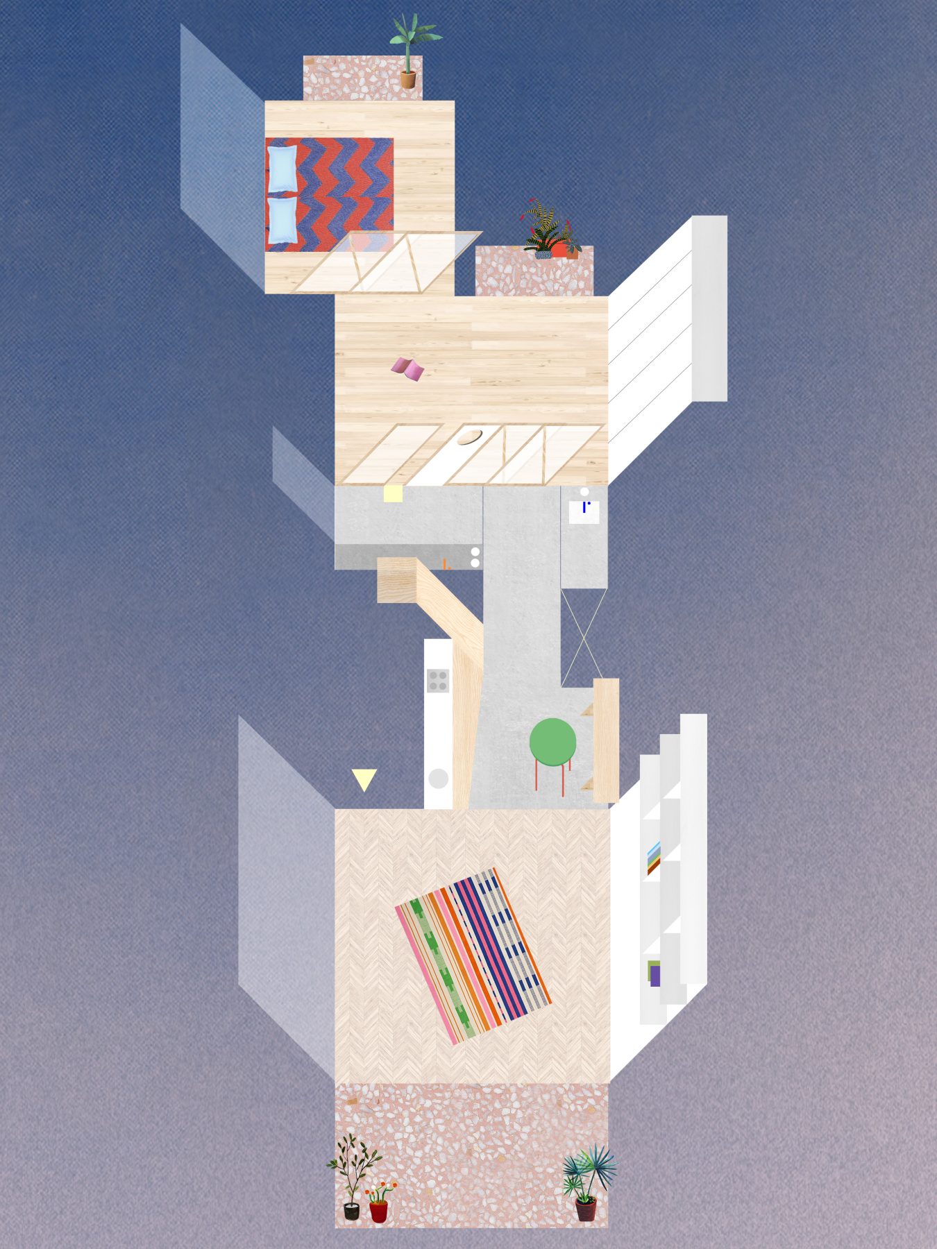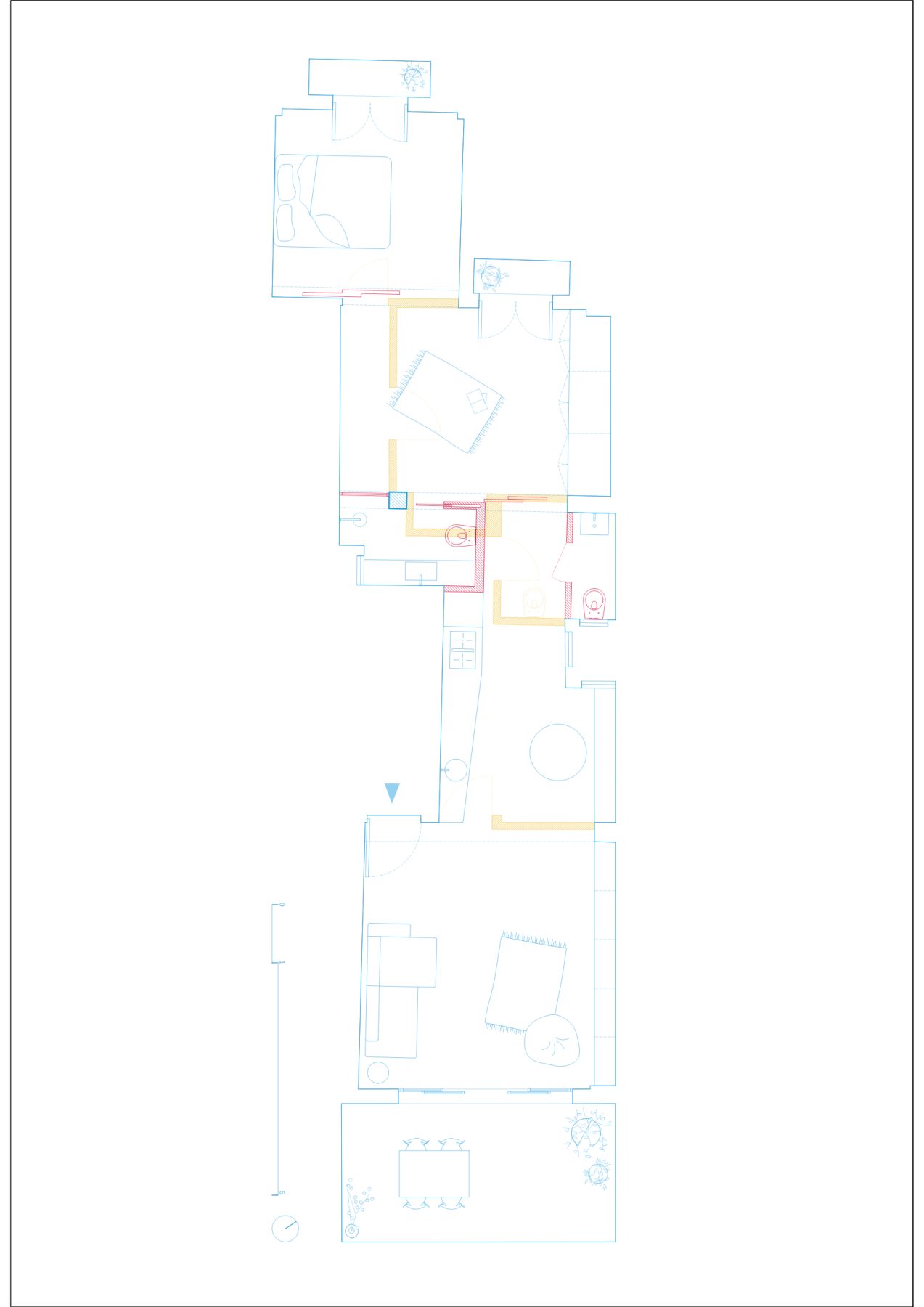 Upon entering, a spacious living-room with a library, in close connection with the kitchen and the balcony, offers opportunity for socializing, reading, cooking, chatting and all the above combined. A luminous play-room for gatherings with friends and family. The second half of the house shelters the private world of the residents featuring a peaceful bedroom with a balcony, a multipurpose room left open to possibility, and two different bathrooms; the main one and a guest WC.