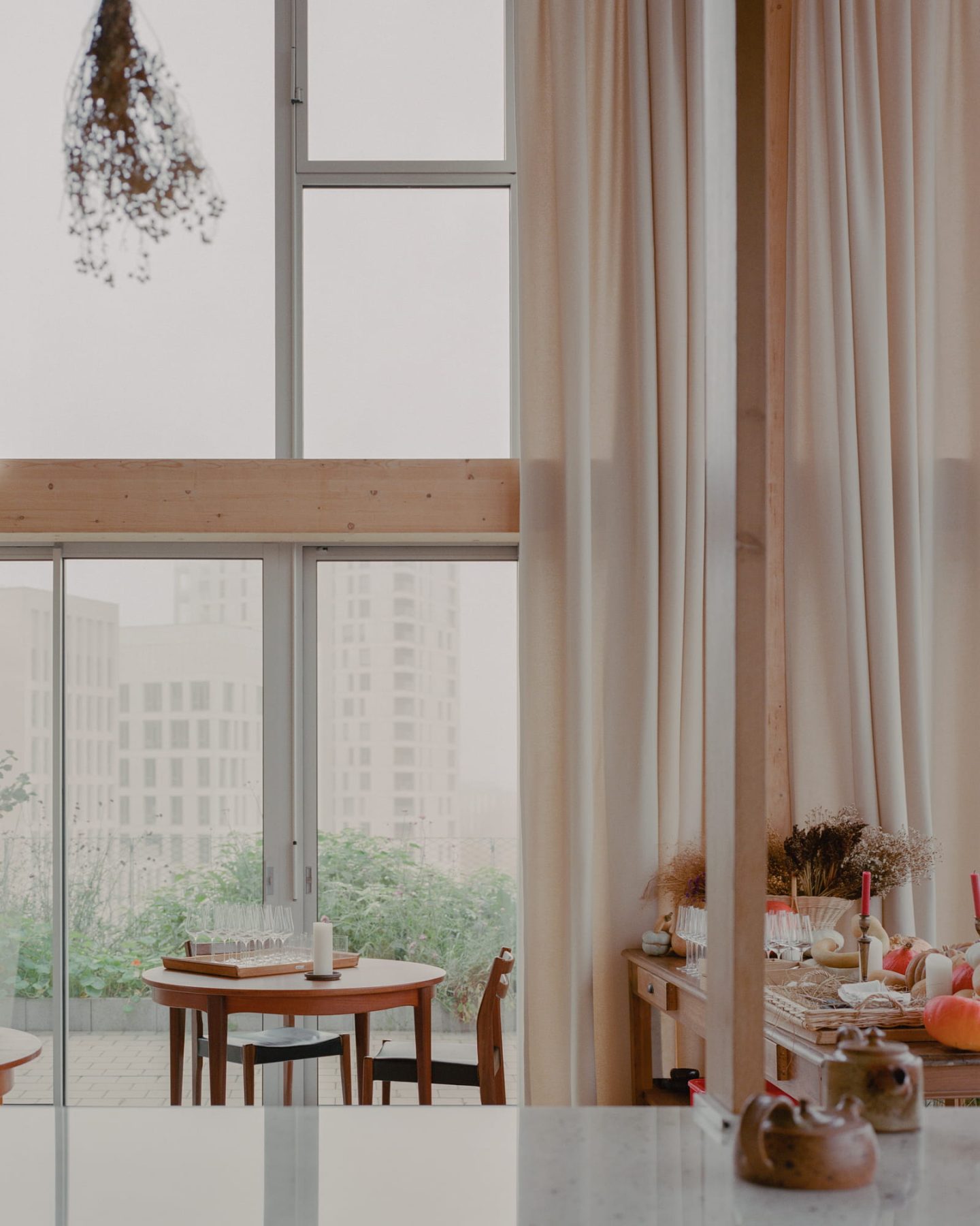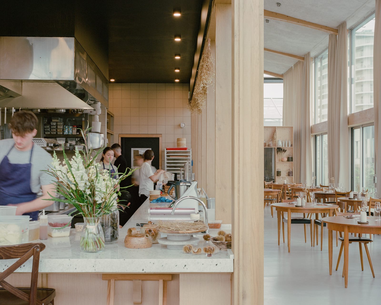 Freia, a restaurant designed by RAUM and located on the upper floor of a parking structure in the center of Nantes, France, is conceived as a glass volume that opens the interior to wide views of the city, blends the garden with the indoor space, and creates an open, fluid spatial experience.