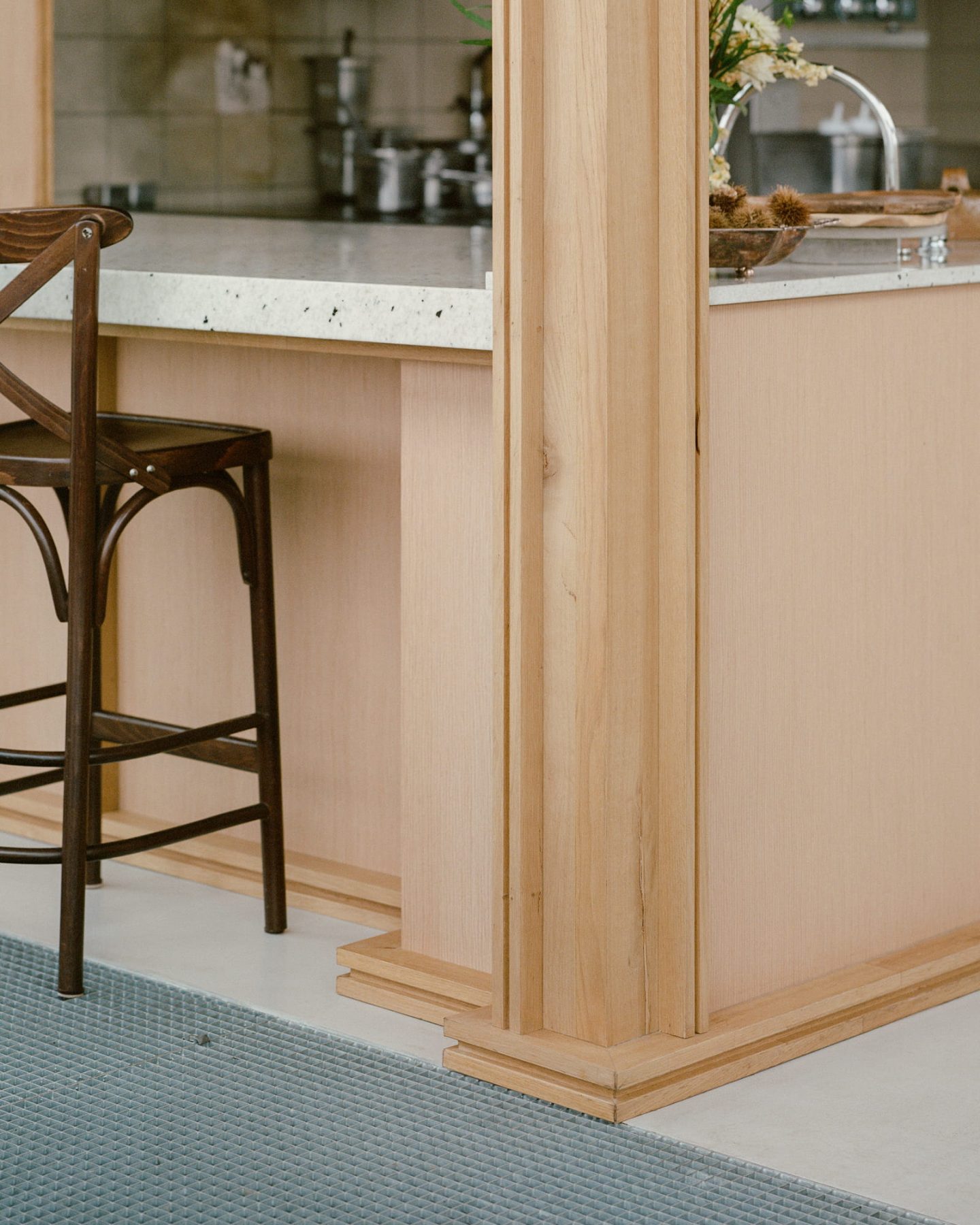 In keeping with the blurring of boundaries, the kitchen is largely open to the dining room, fitting under a large oak mezzanine, which also hides all the technical elements, leaving room for a large open space.