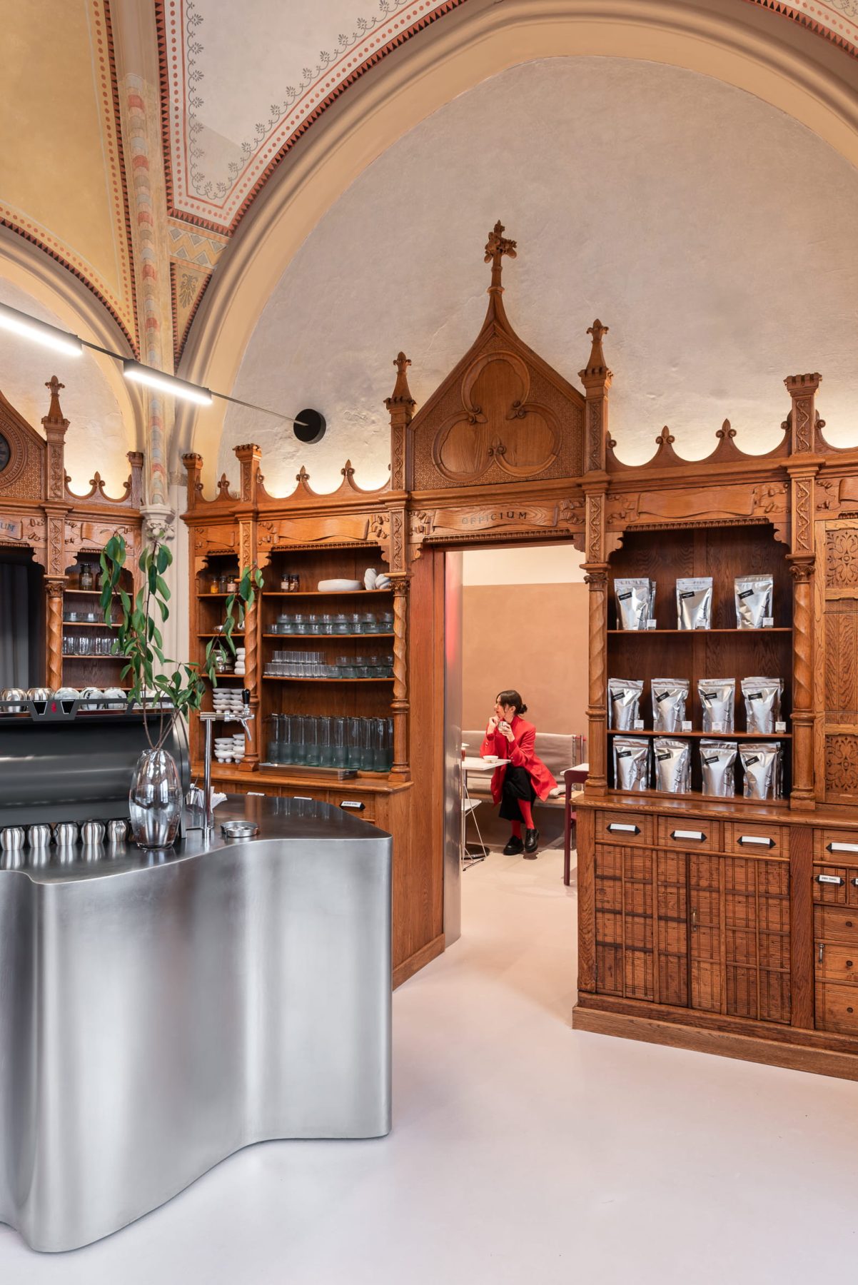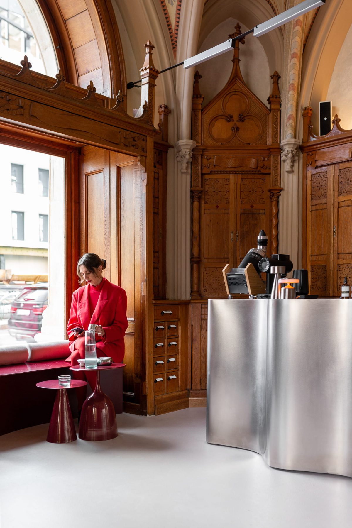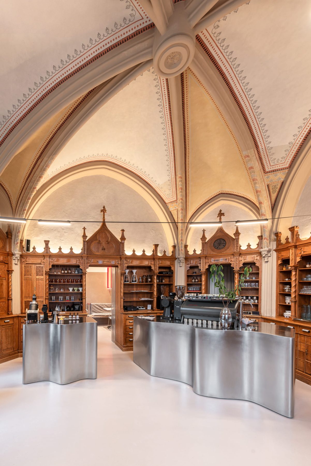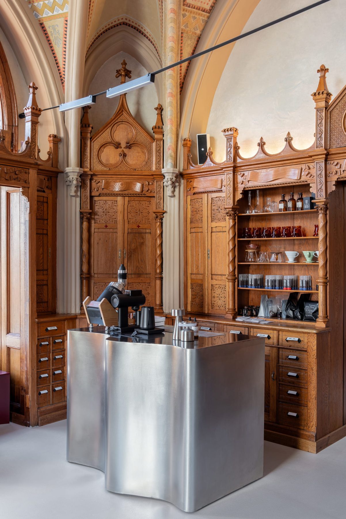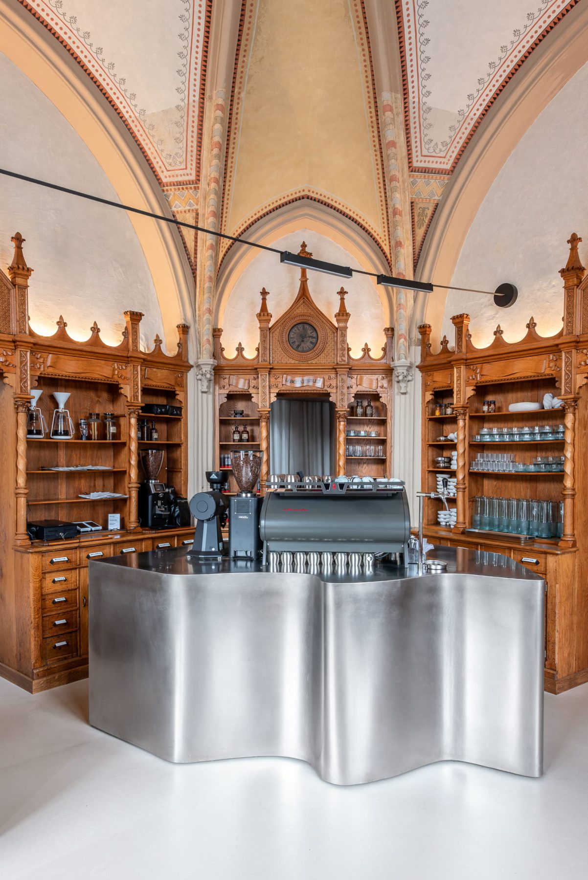 Curved stainless-steel coffee bars function as sculptural inserts, reflecting natural light filtered through the ogival arched windows, while contemporary lighting and modular furnishings establish contrast without visual competition.