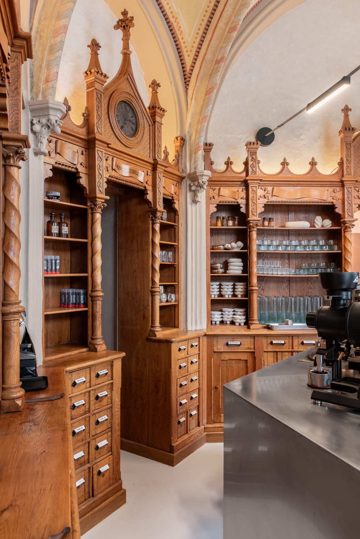 Emerging from the memory of a historic pharmacy in Cluj-Napoca, Romania, Laboratorium is reimagined as a contemporary specialty coffee shop. EktraArhitectura led architectural and restoration coordination, ensuring the neo-Gothic structure’s integrity, while Fain Design shaped the interior, contrasting ornate woodwork with brushed metal, fluid forms, and minimalist surfaces. Together, they orchestrate a poetic dialogue between heritage and modernity, reactivating the historic space with subtle, expressive elegance.